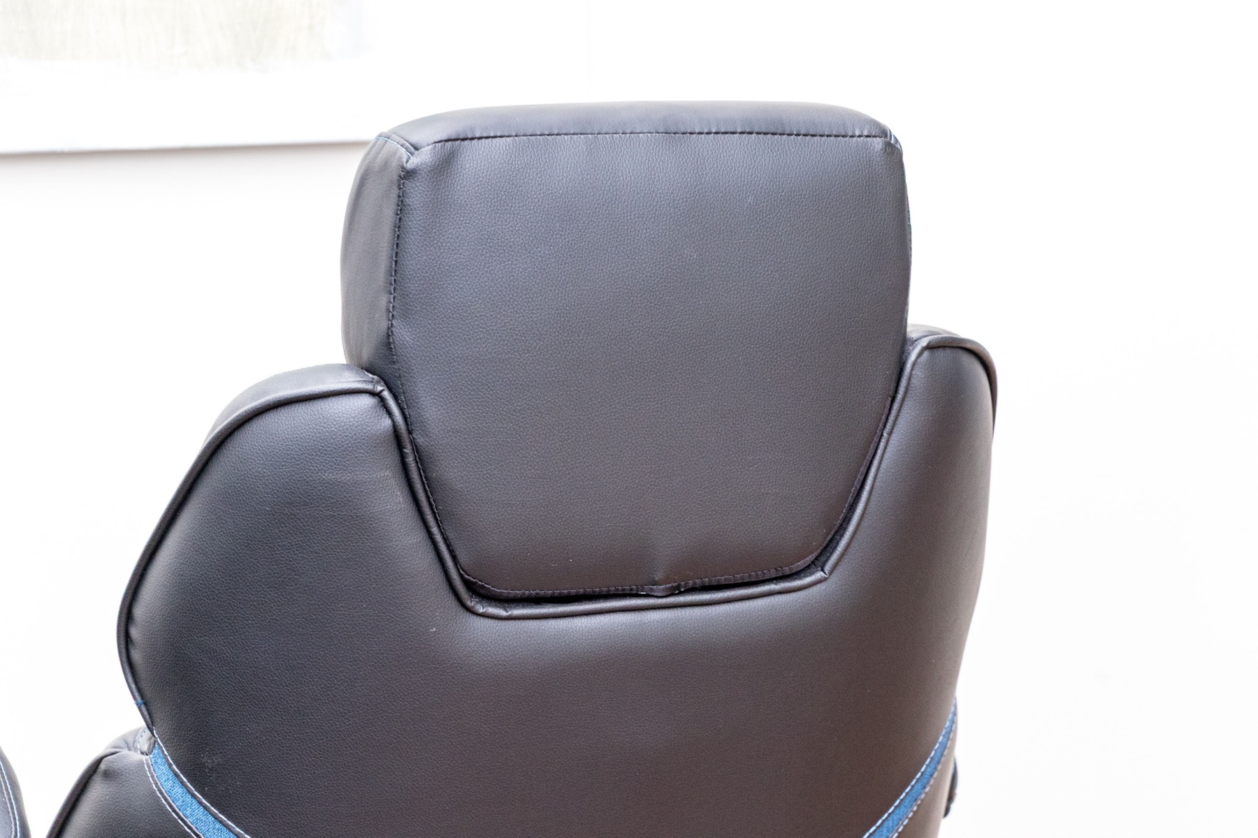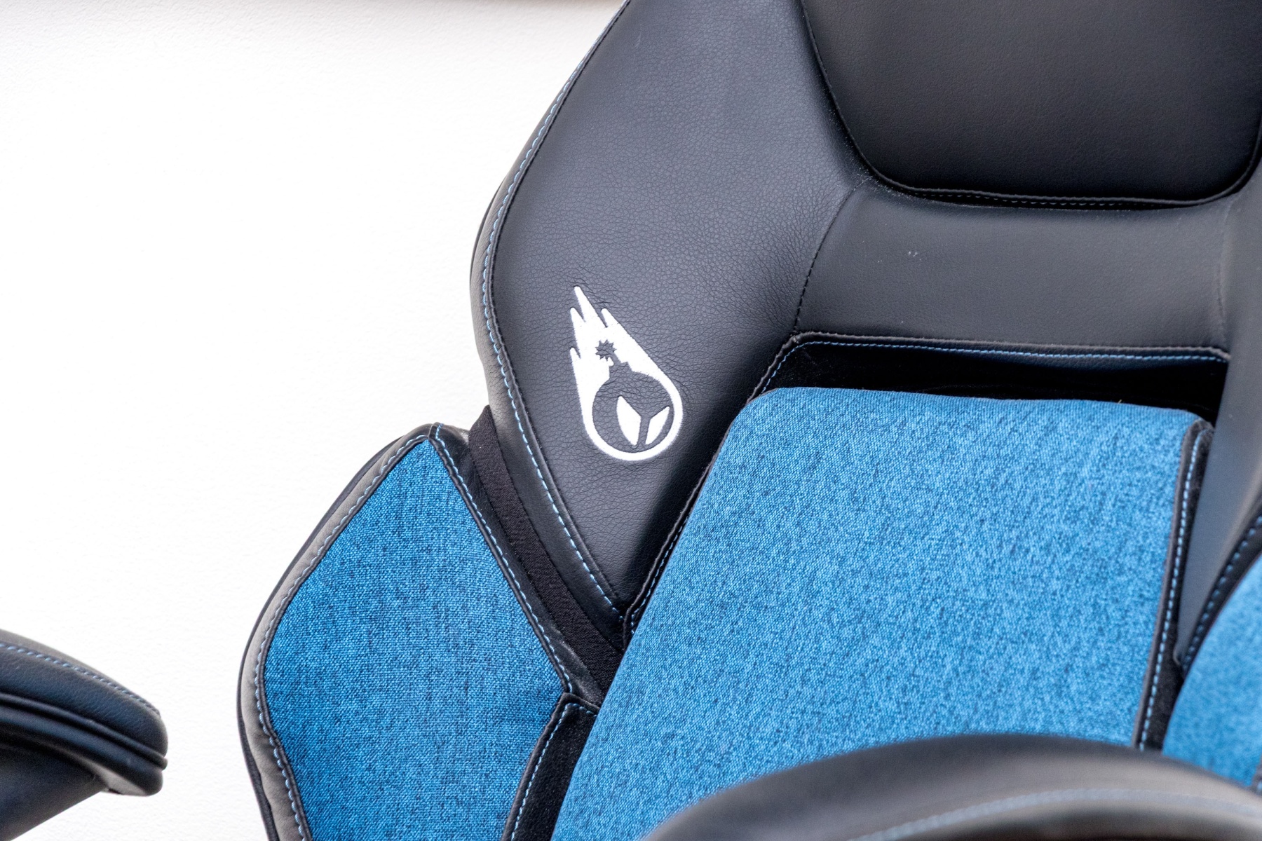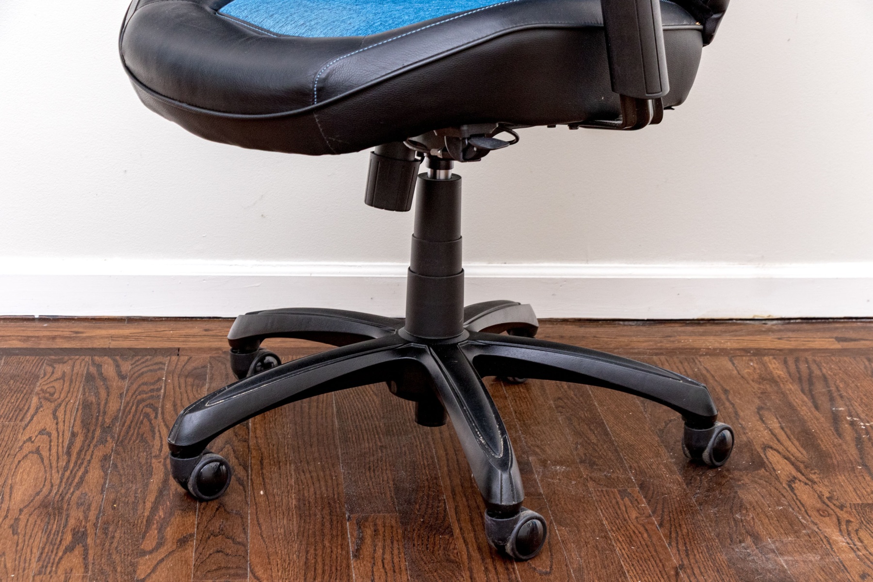 A stylish DPS 3D Insight gaming chair in black and blue, raised on five spokes with casters and adjustable height pedestal with adjustable seat and arms.