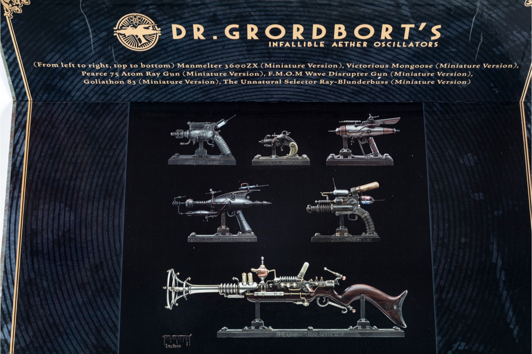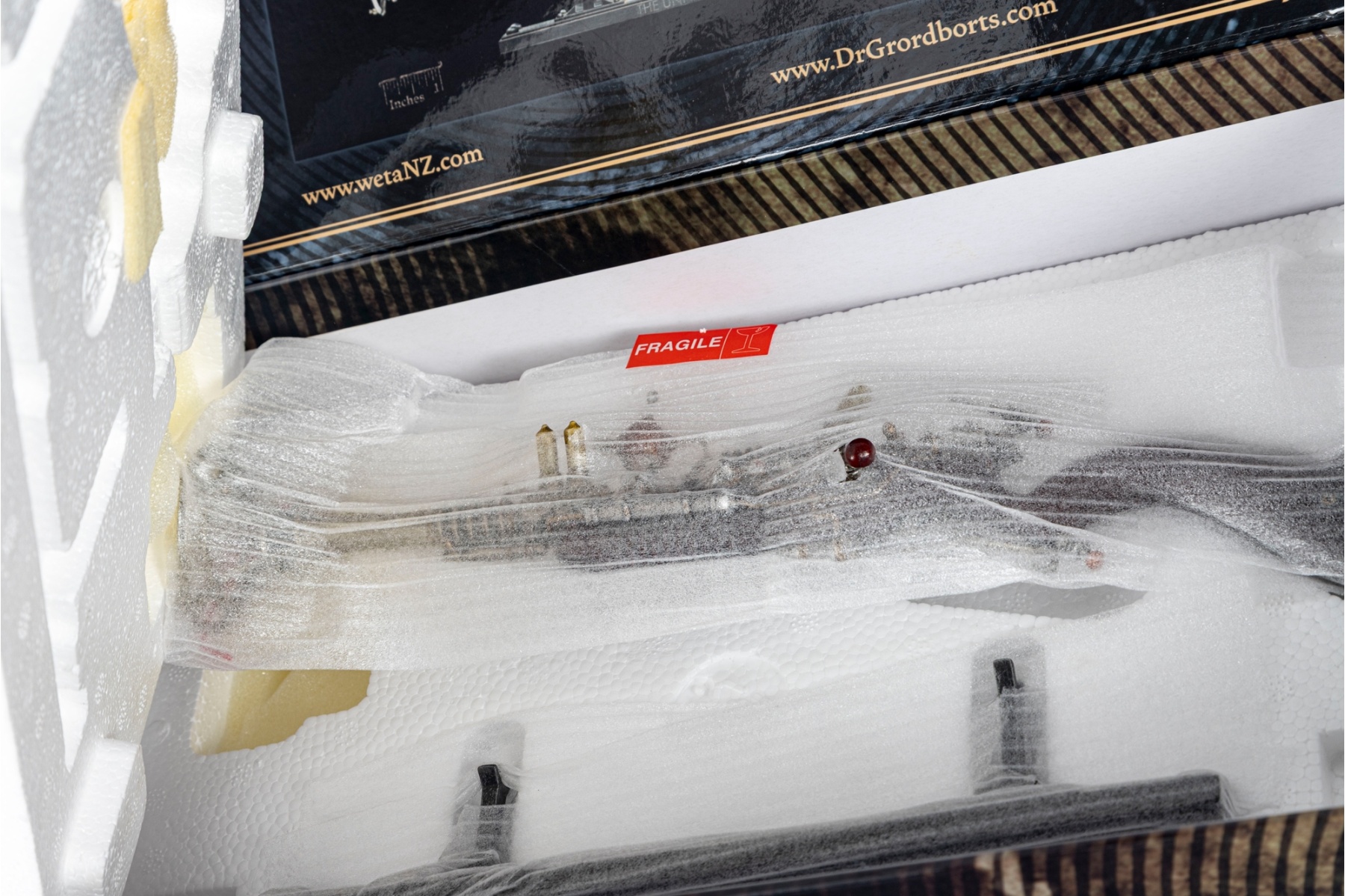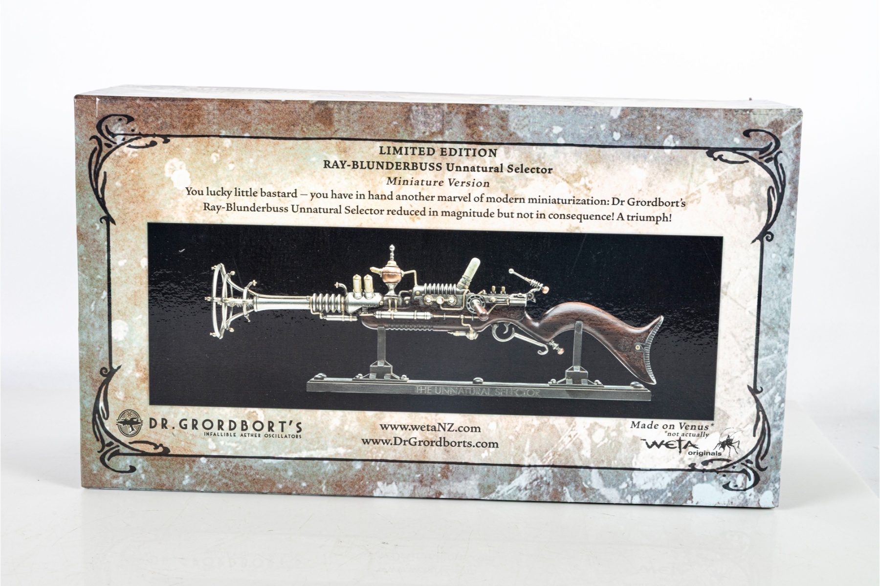 A limited edition collectible by Weta Workshop, New Zealand, this Dr. Grordbort’s Ray-Blunderbuss: The Unnatural Selector – Miniature Version showcases the intricate craftsmanship and imaginative world of Dr. Grordbort’s Infallible Aether Oscillators.