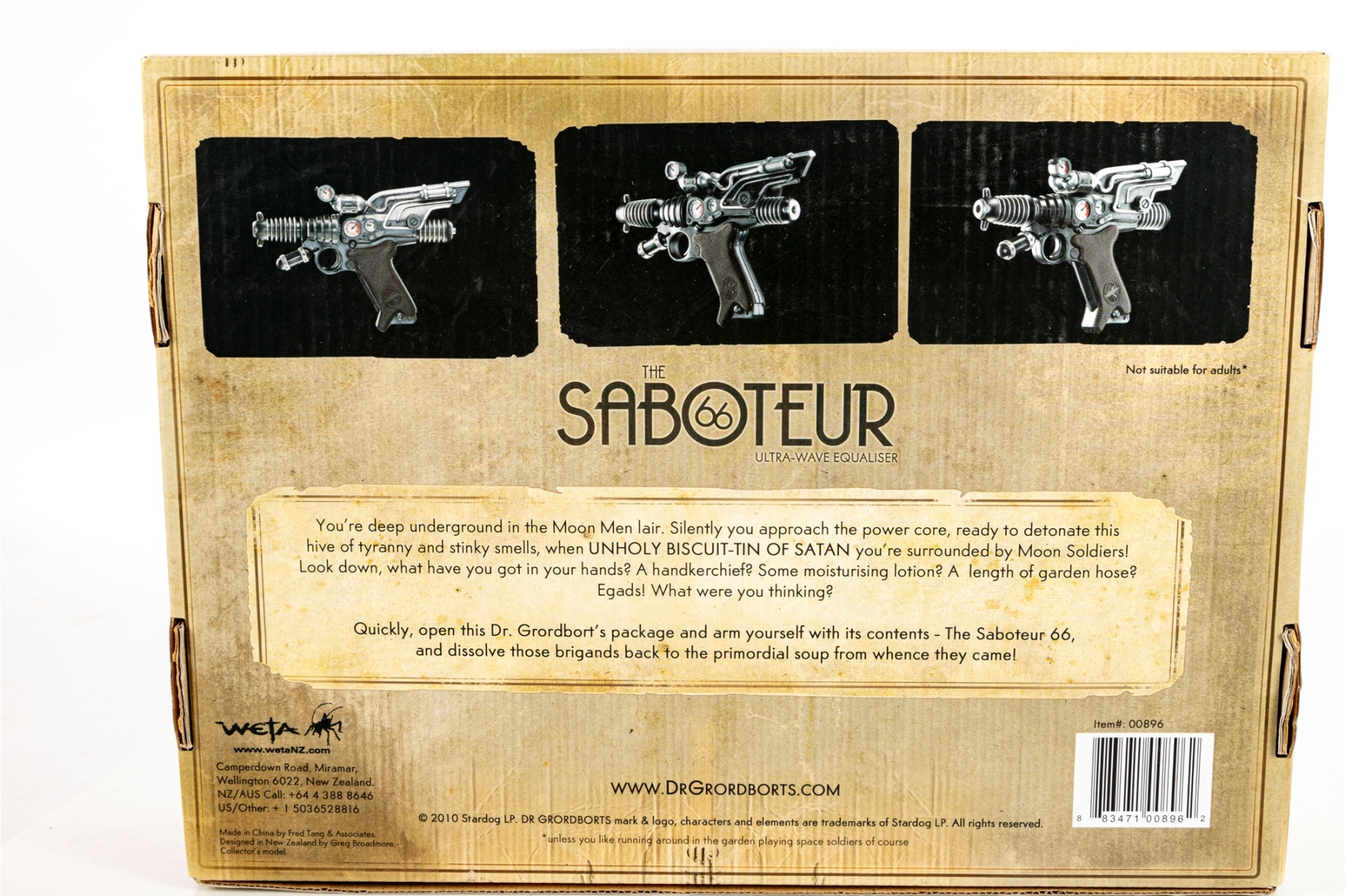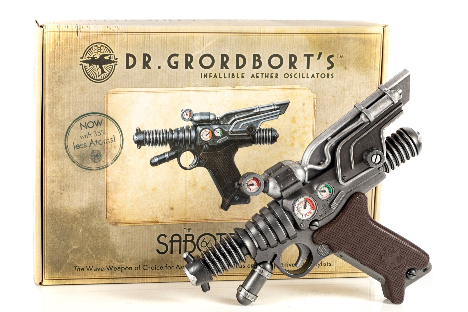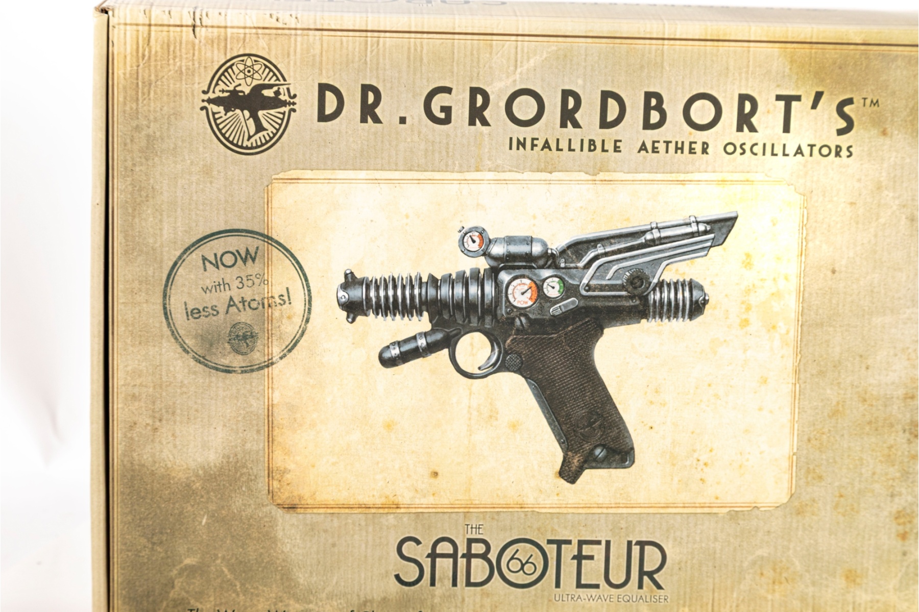 Imaginative and highly detailed Dr. Grordbort’s Infallible Aether Oscillator collectible titled The Saboteur 66, produced by Weta Workshop (2010). Designed by Greg Broadmore, this steampunk-inspired retro raygun replica embodies the signature Dr. Grordbort’s aesthetic — a fusion of early 20th-century industrial design, pulp science fiction, and dark humor.