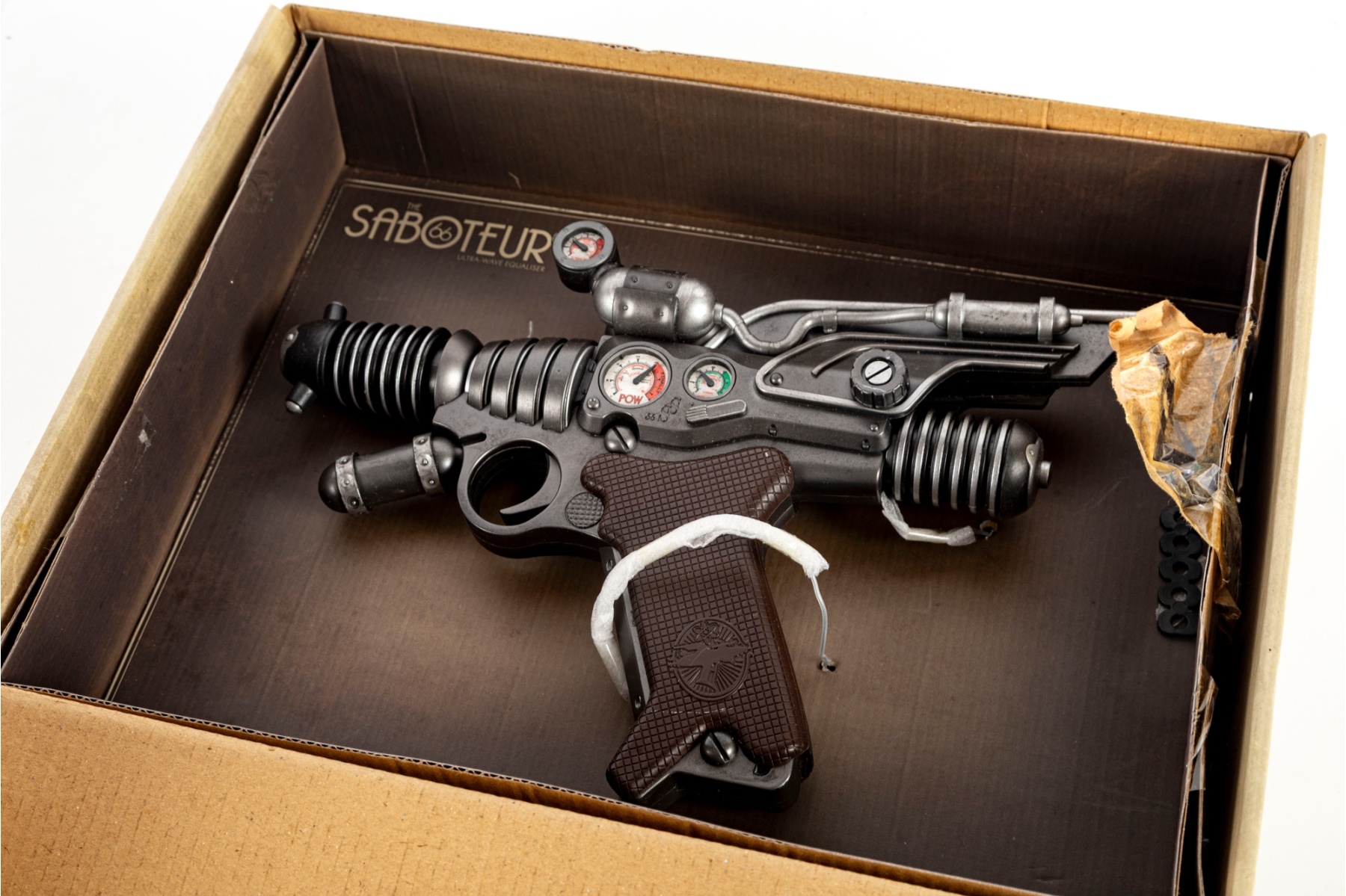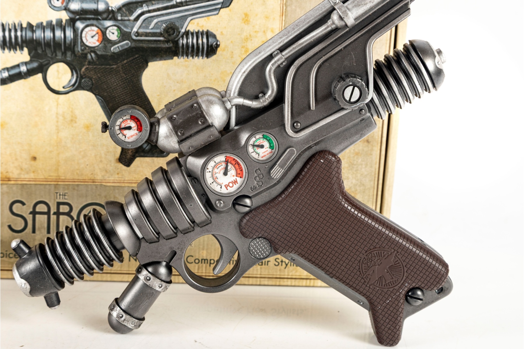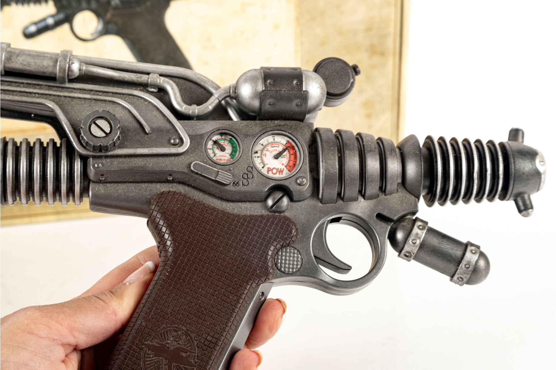 Imaginative and highly detailed Dr. Grordbort’s Infallible Aether Oscillator collectible titled The Saboteur 66, produced by Weta Workshop (2010). Designed by Greg Broadmore, this steampunk-inspired retro raygun replica embodies the signature Dr. Grordbort’s aesthetic — a fusion of early 20th-century industrial design, pulp science fiction, and dark humor.