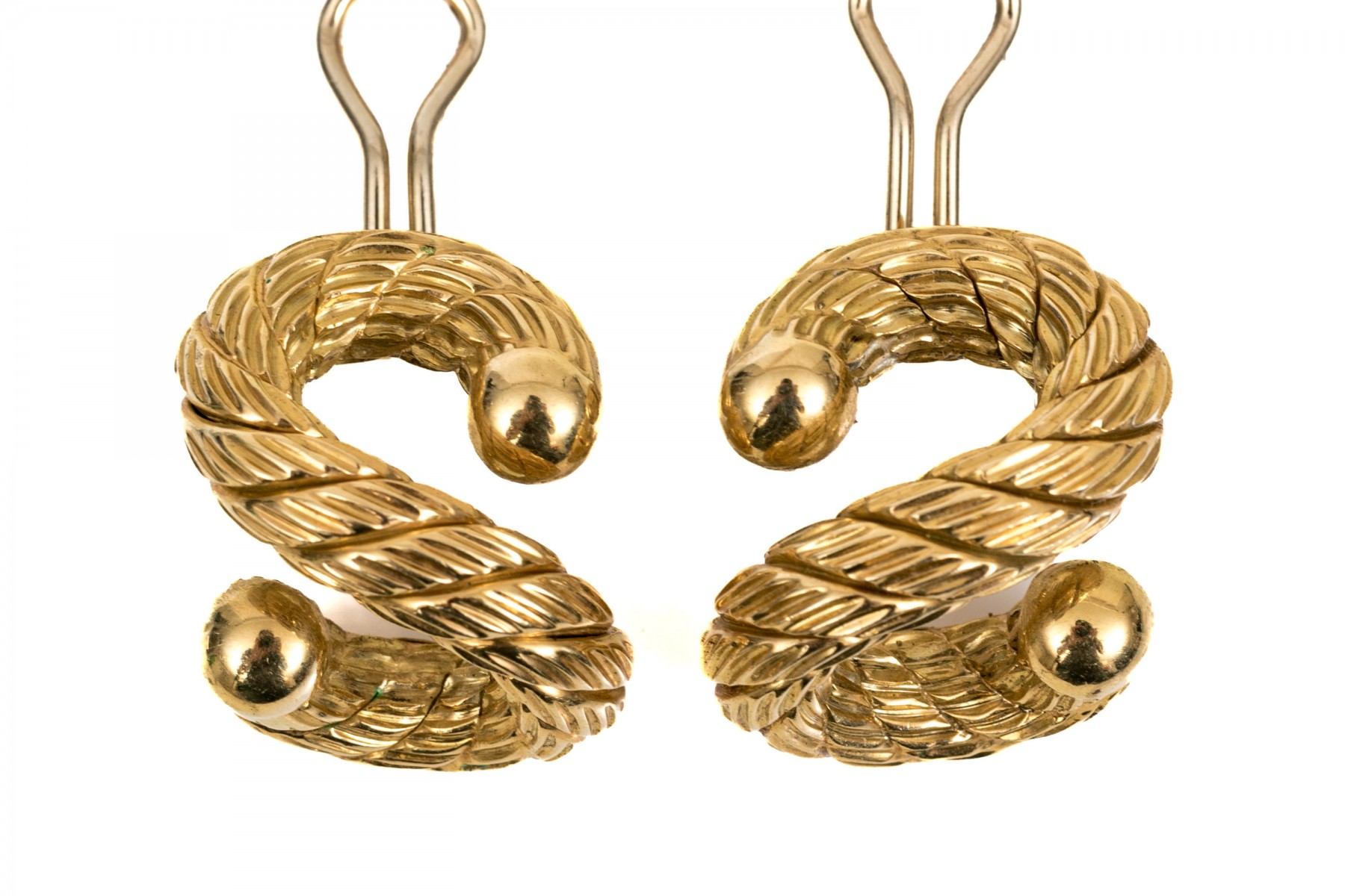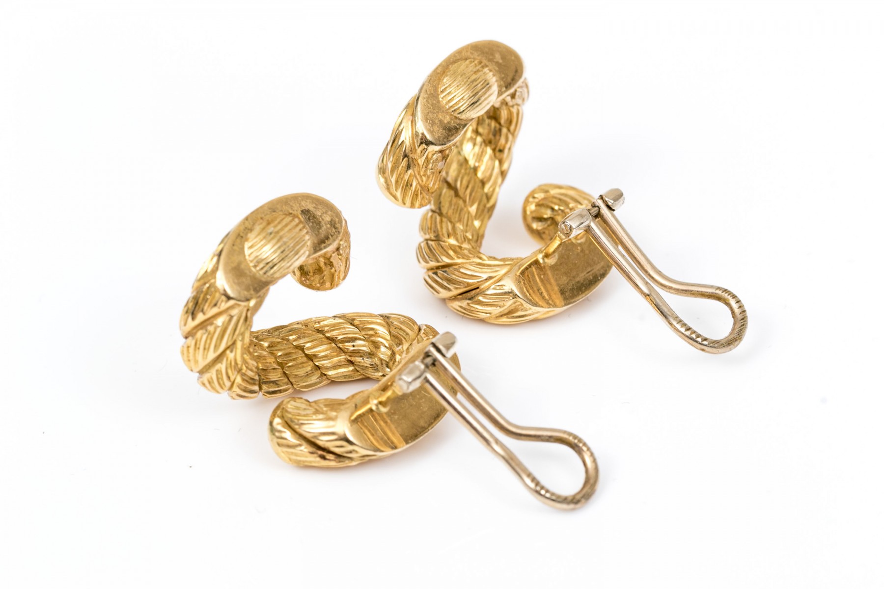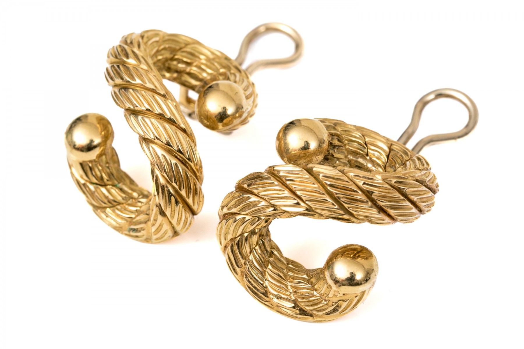 Opposing 18K yellow gold earrings. These earrings display a serpentine rope design with a textured finish. Clip style backings.