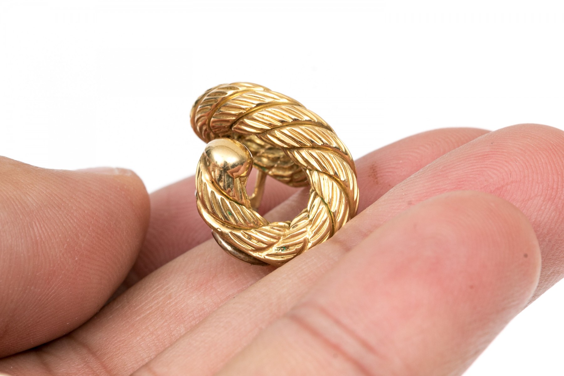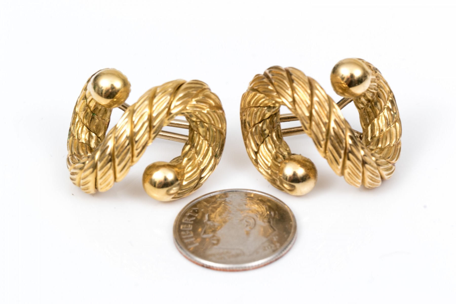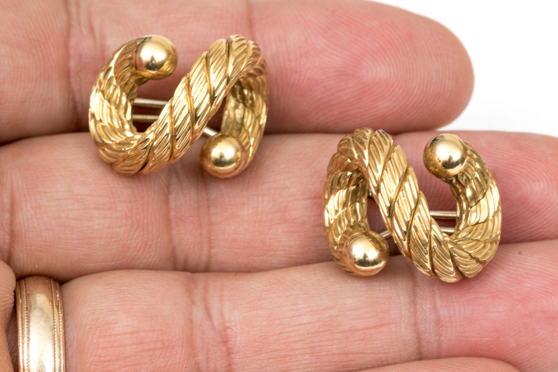 Opposing 18K yellow gold earrings. These earrings display a serpentine rope design with a textured finish. Clip style backings.