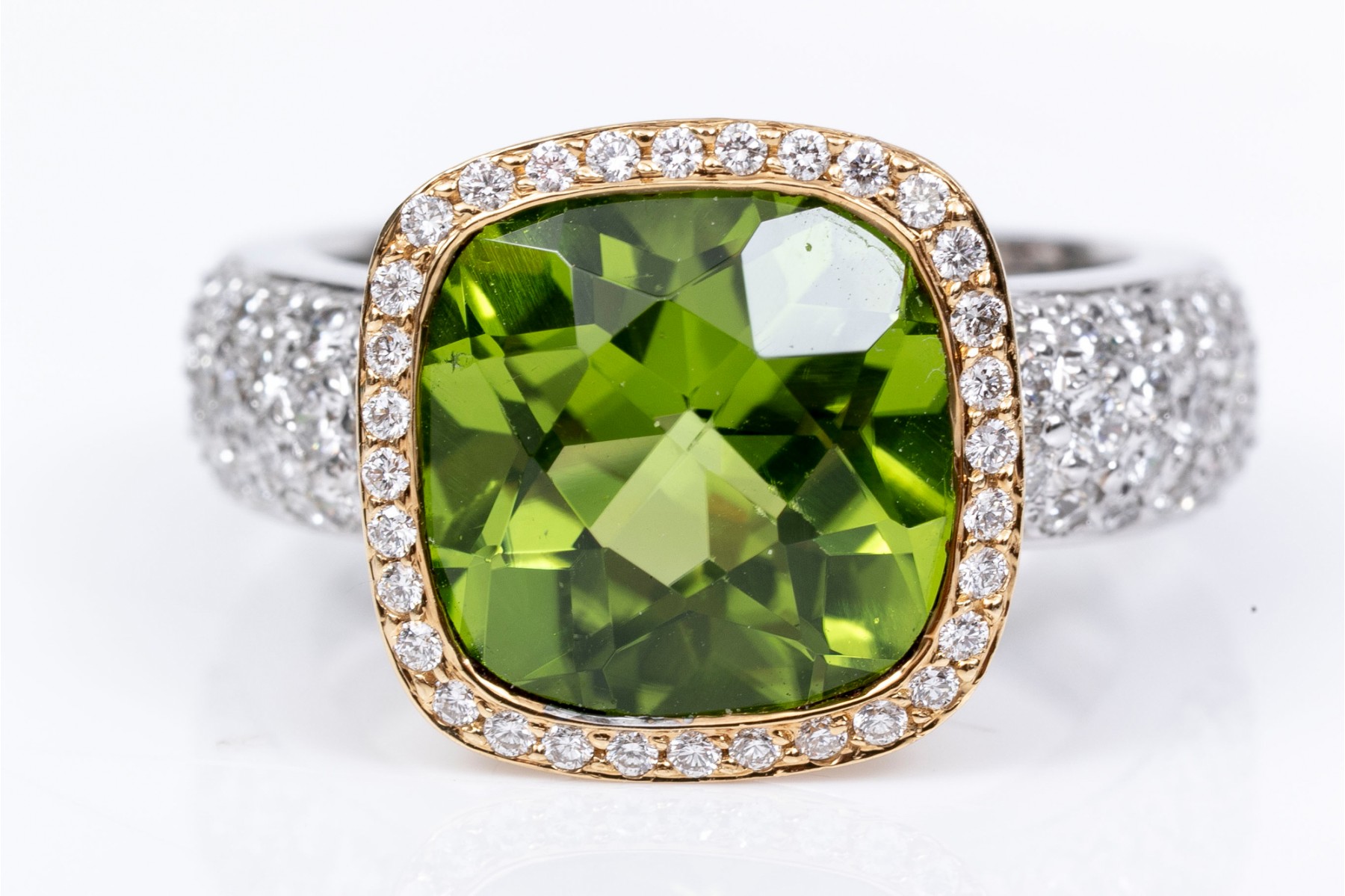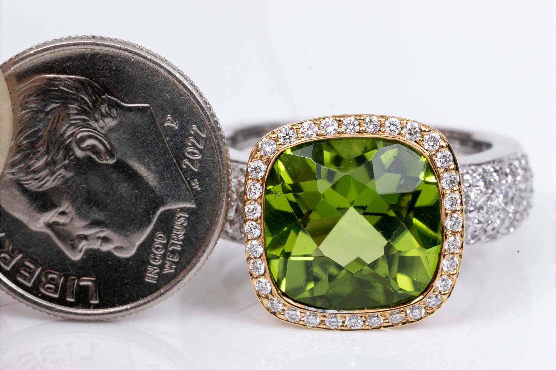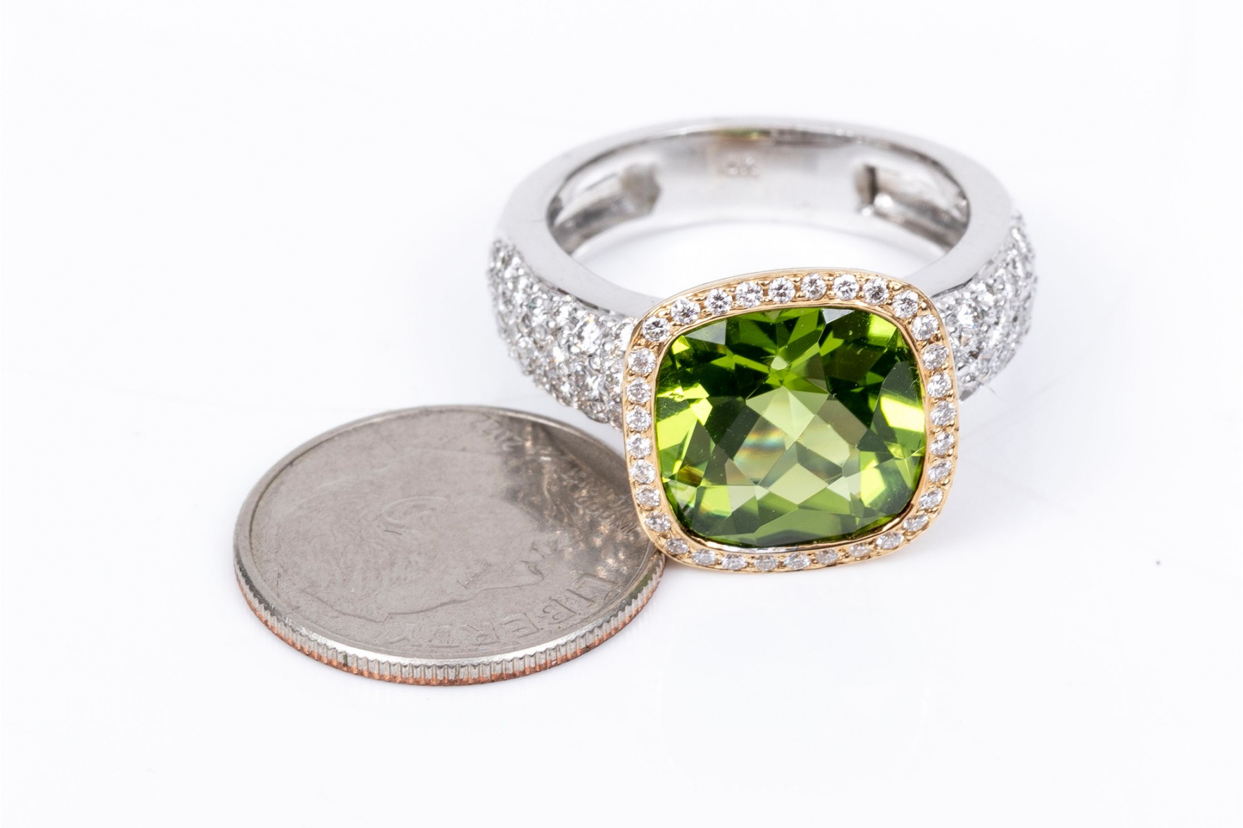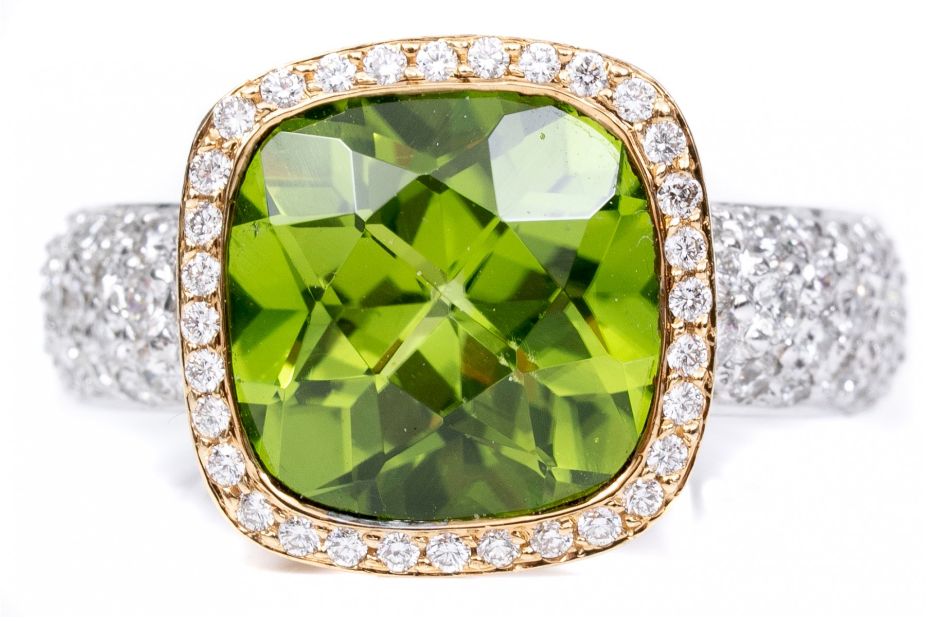 18K white gold ring. A single vibrant green checkered square cushion cut peridot within a high yellow gold bezel setting. Set into the bezel setting surrounding the peridot and into the ring shanks are round brilliant cut diamonds adding an eye-catching shimmer. The peridot is approximately 5.4 cts., and the diamonds are approximately 1.11 TCW. Ring size 7.25.