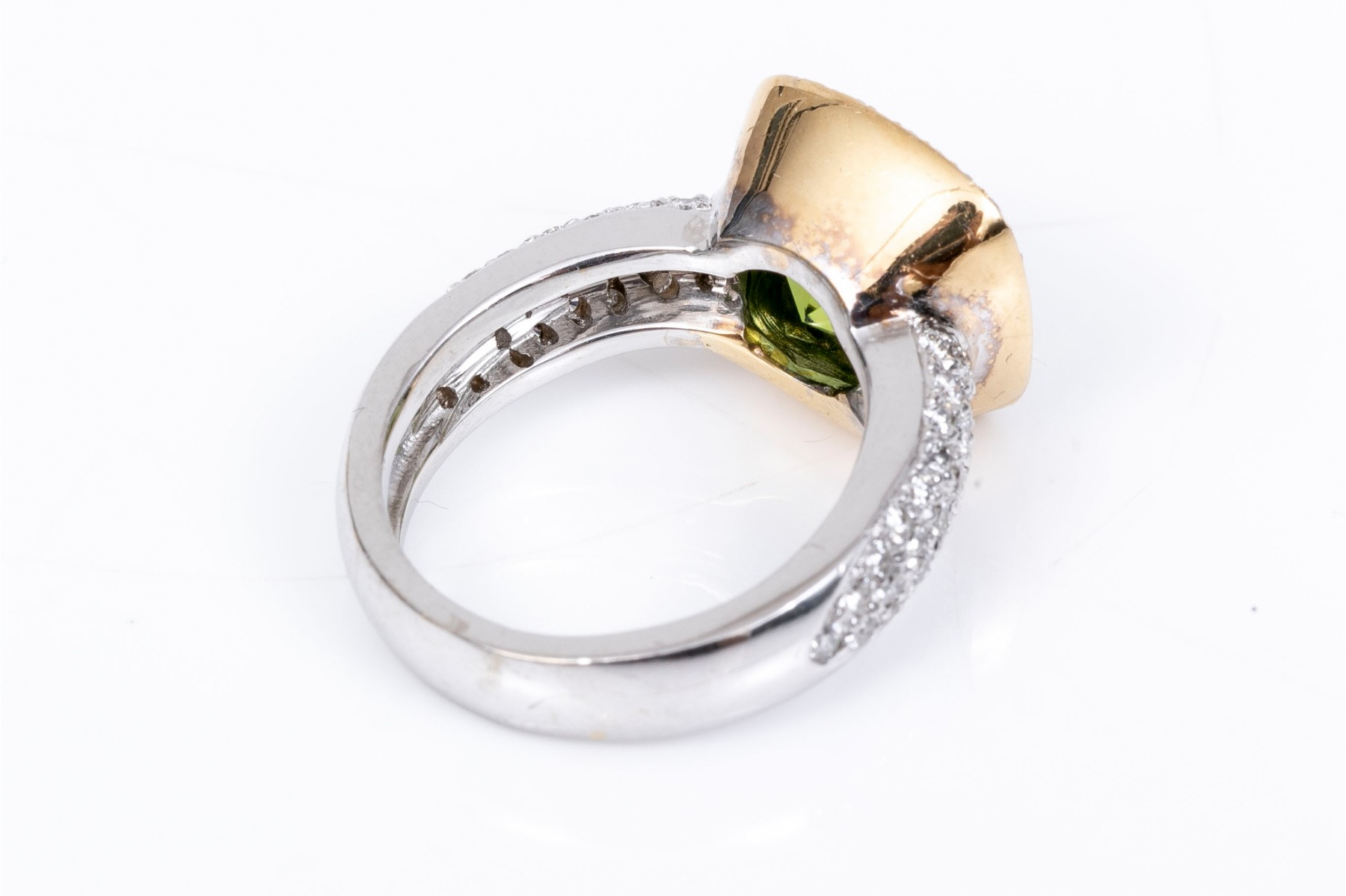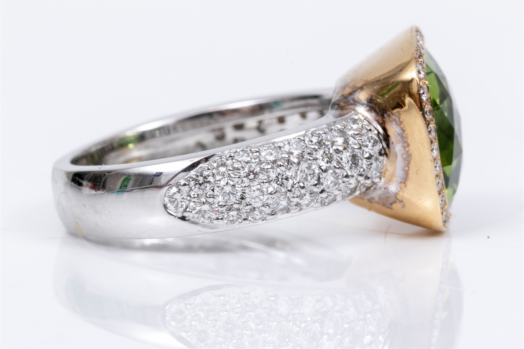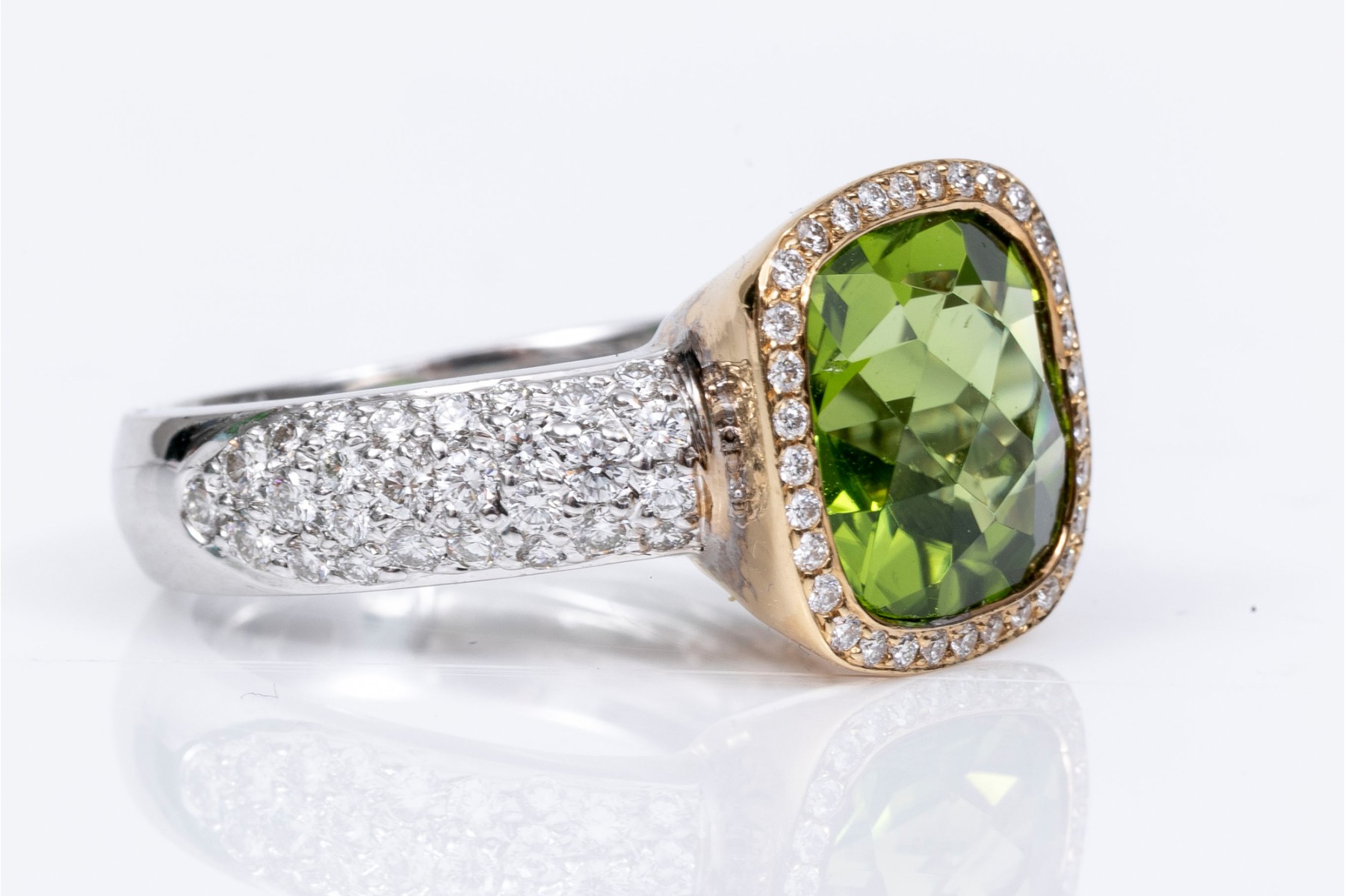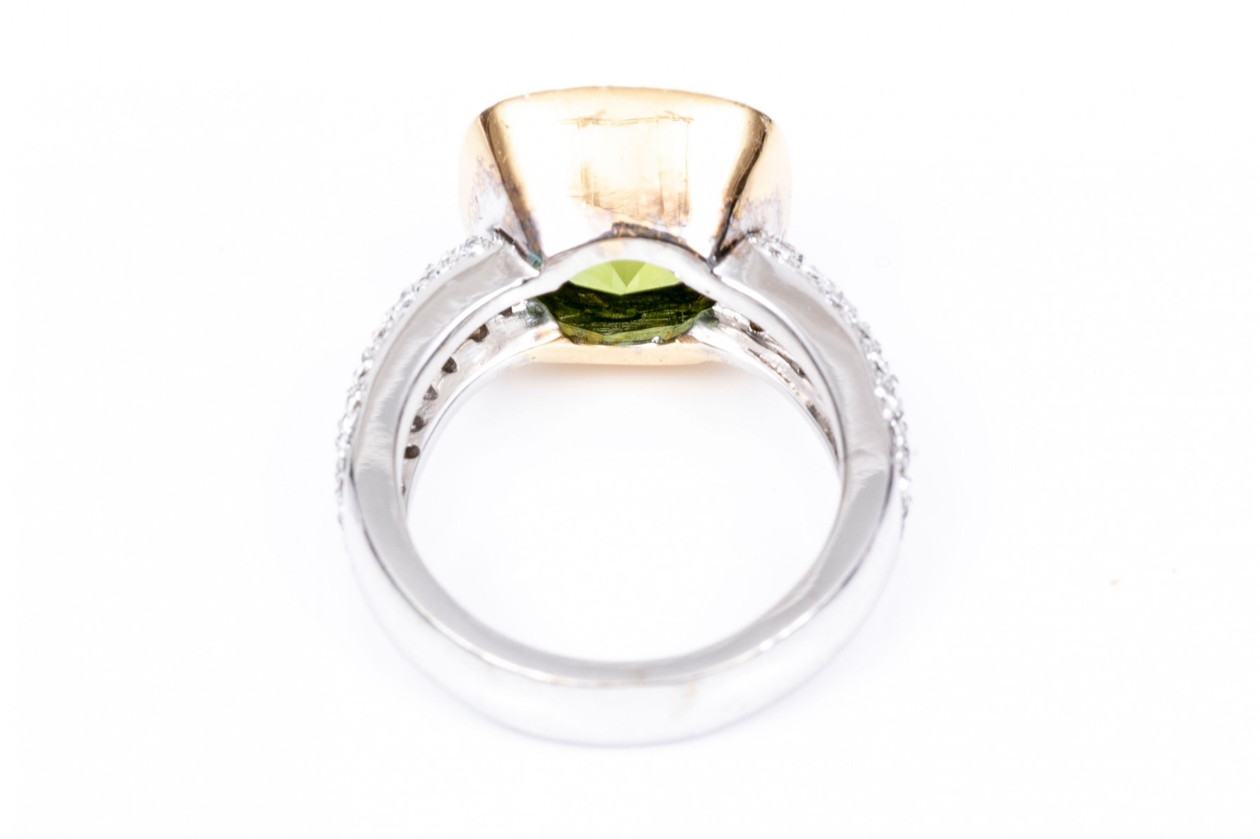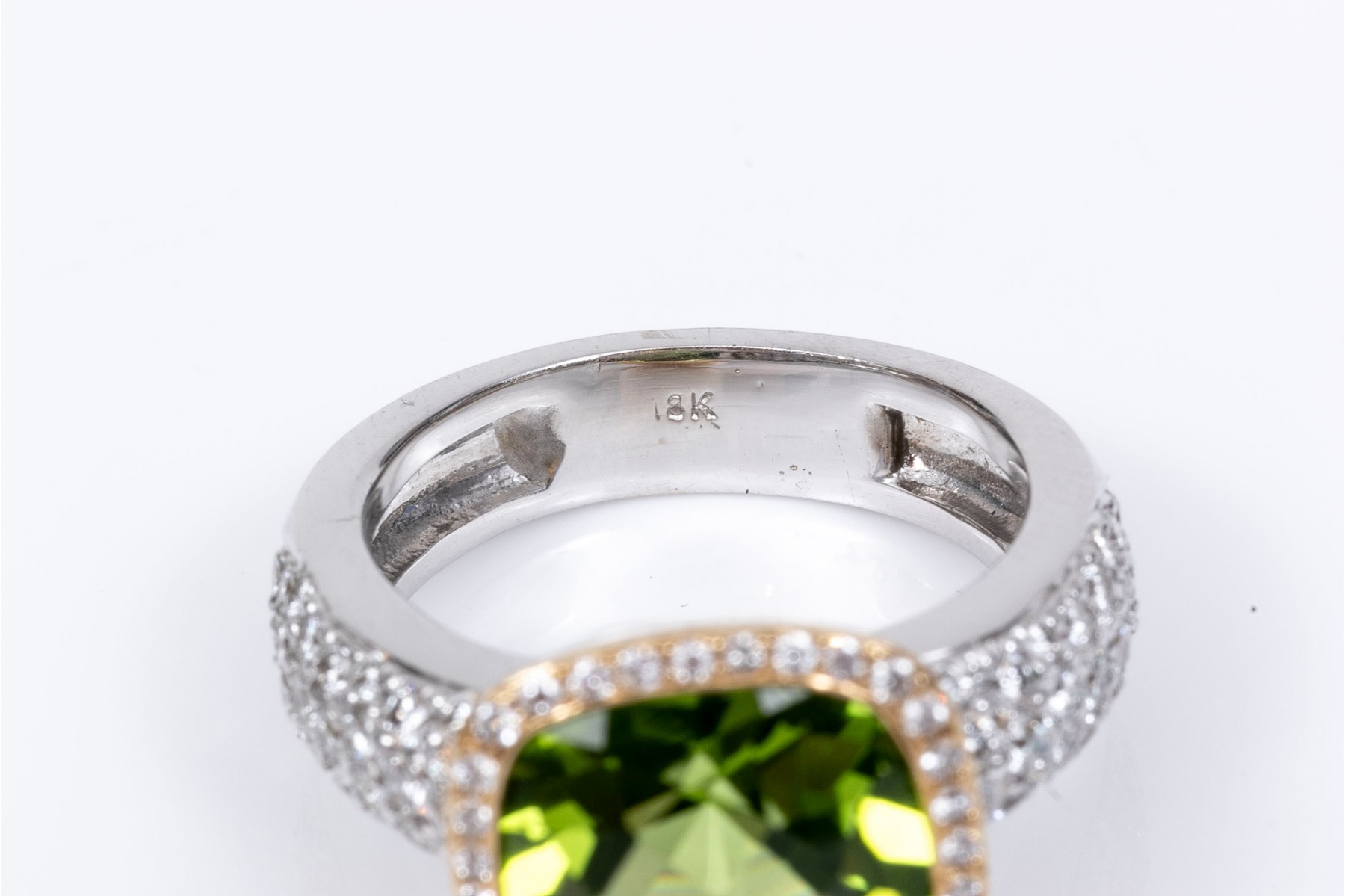 18K white gold ring. A single vibrant green checkered square cushion cut peridot within a high yellow gold bezel setting. Set into the bezel setting surrounding the peridot and into the ring shanks are round brilliant cut diamonds adding an eye-catching shimmer. The peridot is approximately 5.4 cts., and the diamonds are approximately 1.11 TCW. Ring size 7.25.