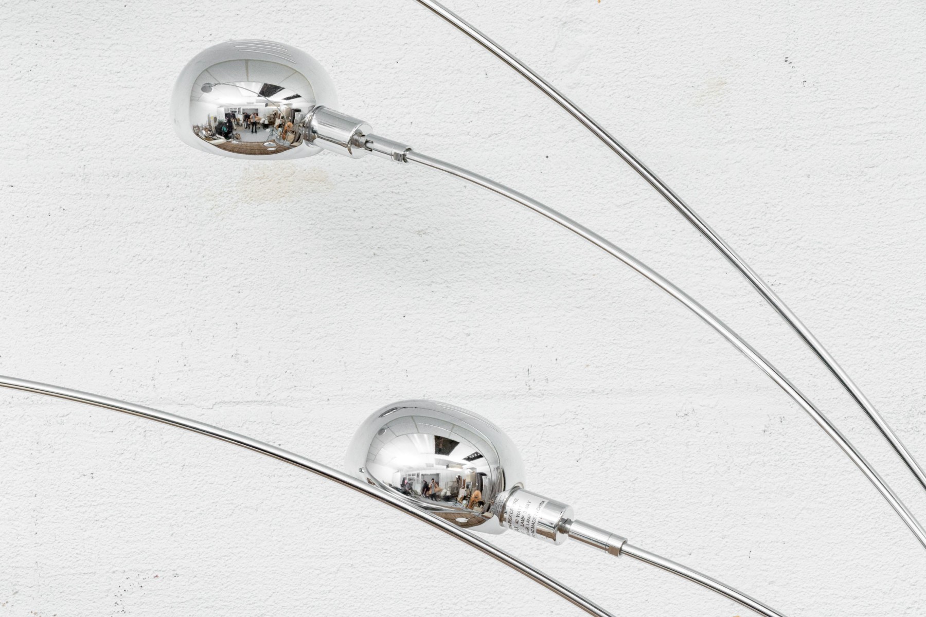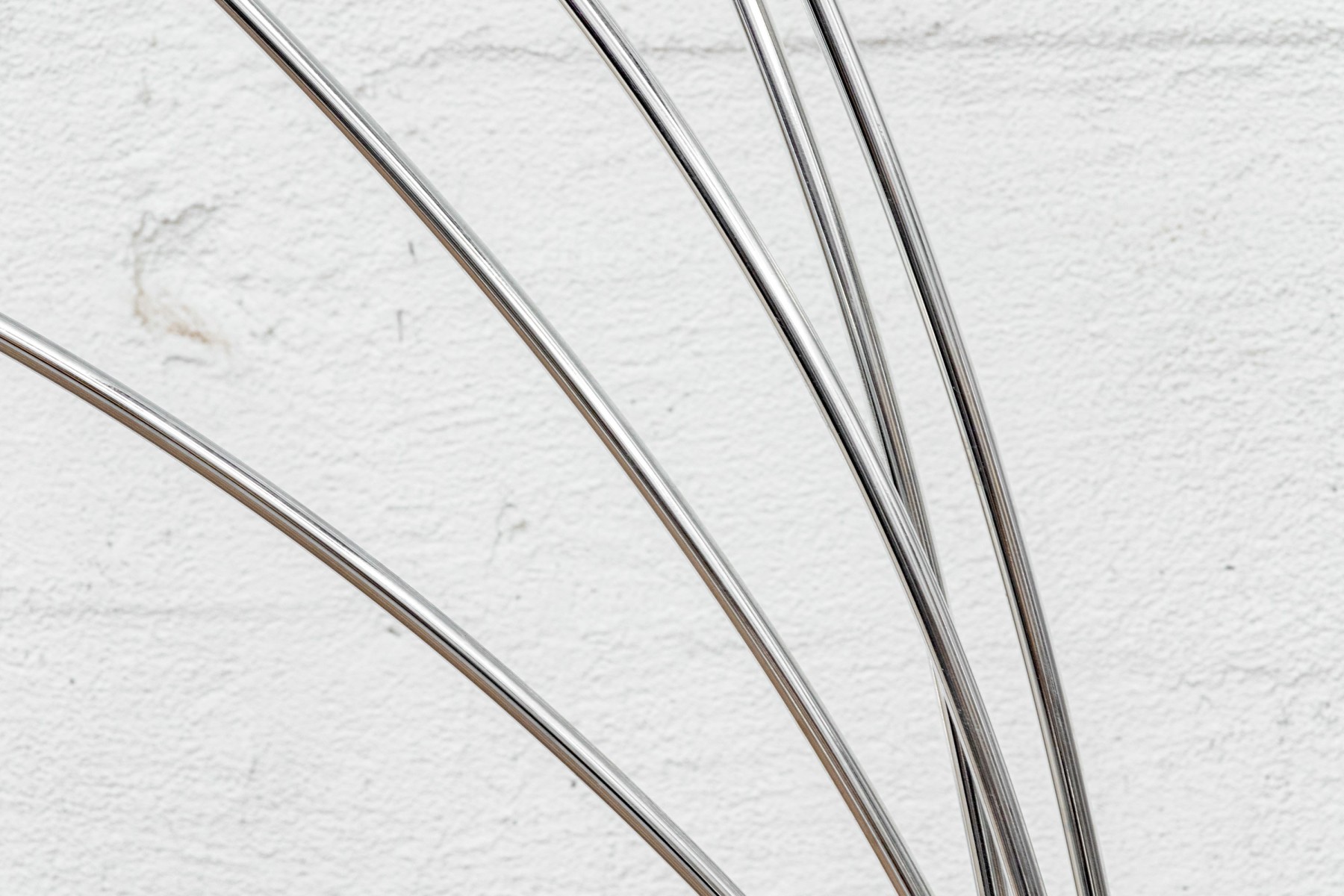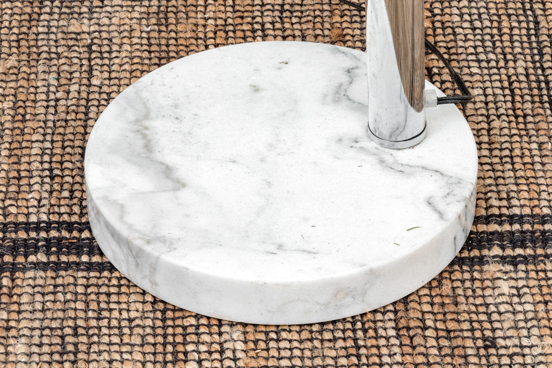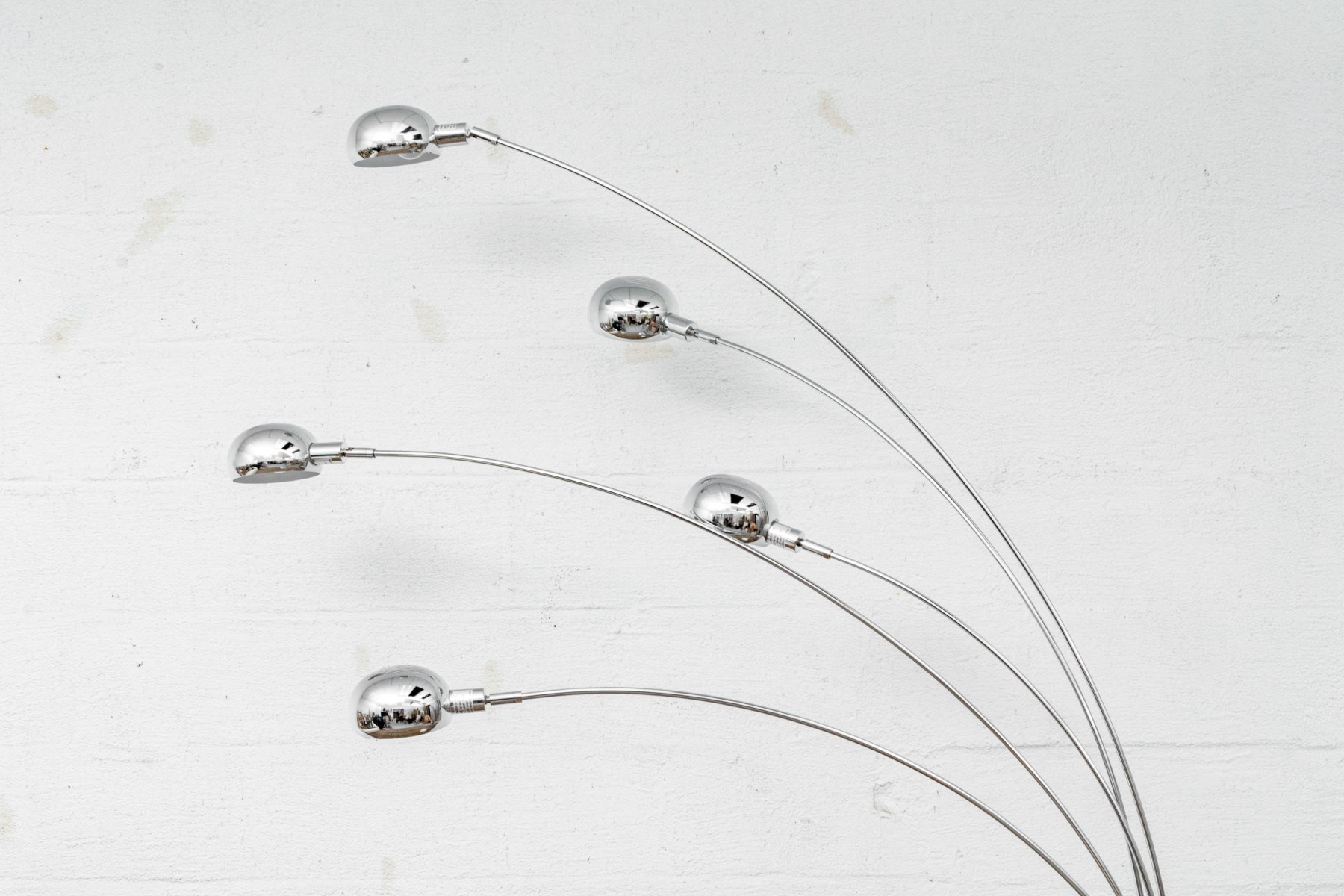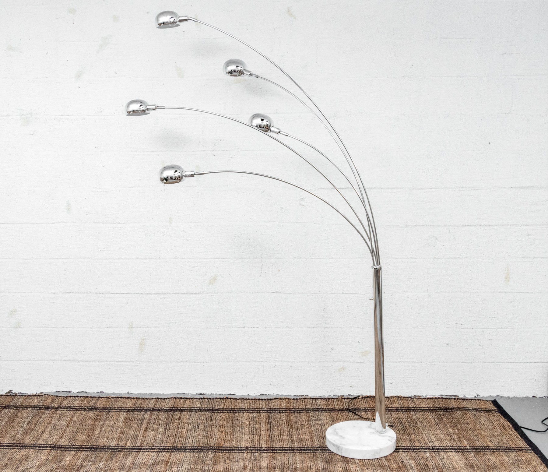 An eye-catching floor lamp in the manner of Ateljé Lyktan "Gustav," evoking stylish mid-to-late 20th century charm with five dramatically arching chrome arms with mushroom shades, supported by a simple cylindrical column leading to an elegant round white marble base.