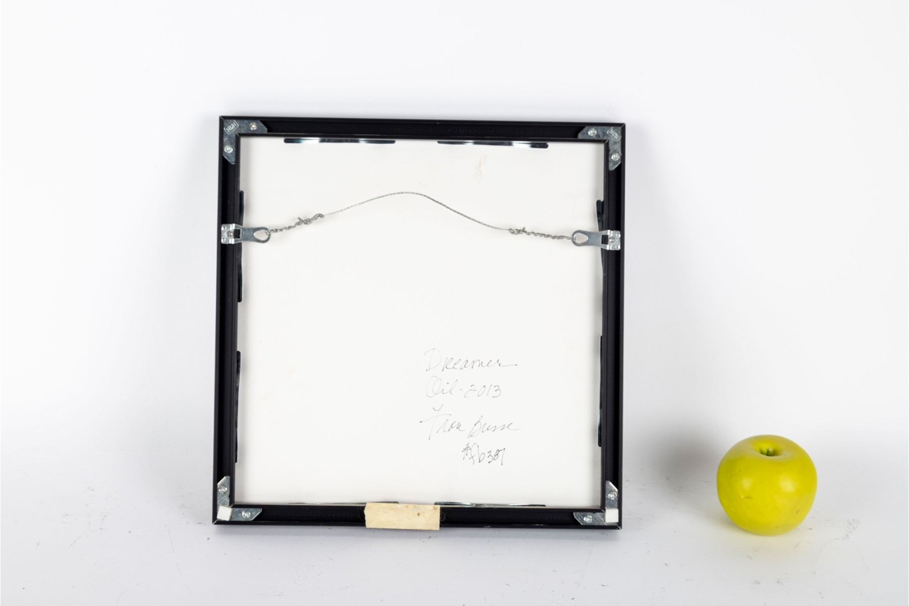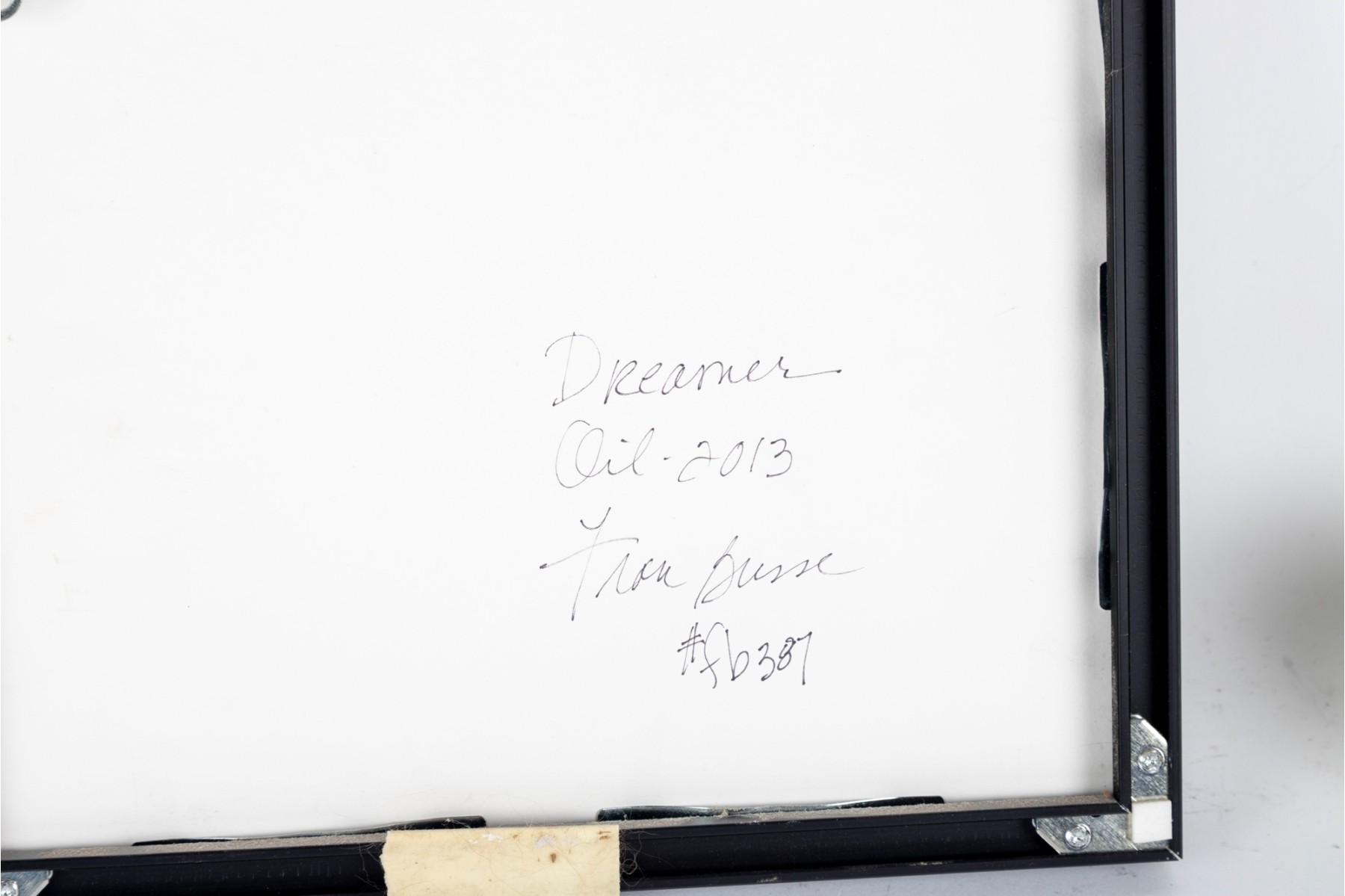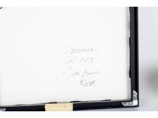 Expressive oil painting titled Dreamers, created with a knife palette technique for bold texture and depth. Signed and dated 2013 by the artist, presented in a modern metal frame, faced with glass.