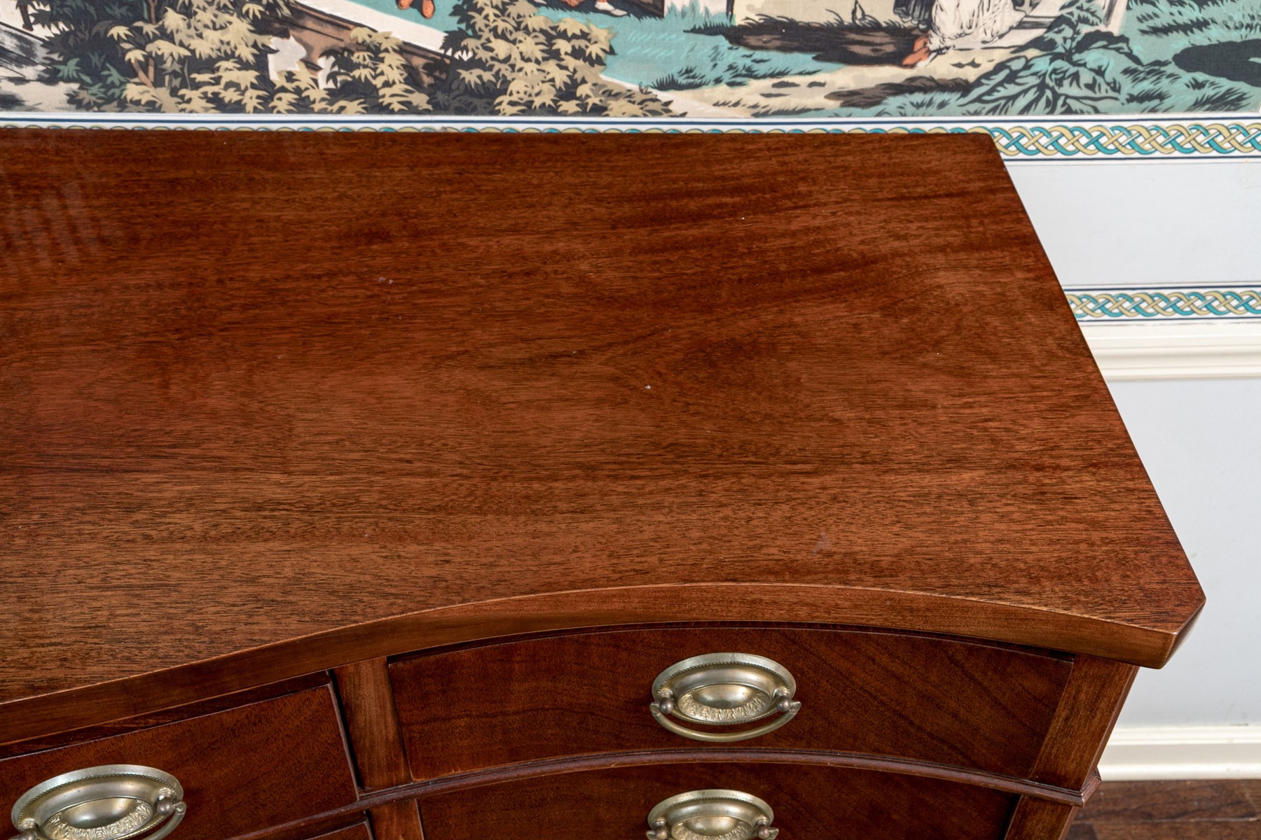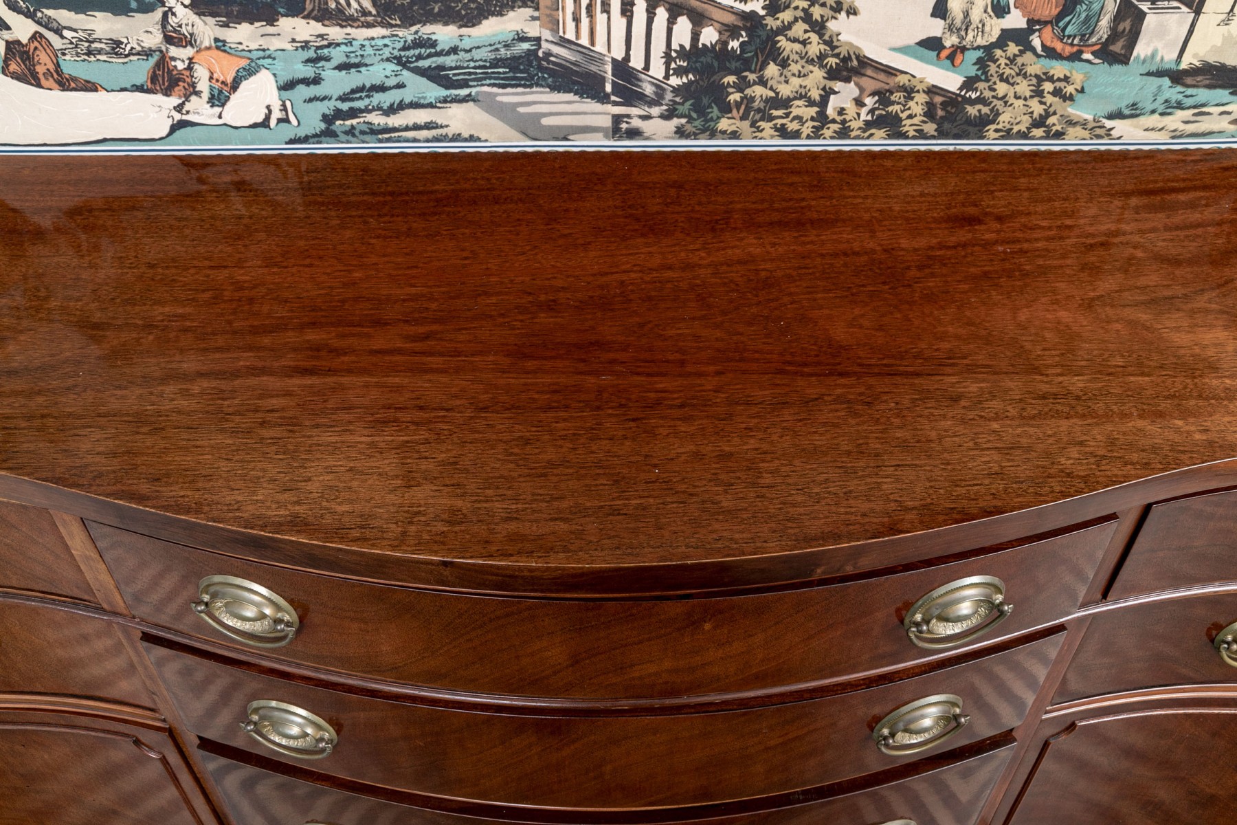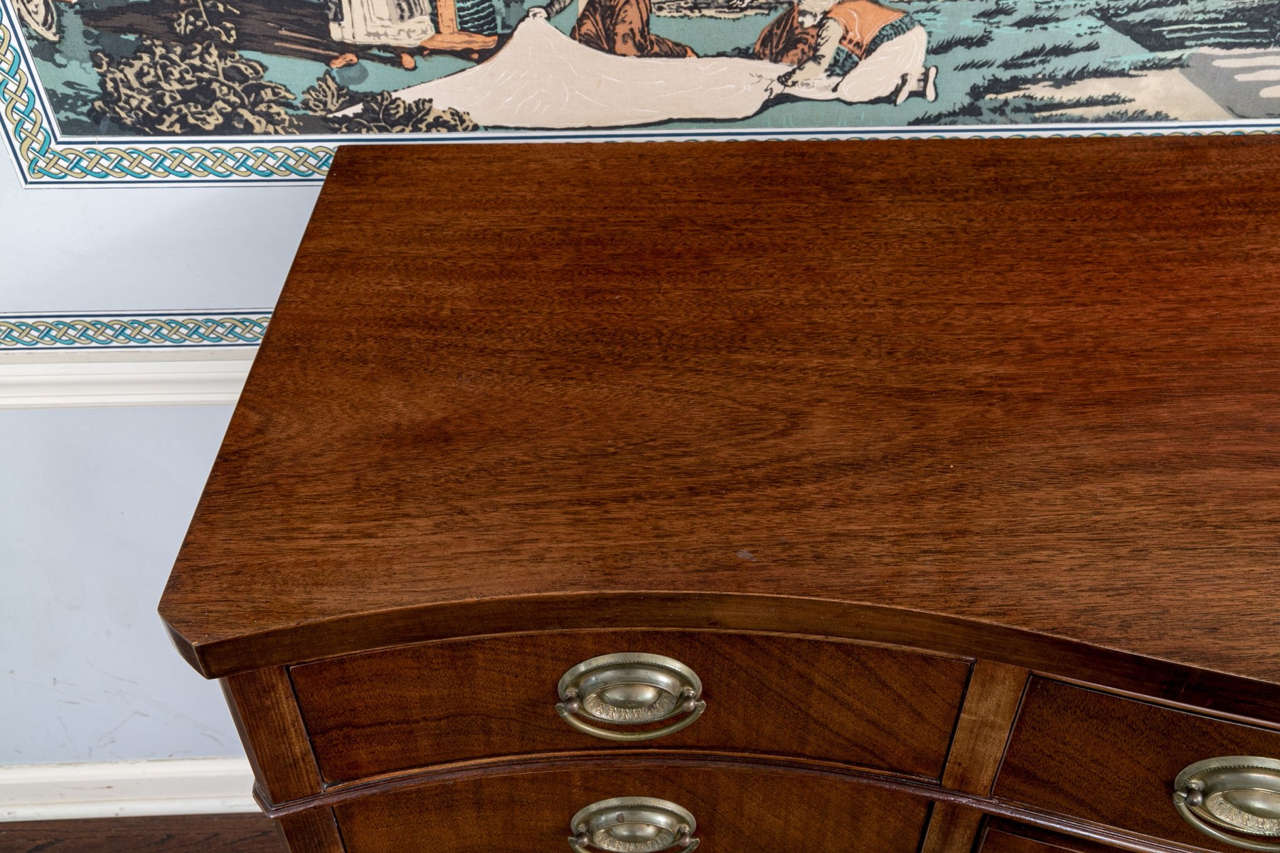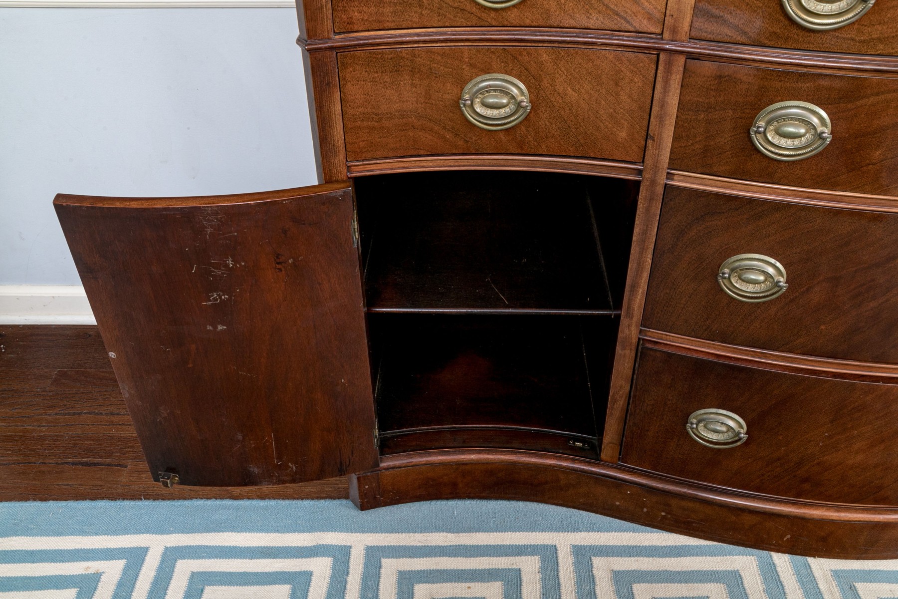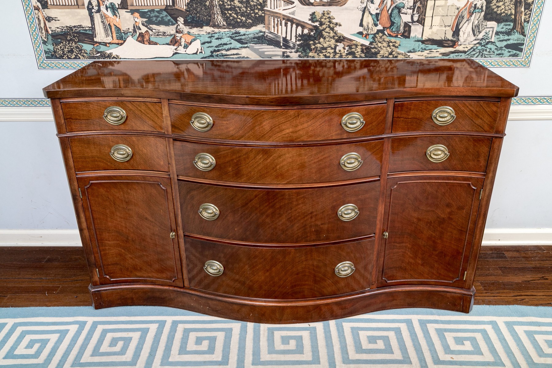 The Drexel Mahogany Serpentine Sideboard from the Travis Court Collection is a stunning and timeless piece of furniture. It showcases classic design with its serpentine shape and retains its original hardware