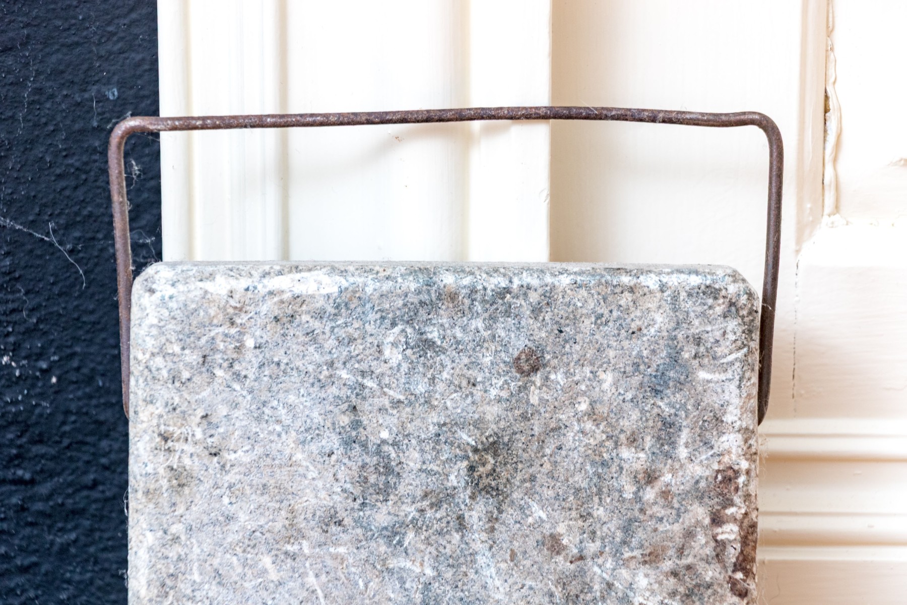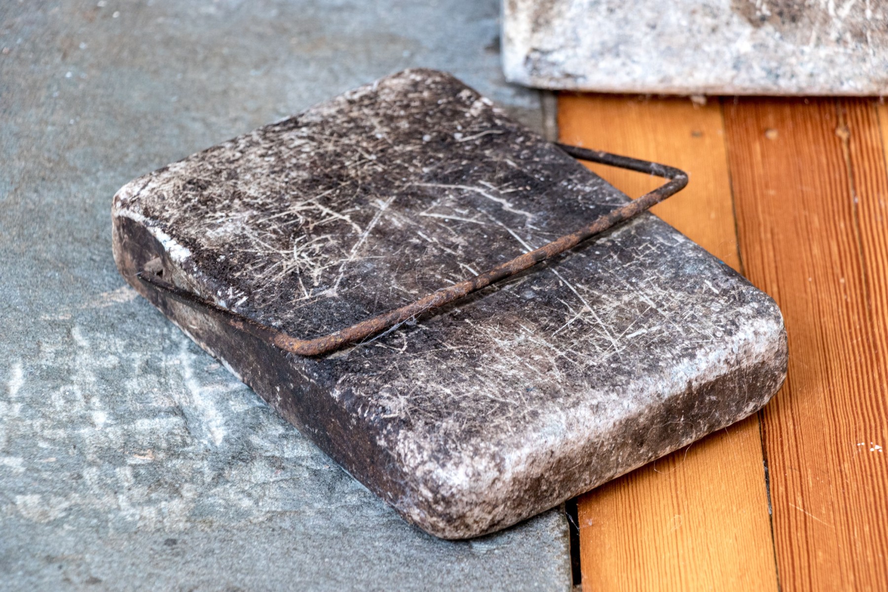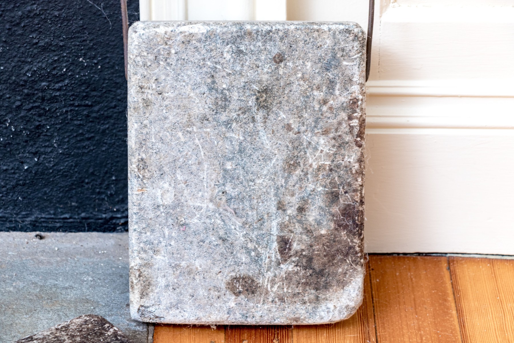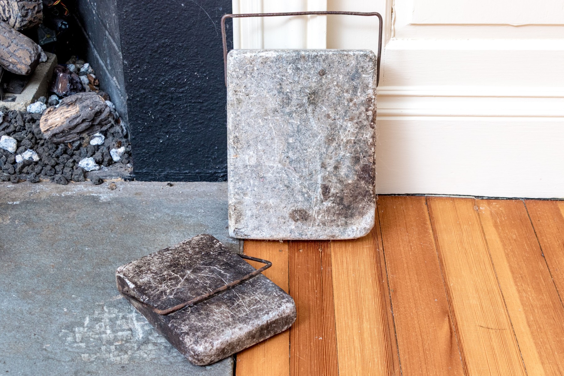 A wonderful duo of antique soapstone foot warmers in matching design, both featuring rectangular square bodies with iron handles through the tops.