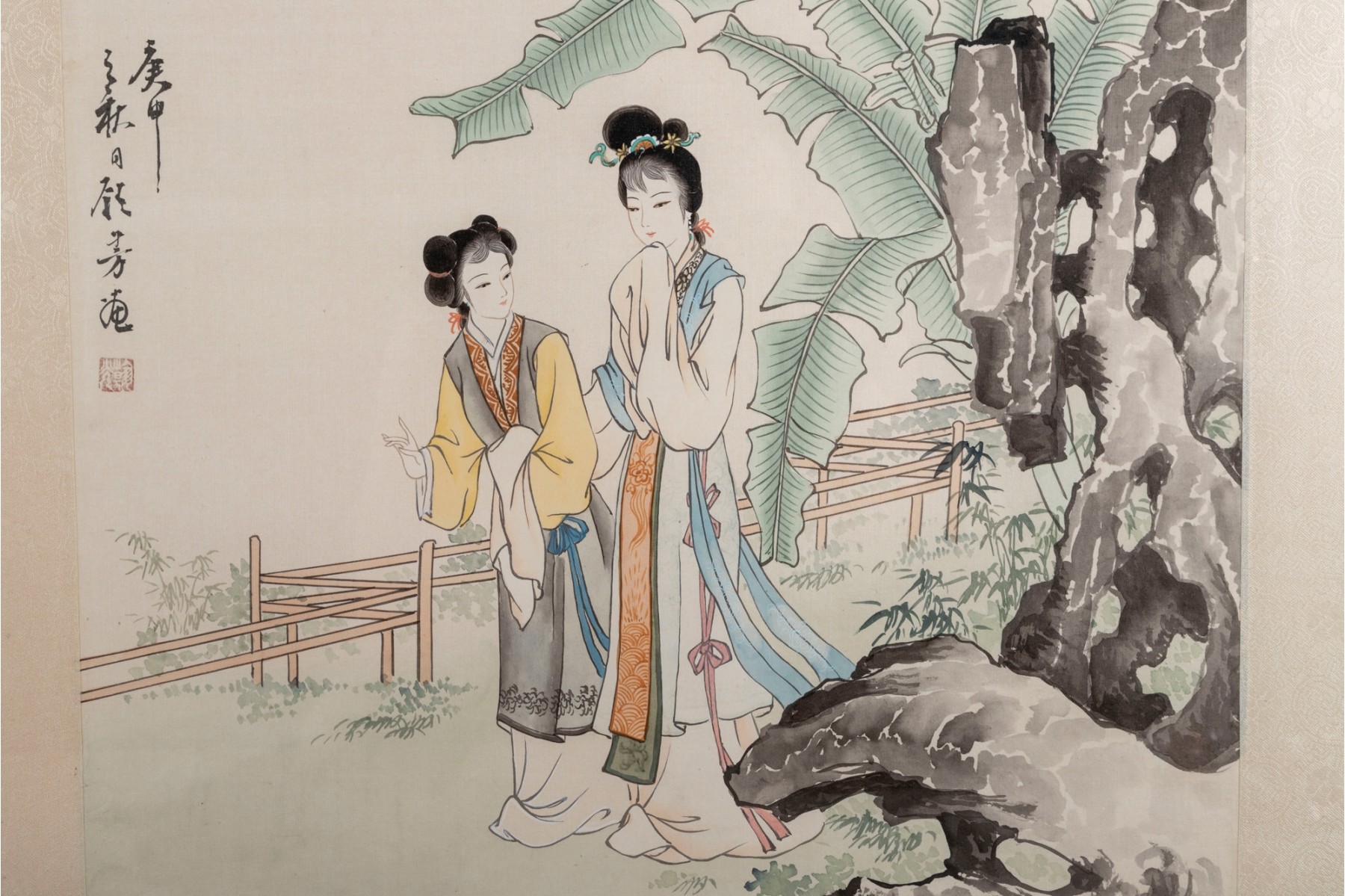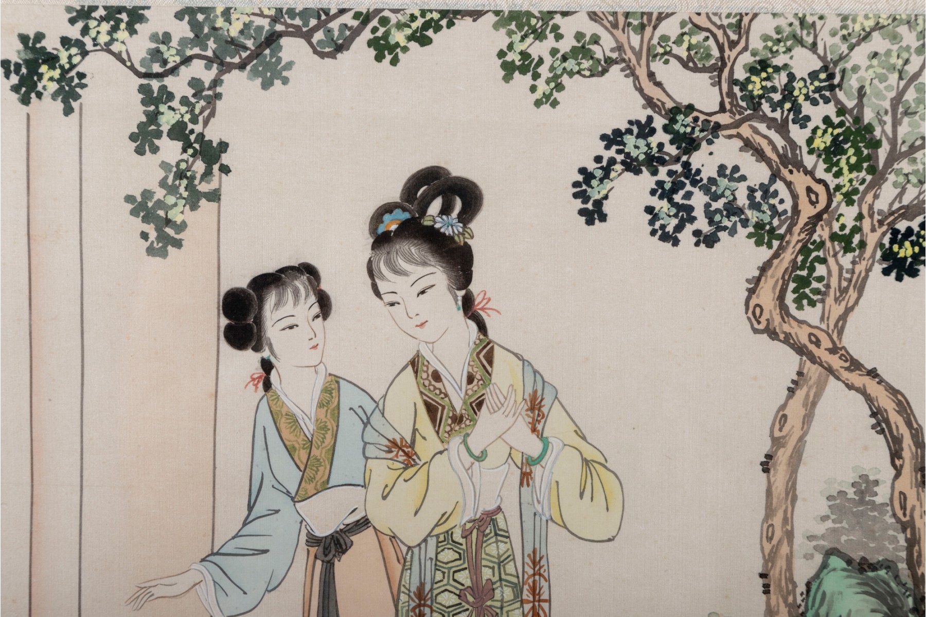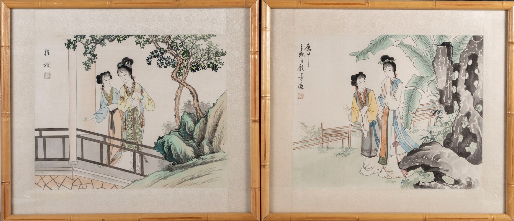 A delightful duo of Chinese paintings on silk depicting beautiful women enjoying conversation in palatial courtyards surrounded by lush nature and rocky outcrops. With written inscriptions and red seals, likely Sing-Yan Choy. The scenes are bordered with cream jacquard patterned trims and displayed in matching honeyed blonde wood frames with faux bamboo designs.