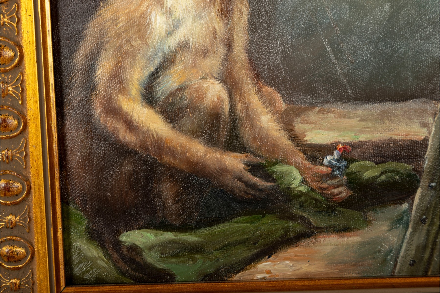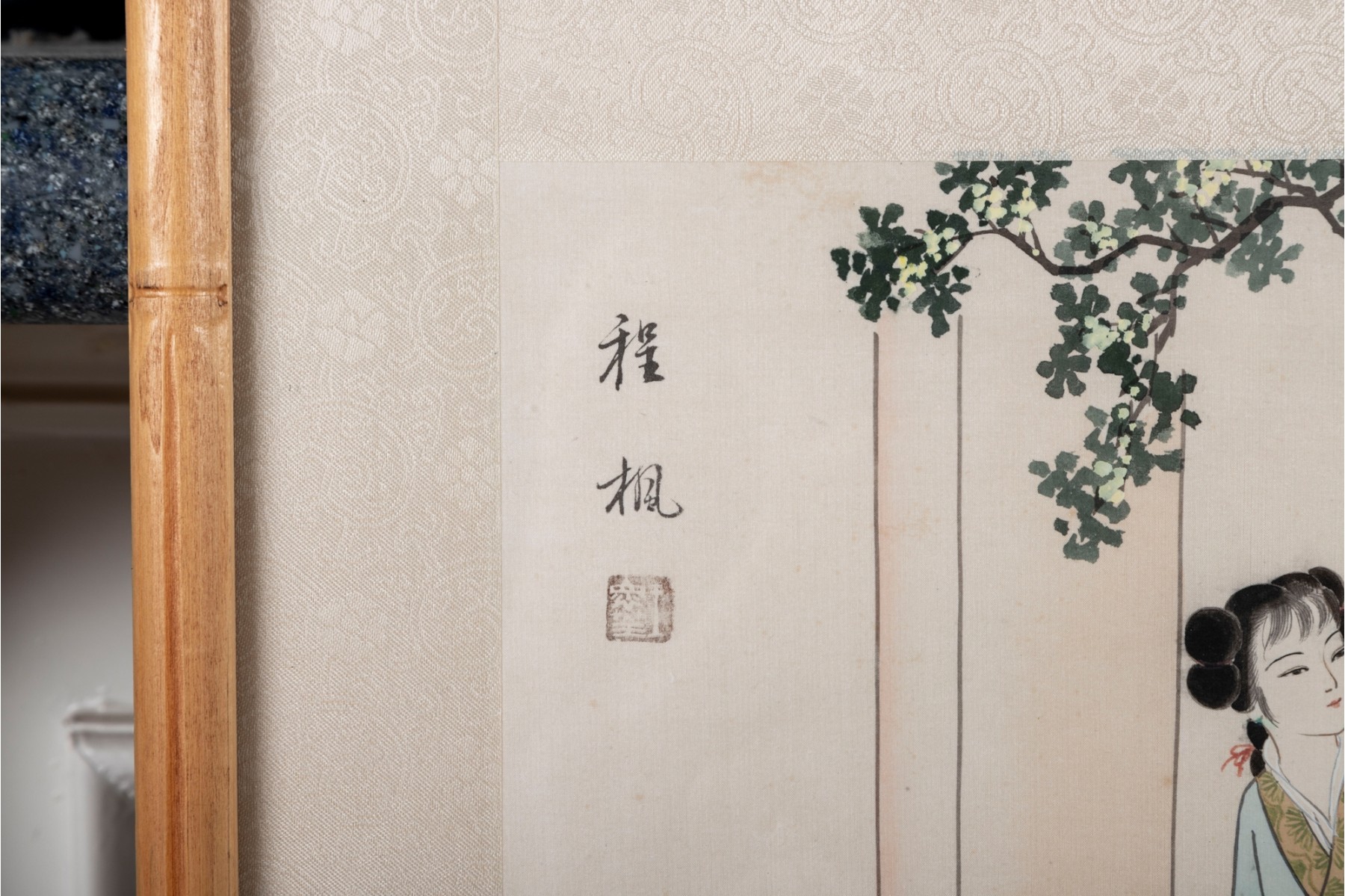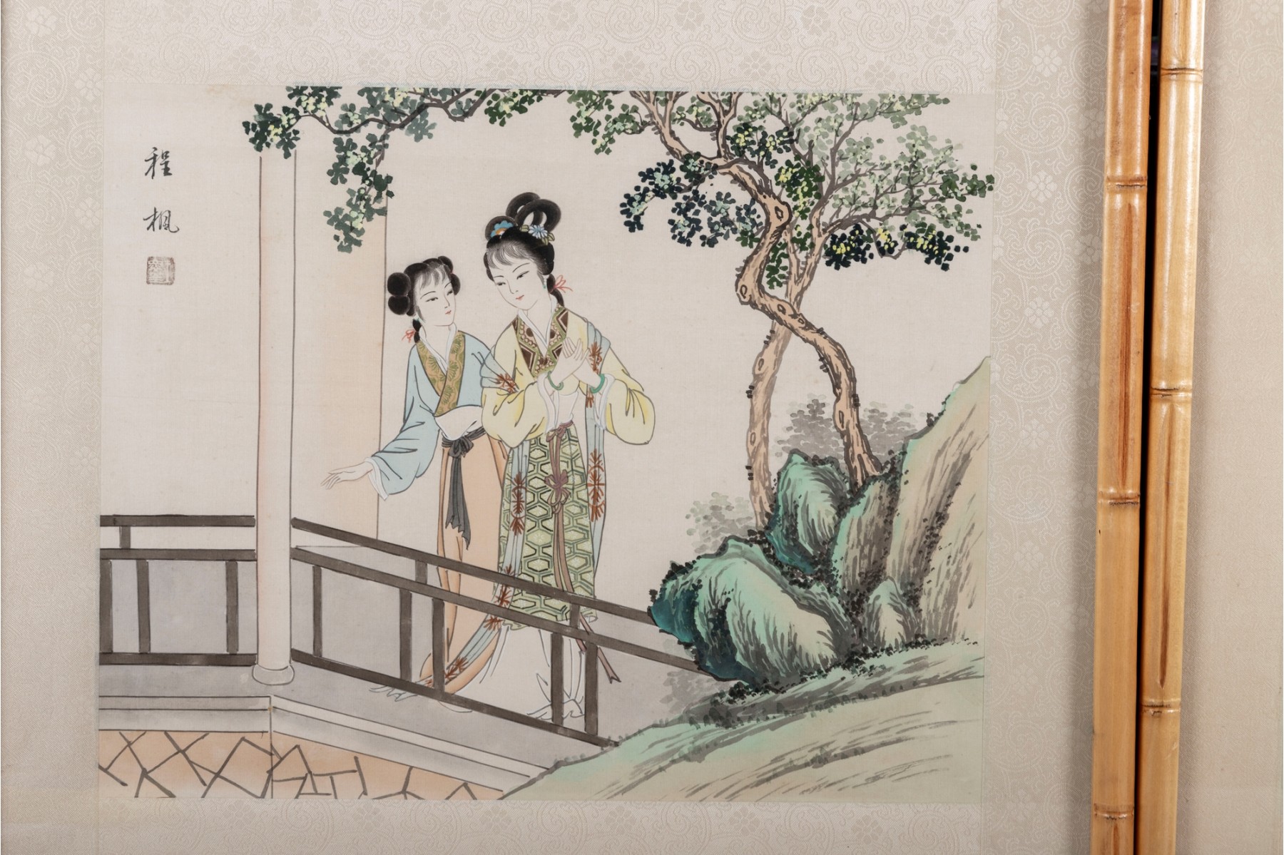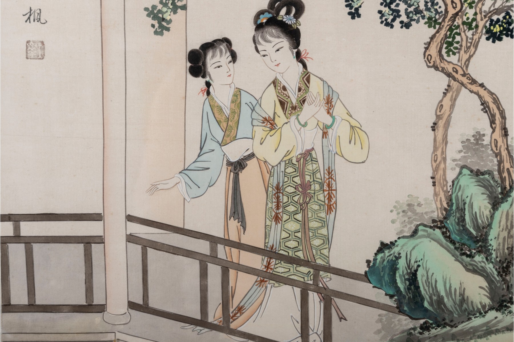 A delightful duo of Chinese paintings on silk depicting beautiful women enjoying conversation in palatial courtyards surrounded by lush nature and rocky outcrops. With written inscriptions and red seals, likely Sing-Yan Choy. The scenes are bordered with cream jacquard patterned trims and displayed in matching honeyed blonde wood frames with faux bamboo designs.