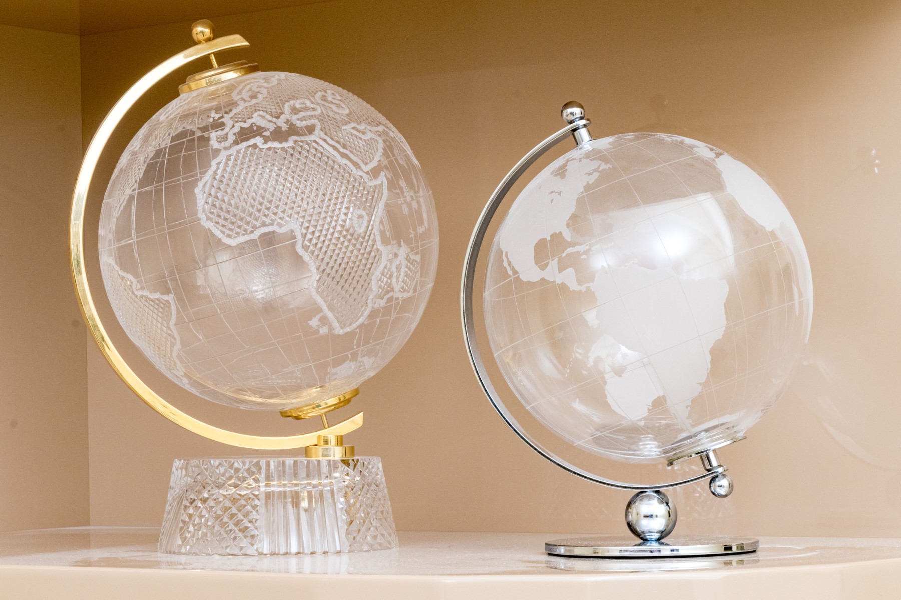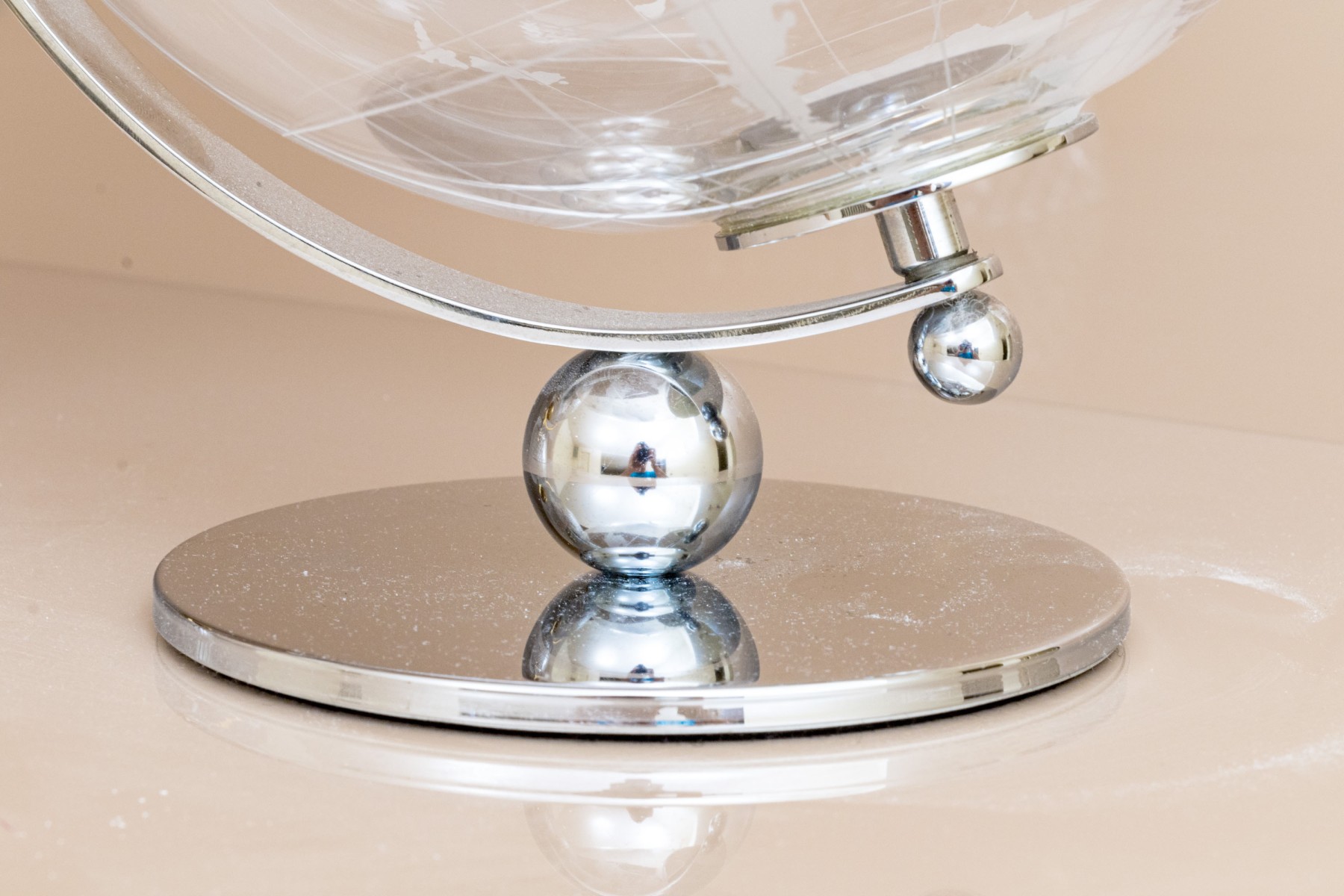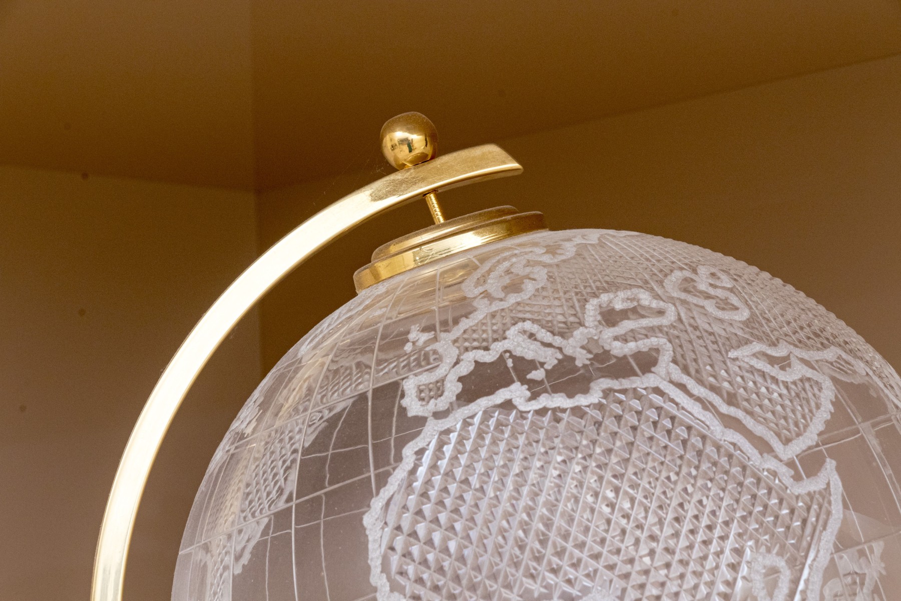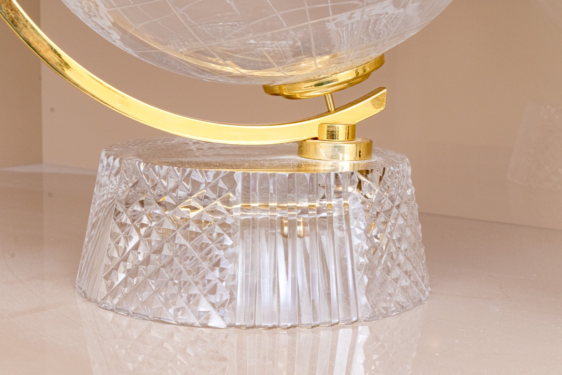 A fabulous duo of elegant tabletop globes in glass and crystal with wonderful mid century and Hollywood Regency appeal. The first is a 1970's globe on a cut crystal base with finely cut and etched designs and gilt accents. The second is a simpler globe on a delightful chrome base.