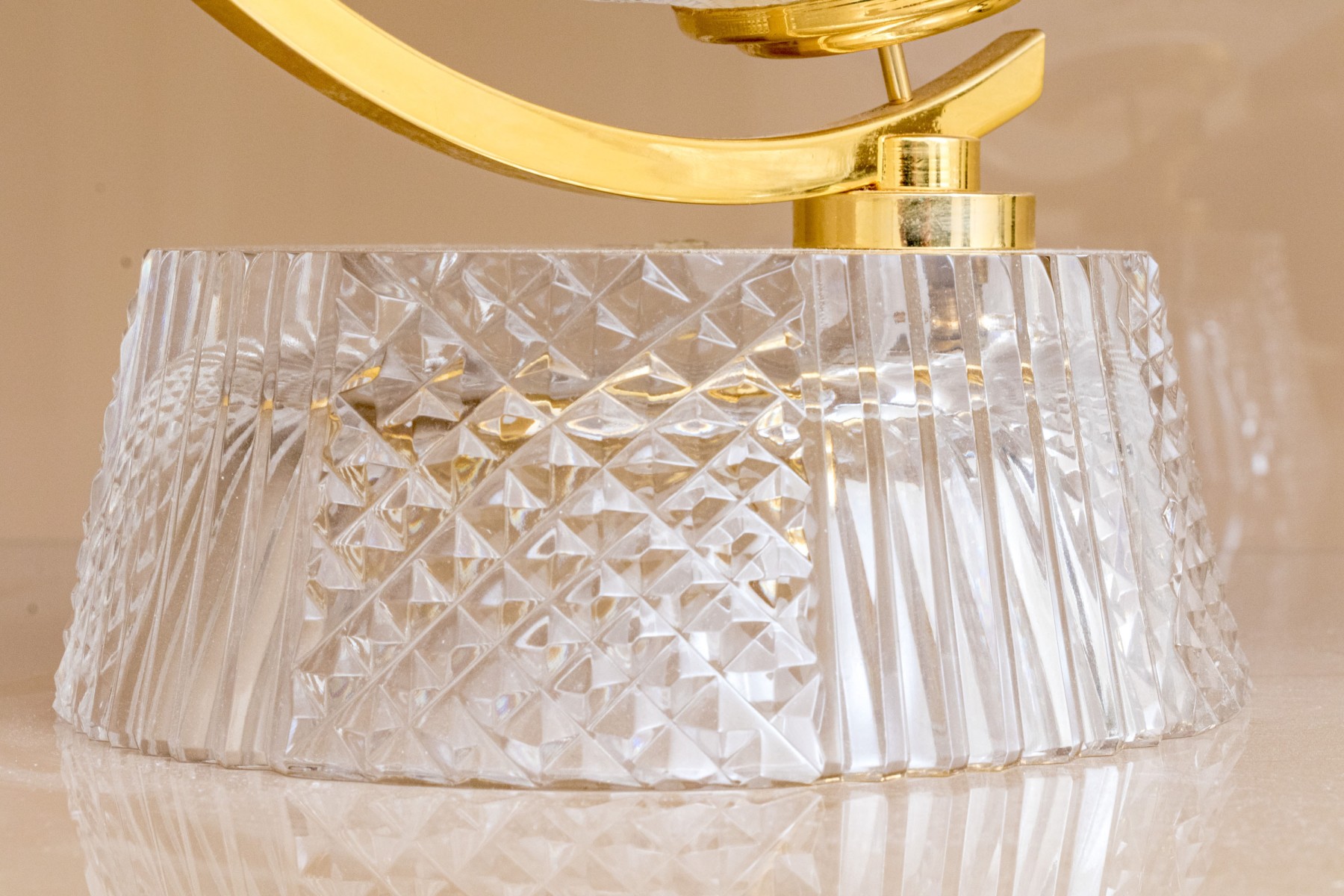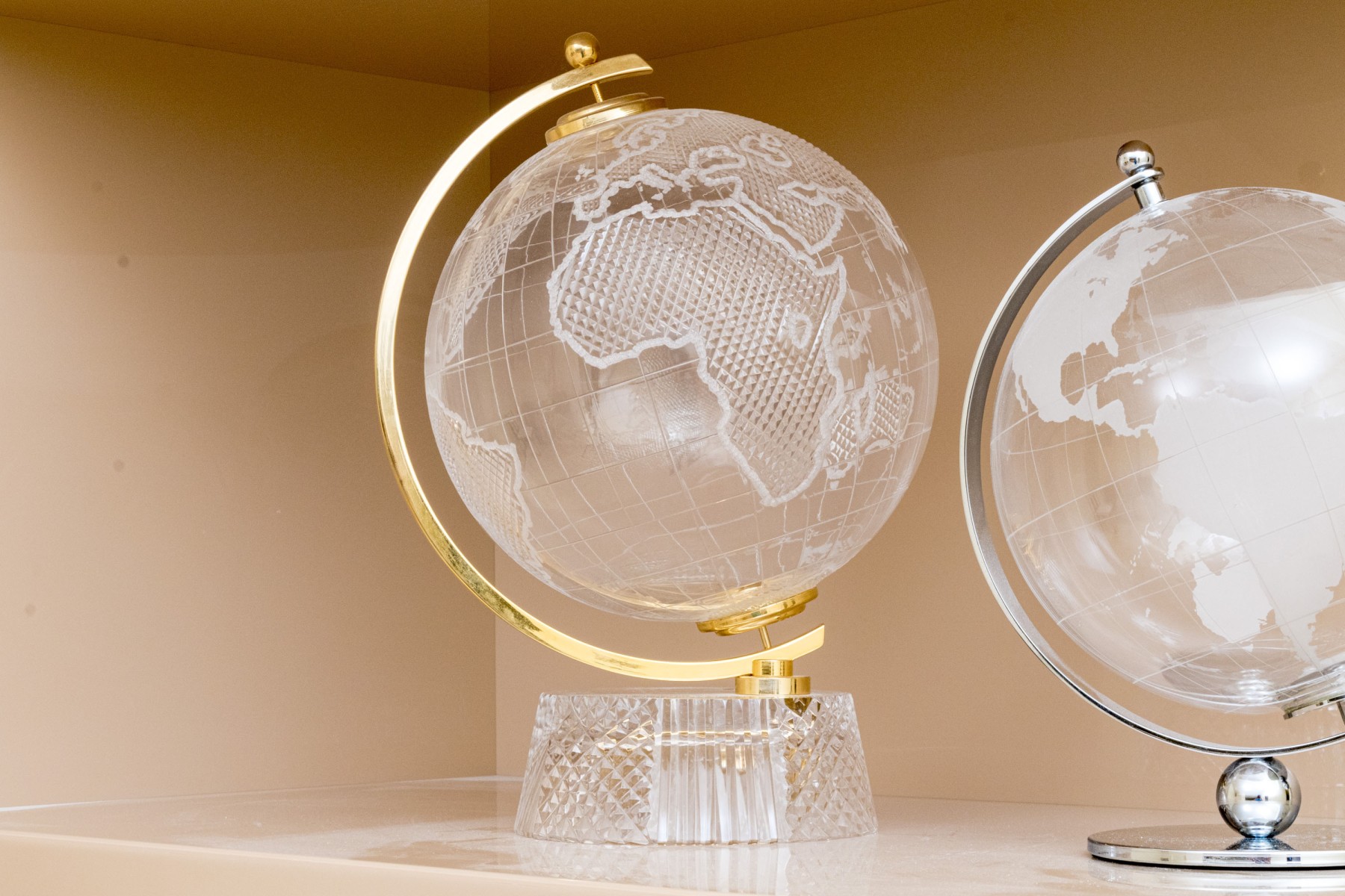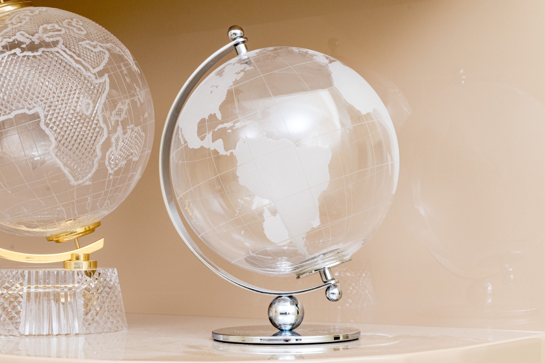 A fabulous duo of elegant tabletop globes in glass and crystal with wonderful mid century and Hollywood Regency appeal. The first is a 1970's globe on a cut crystal base with finely cut and etched designs and gilt accents. The second is a simpler globe on a delightful chrome base.