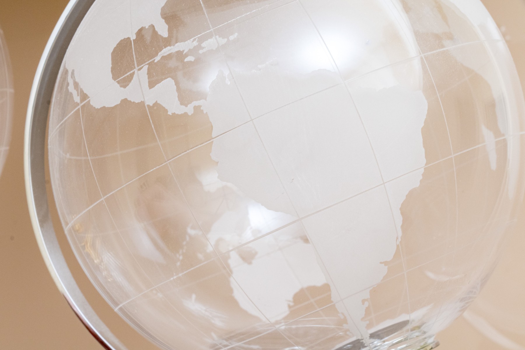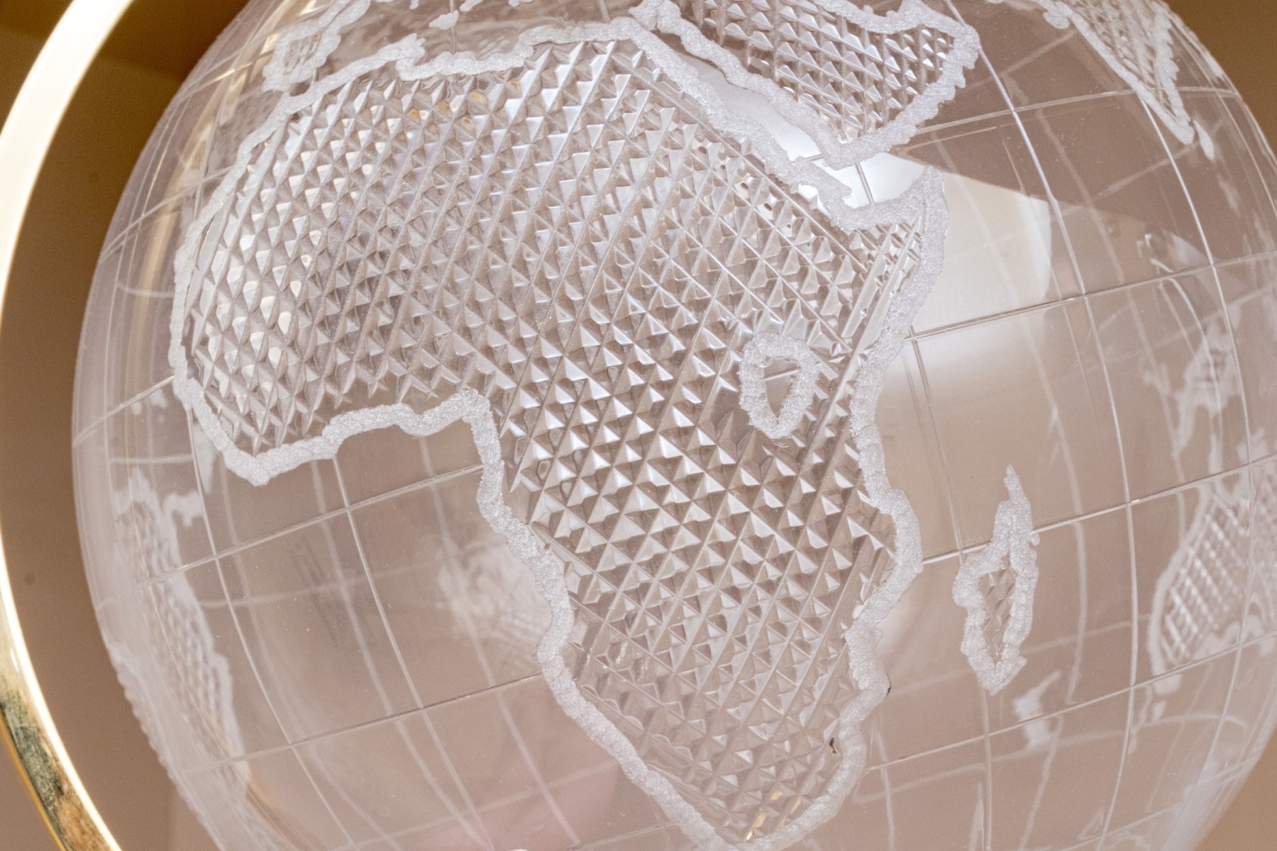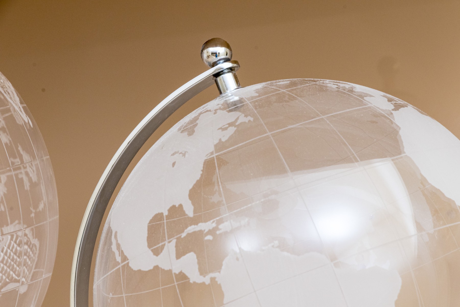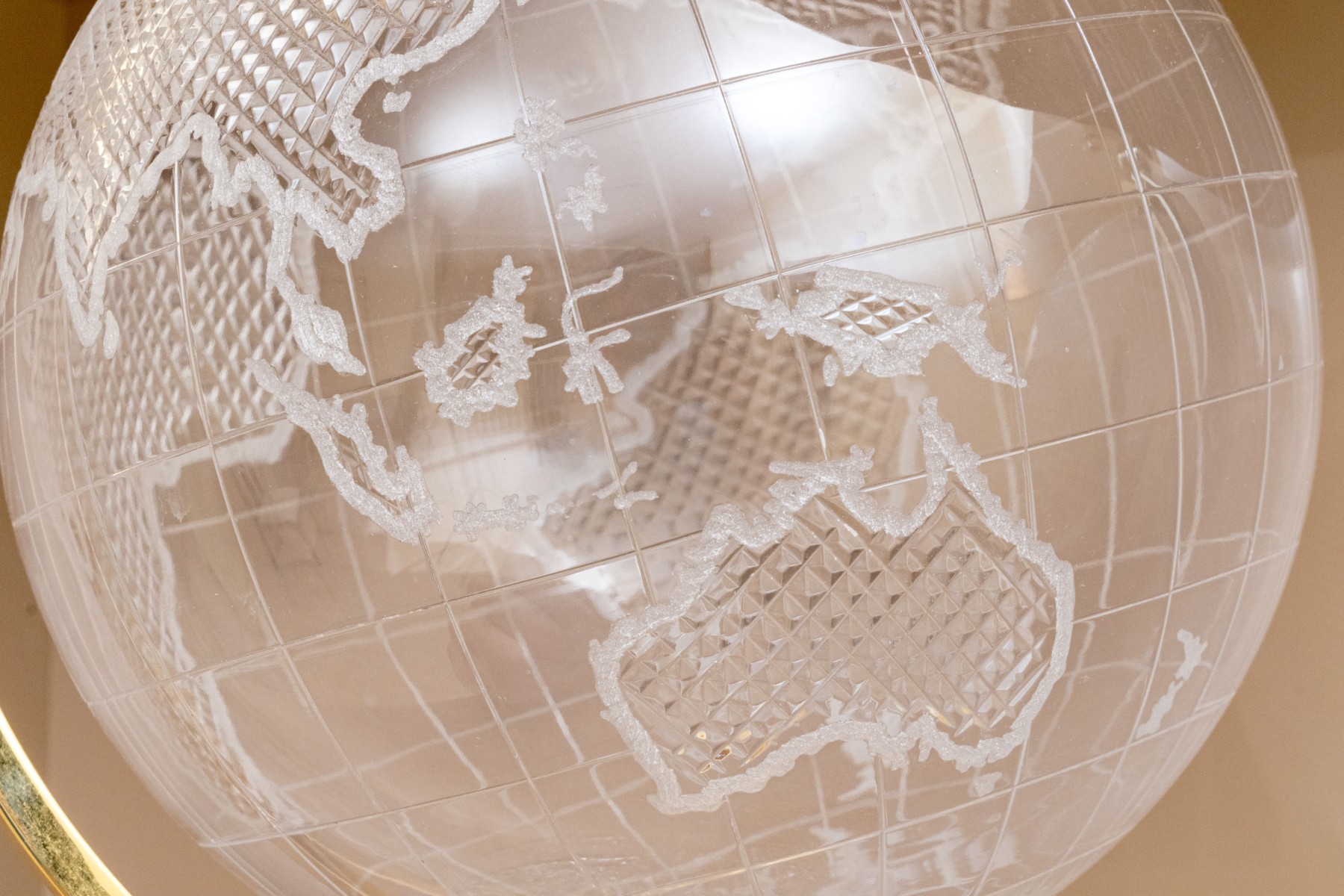 A fabulous duo of elegant tabletop globes in glass and crystal with wonderful mid century and Hollywood Regency appeal. The first is a 1970's globe on a cut crystal base with finely cut and etched designs and gilt accents. The second is a simpler globe on a delightful chrome base.