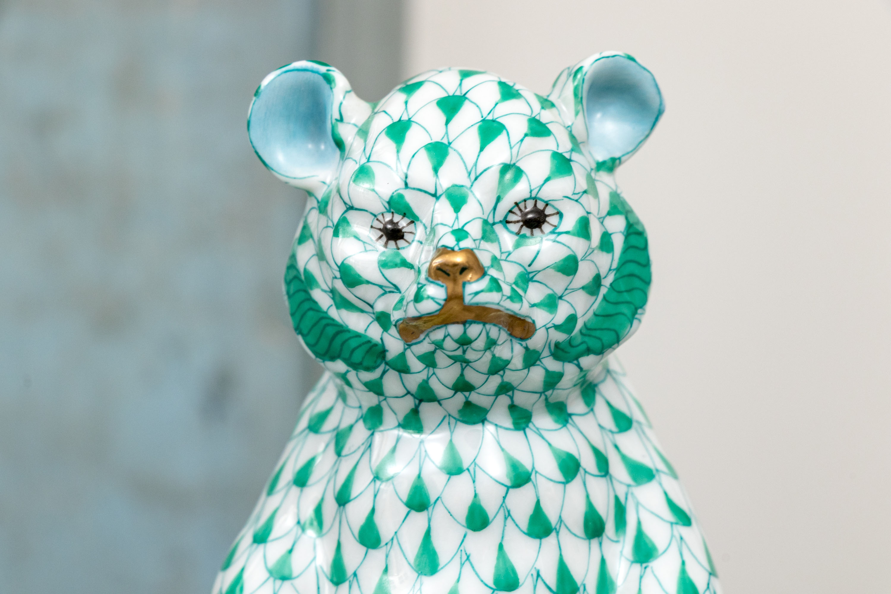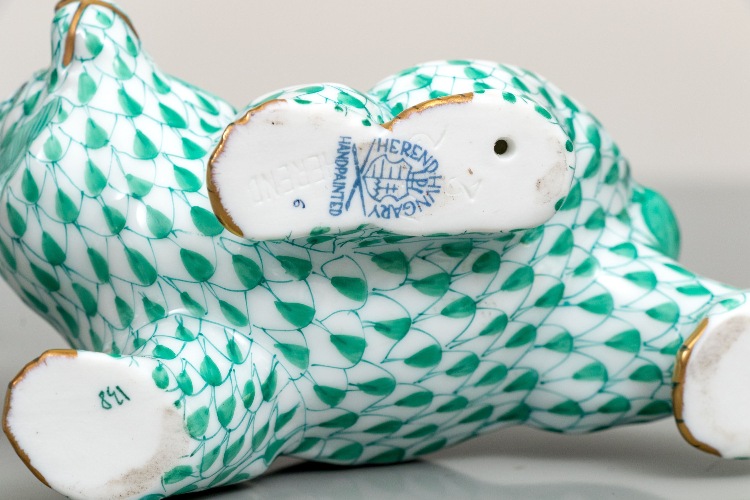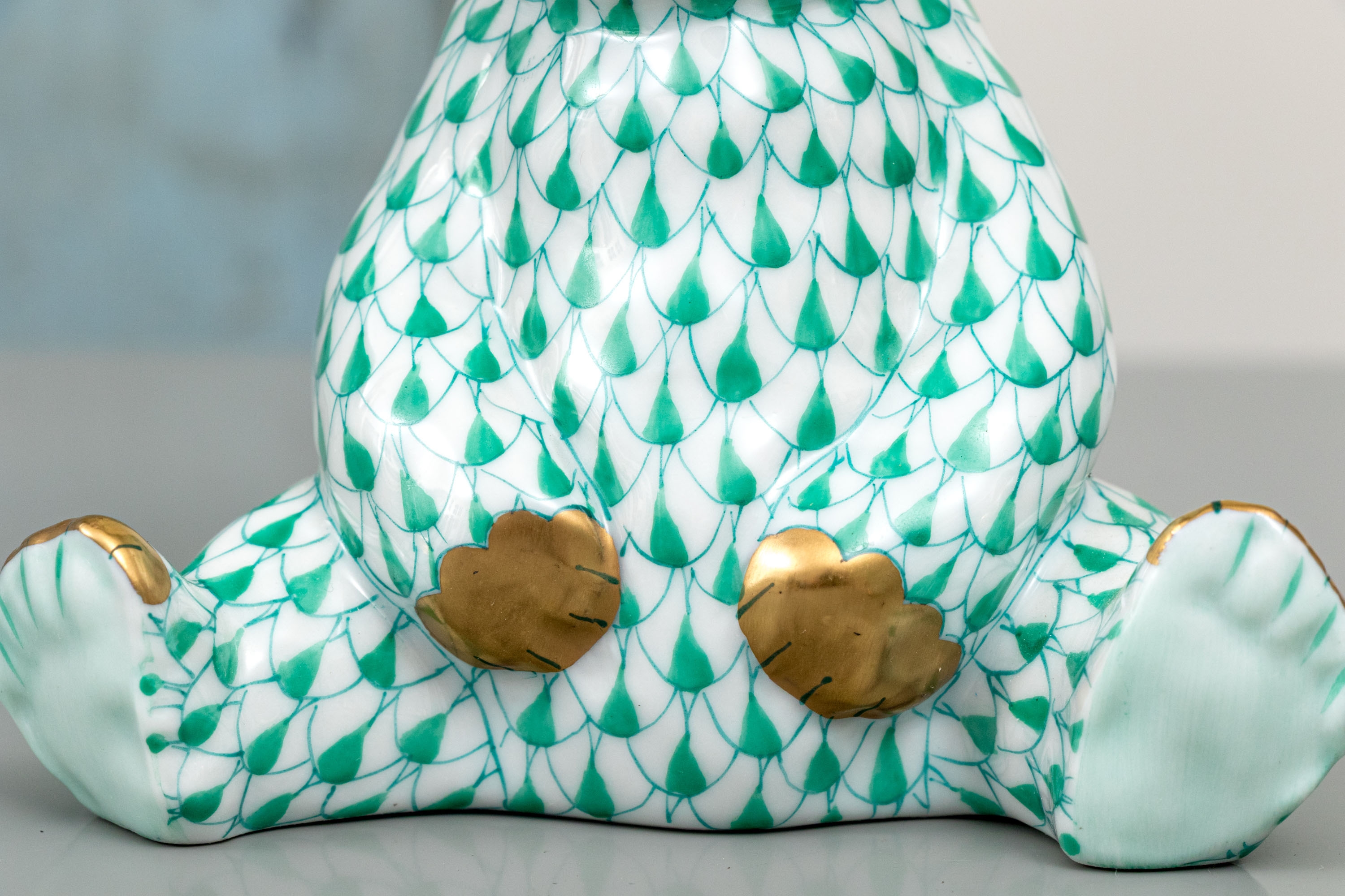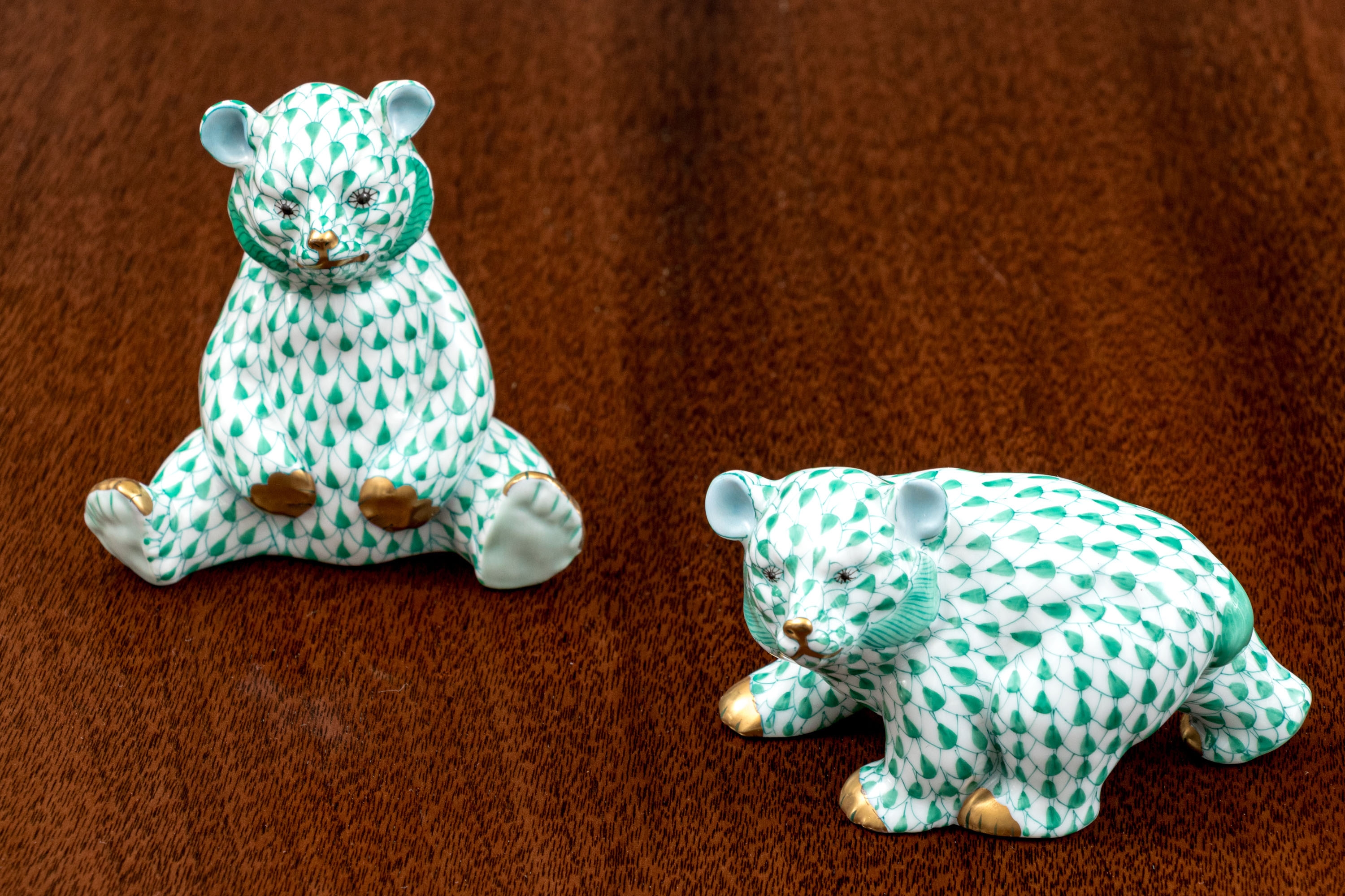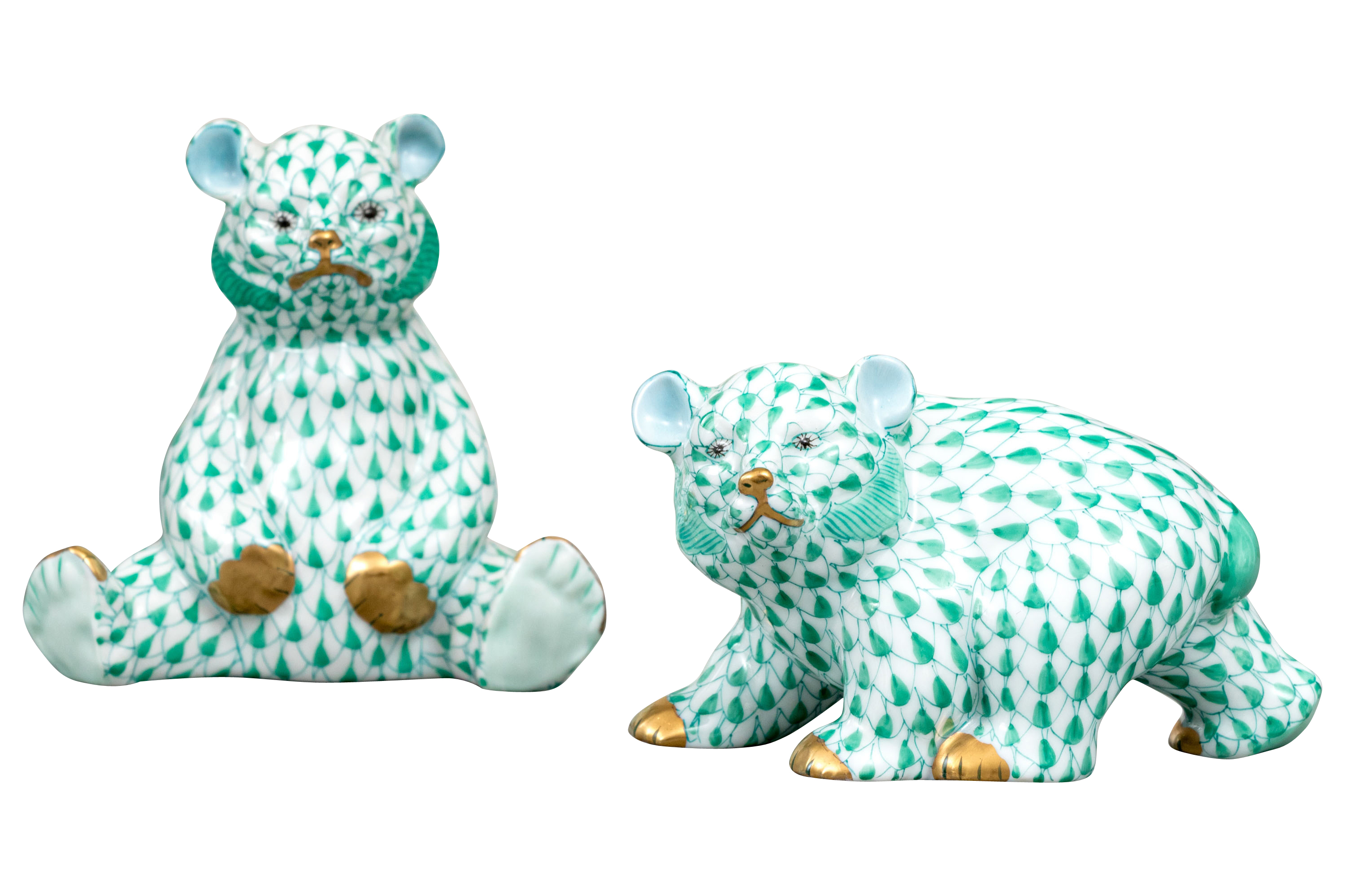 Herend Hungary porcelain bears, each exquisitely hand-painted in the iconic green fishnet (VHV) pattern with 24K gold accents. This delightful duo features one seated bear and one crouching bear. Each piece displays delicate teardrop-scale brushwork in shades of emerald and mint green over a glossy white glaze. The bears’ snouts, paws, and inner ears are finished in soft pastel tones, with gold-enriched paws and muzzles.