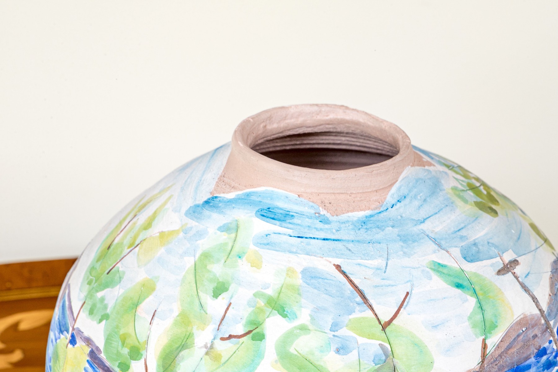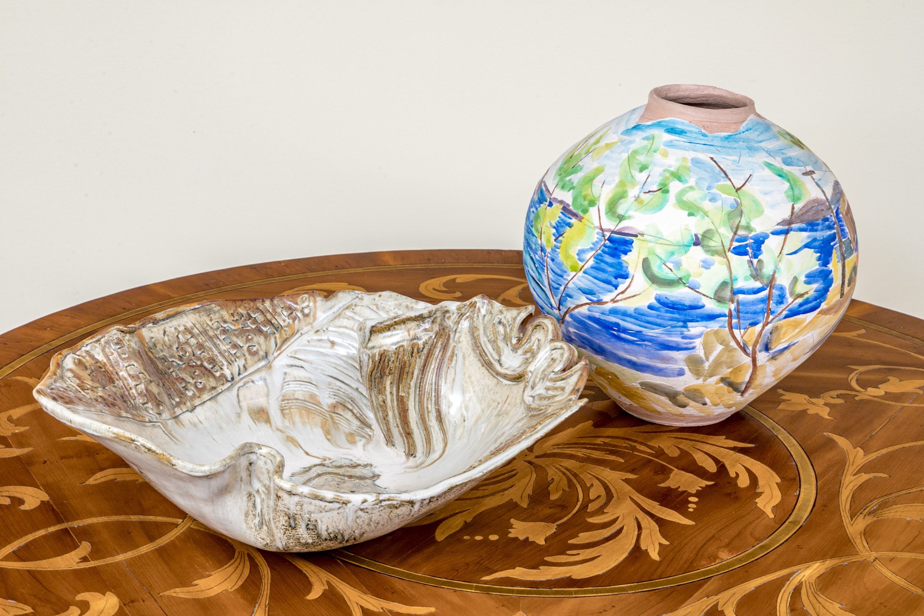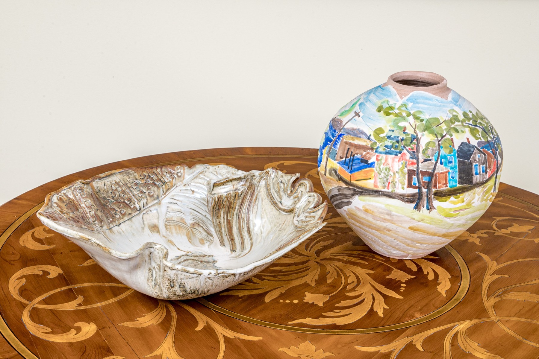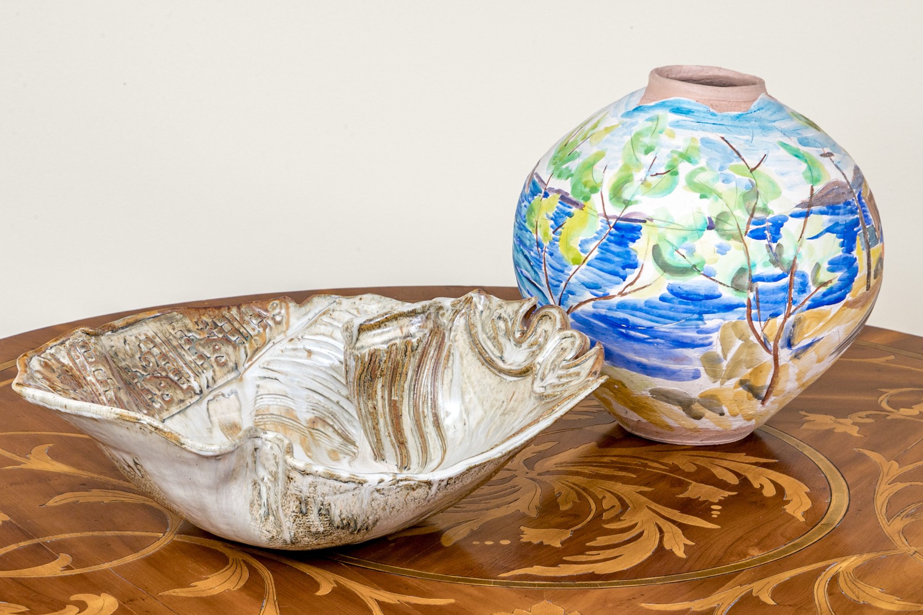 A wonderful assembled duo of studio pottery vessels. Includes a textural centerpiece bowl with an organic freeform body reminiscent of a clam shell, glazed in swirling white and brown. Accompanied by a pot or jar with an apple-shaped body hand-painted with an impressionist landscape of a lake lined by vibrant, green trees.