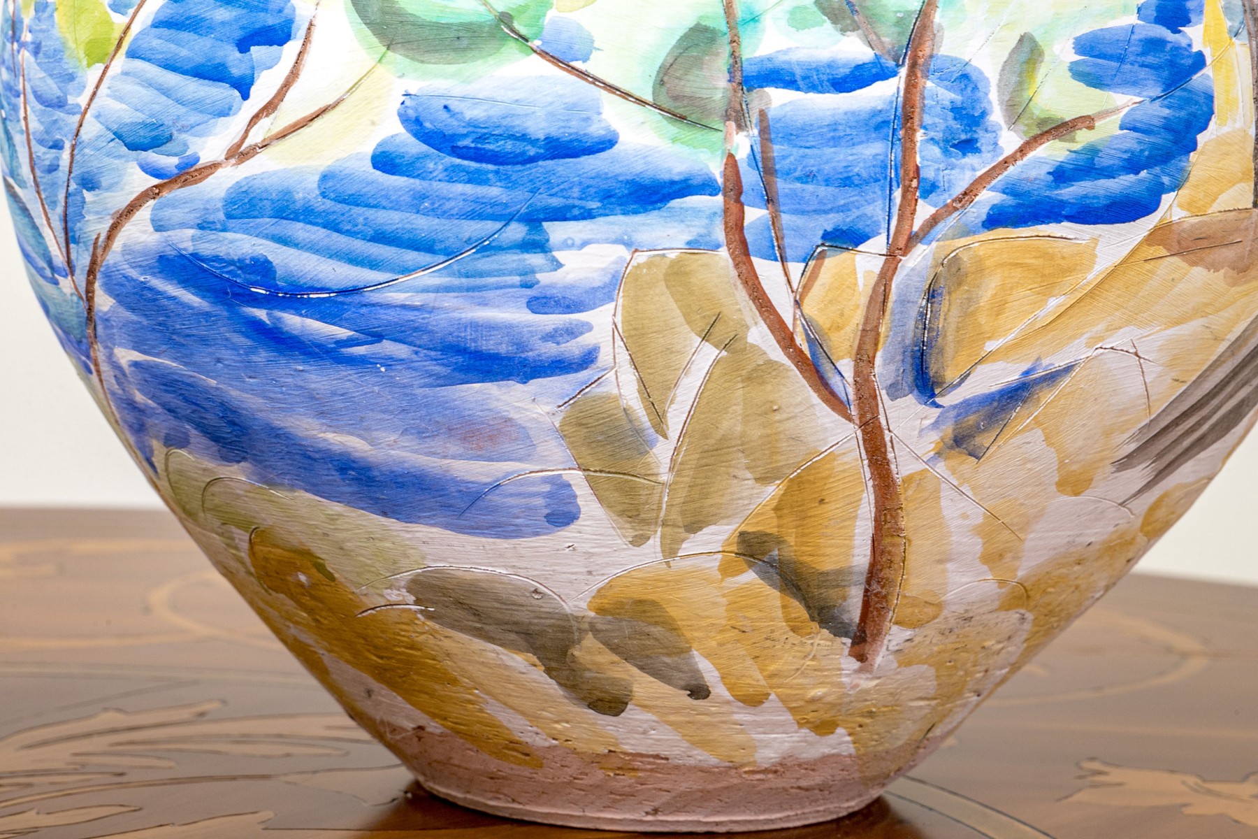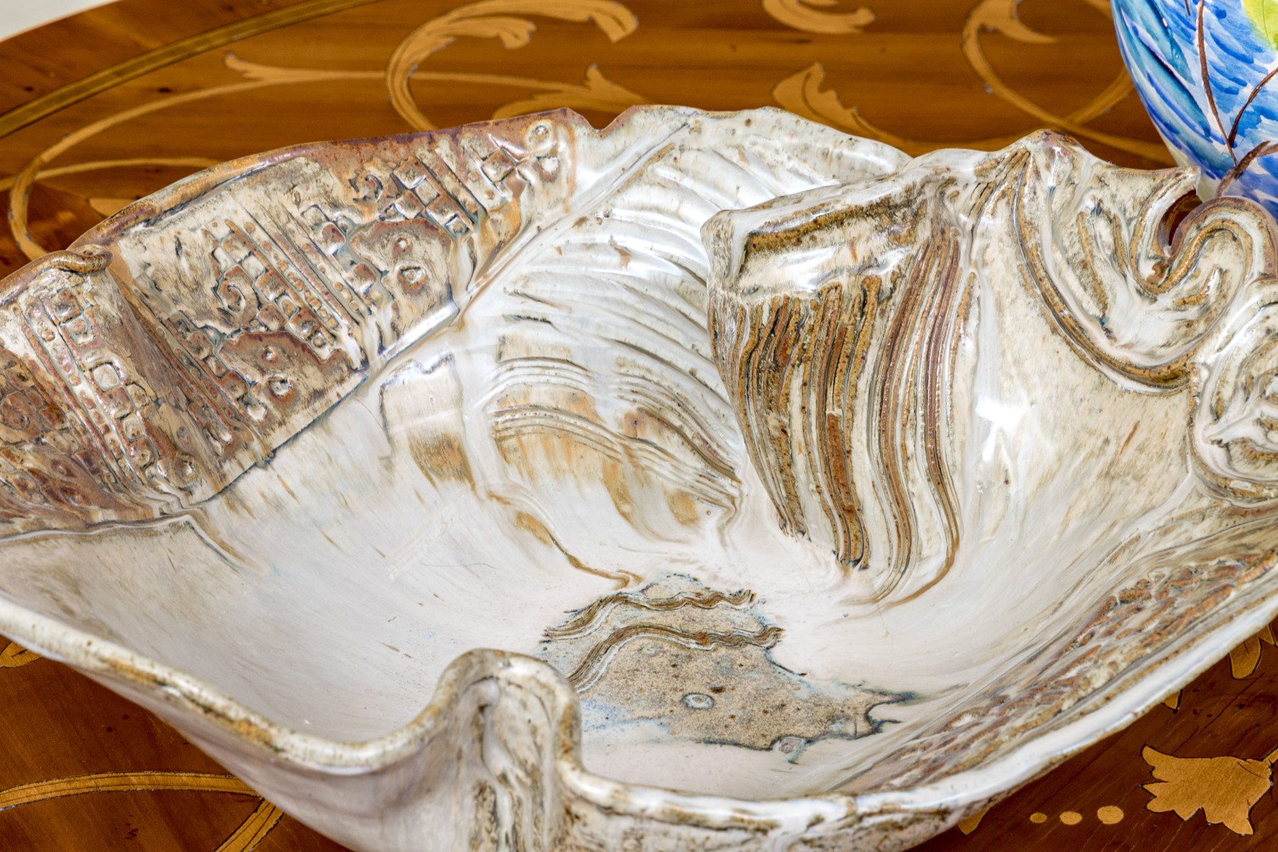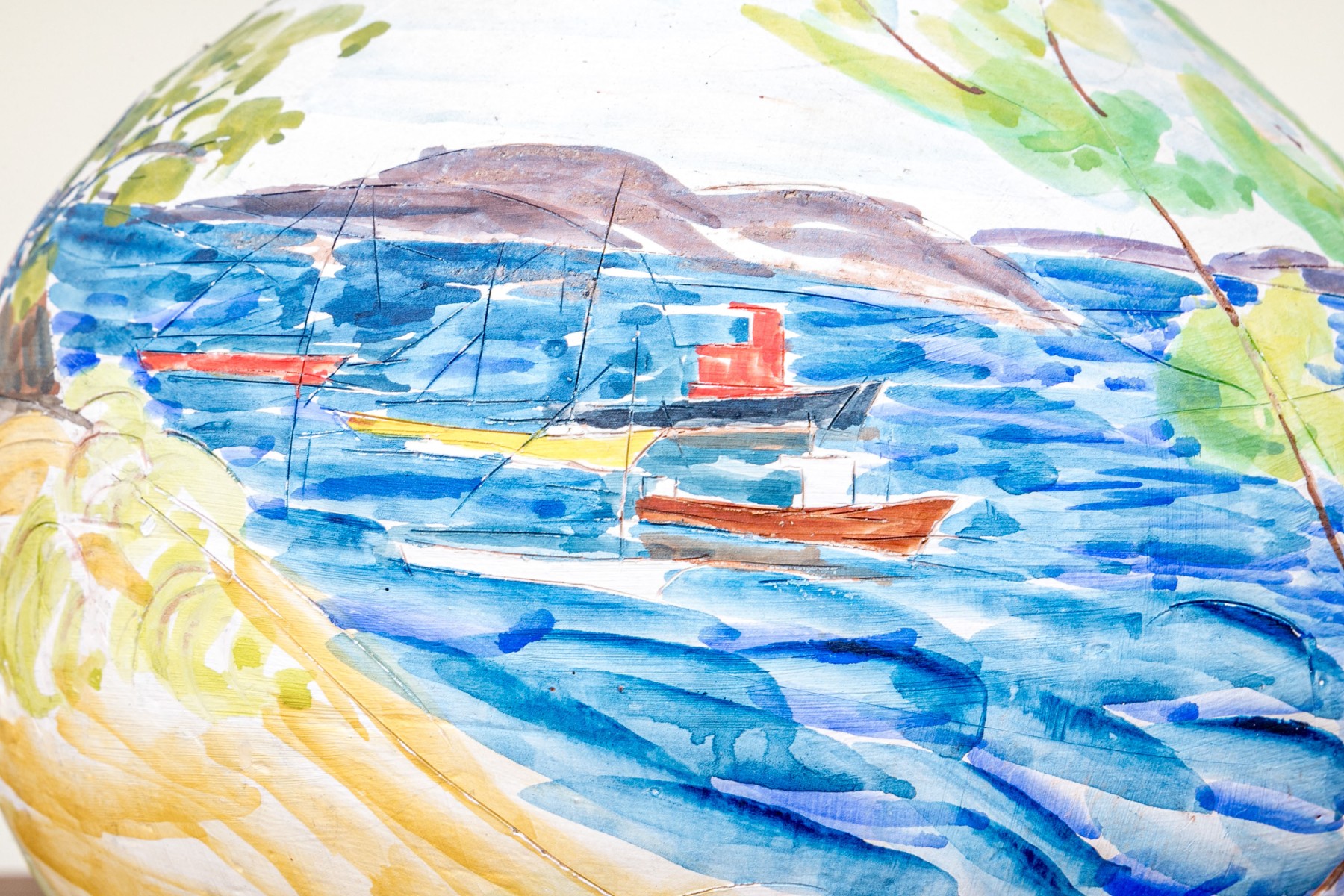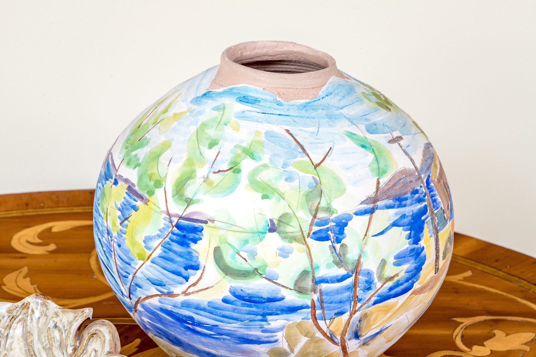 A wonderful assembled duo of studio pottery vessels. Includes a textural centerpiece bowl with an organic freeform body reminiscent of a clam shell, glazed in swirling white and brown. Accompanied by a pot or jar with an apple-shaped body hand-painted with an impressionist landscape of a lake lined by vibrant, green trees.