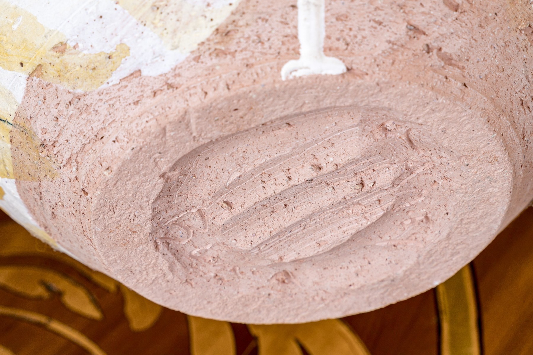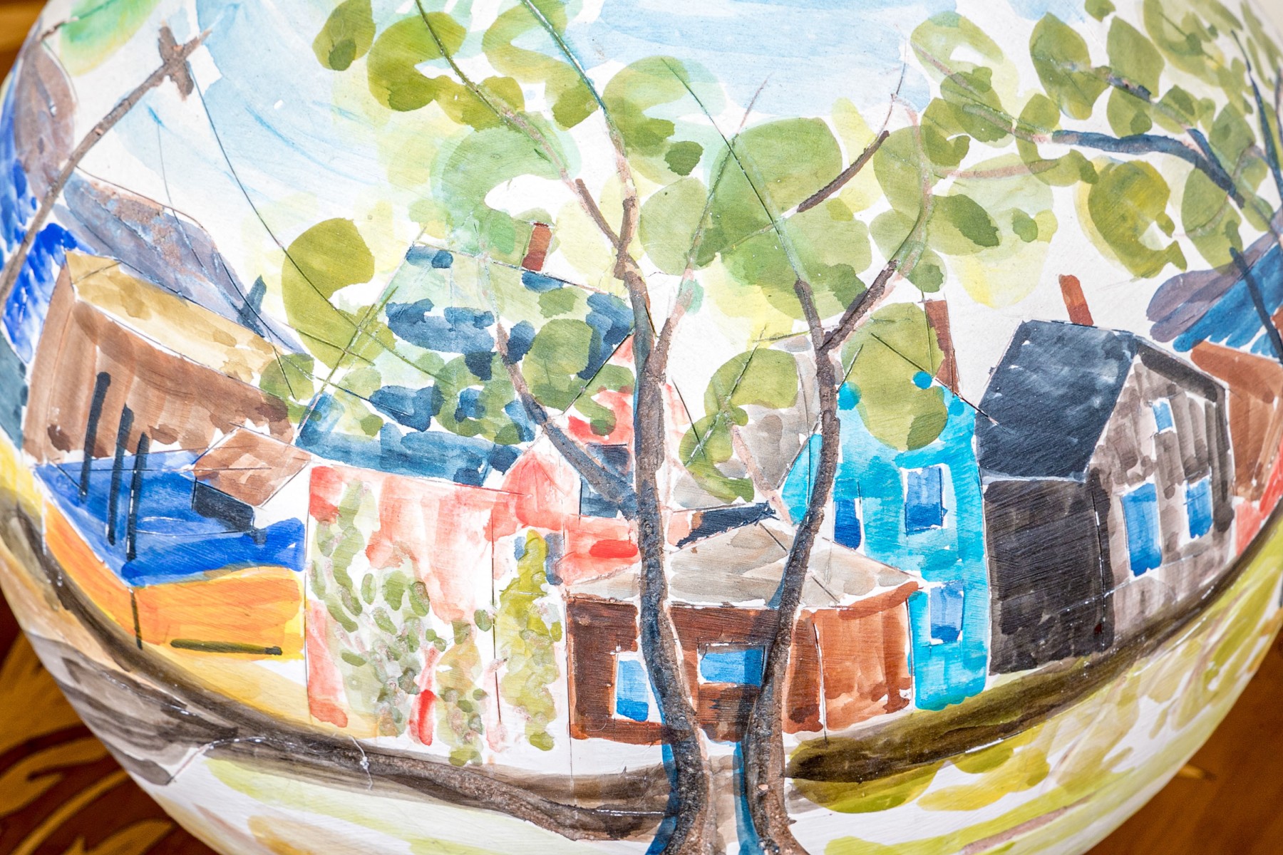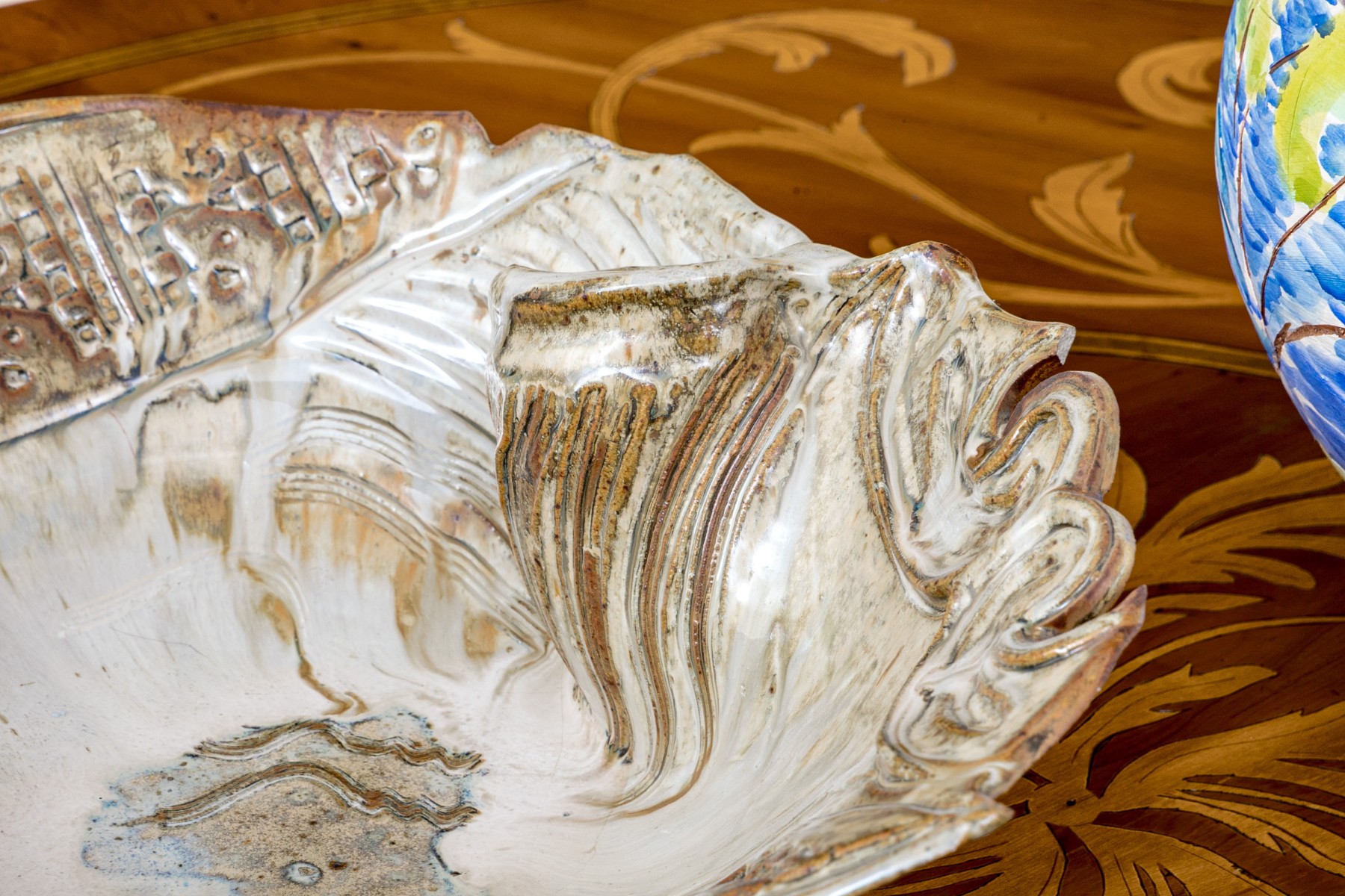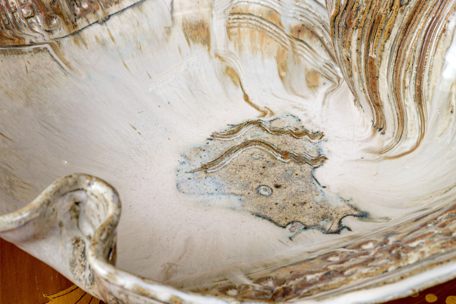 A wonderful assembled duo of studio pottery vessels. Includes a textural centerpiece bowl with an organic freeform body reminiscent of a clam shell, glazed in swirling white and brown. Accompanied by a pot or jar with an apple-shaped body hand-painted with an impressionist landscape of a lake lined by vibrant, green trees.