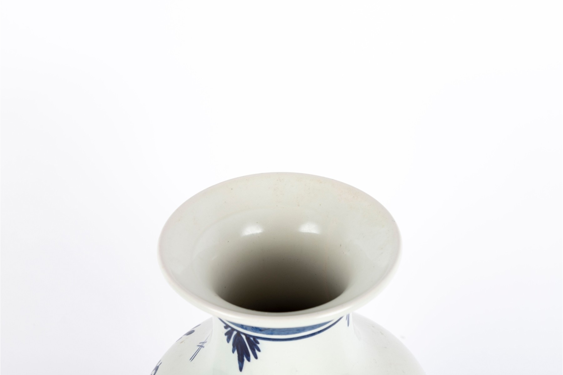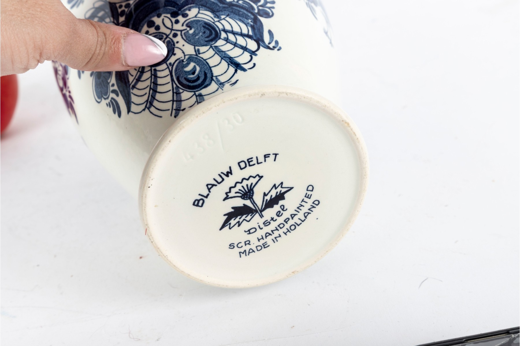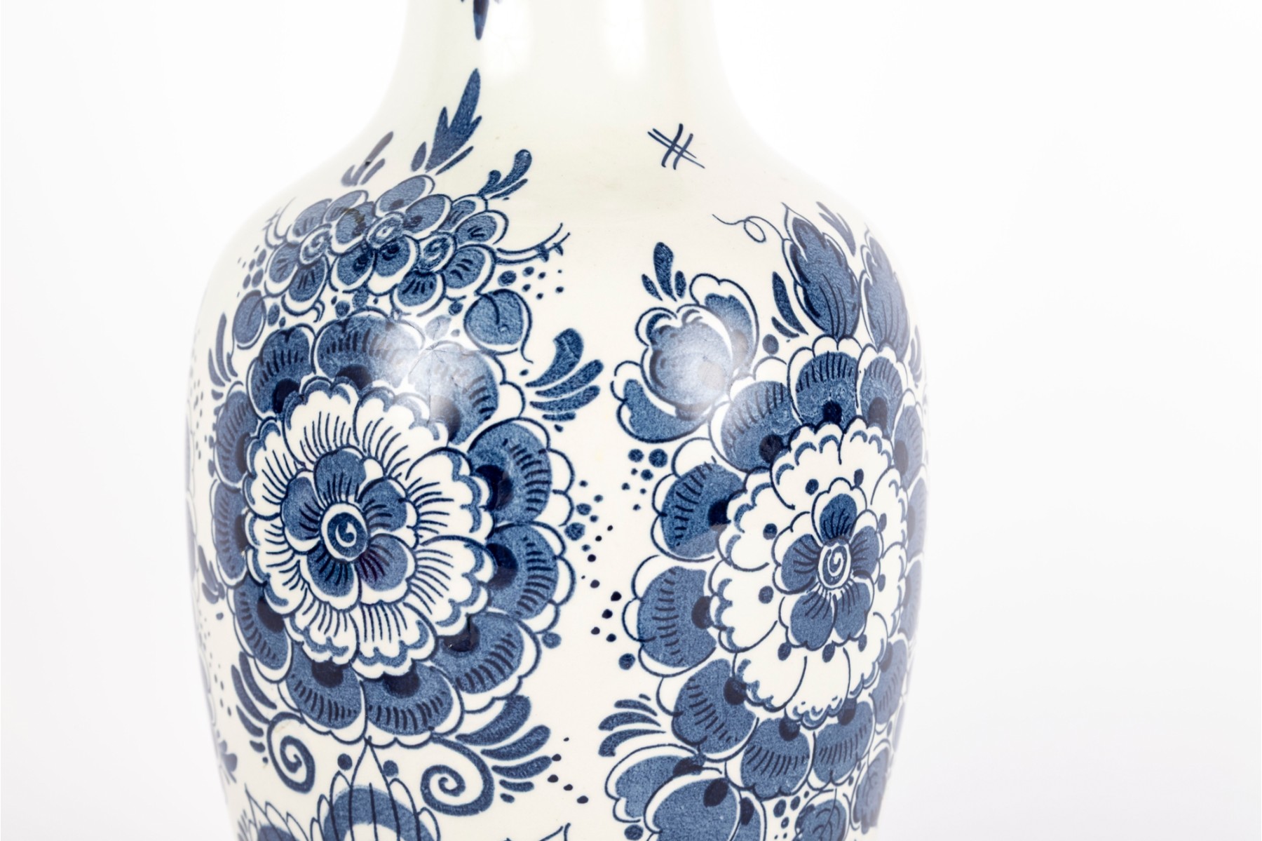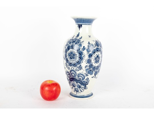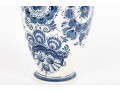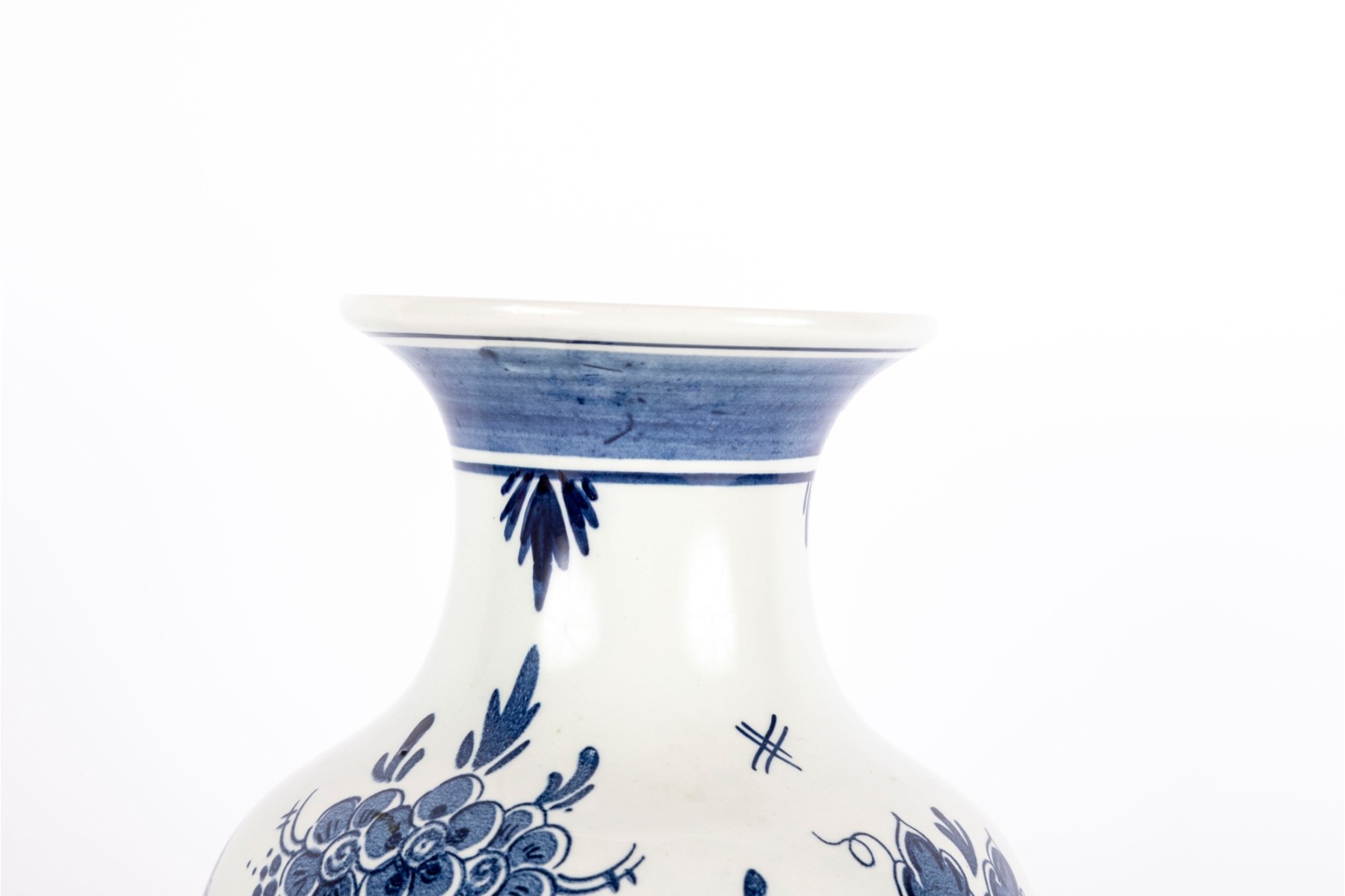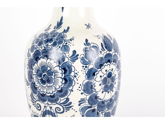 A fabulous Distel "Blauw Delft" ceramic vase showcasing a flared rim over a short cylindrical neck over an elongated ovoid body with a circular foot. Beautifully hand-decorated with large concentric blue florals and blue striped bands. Marked underfoot.