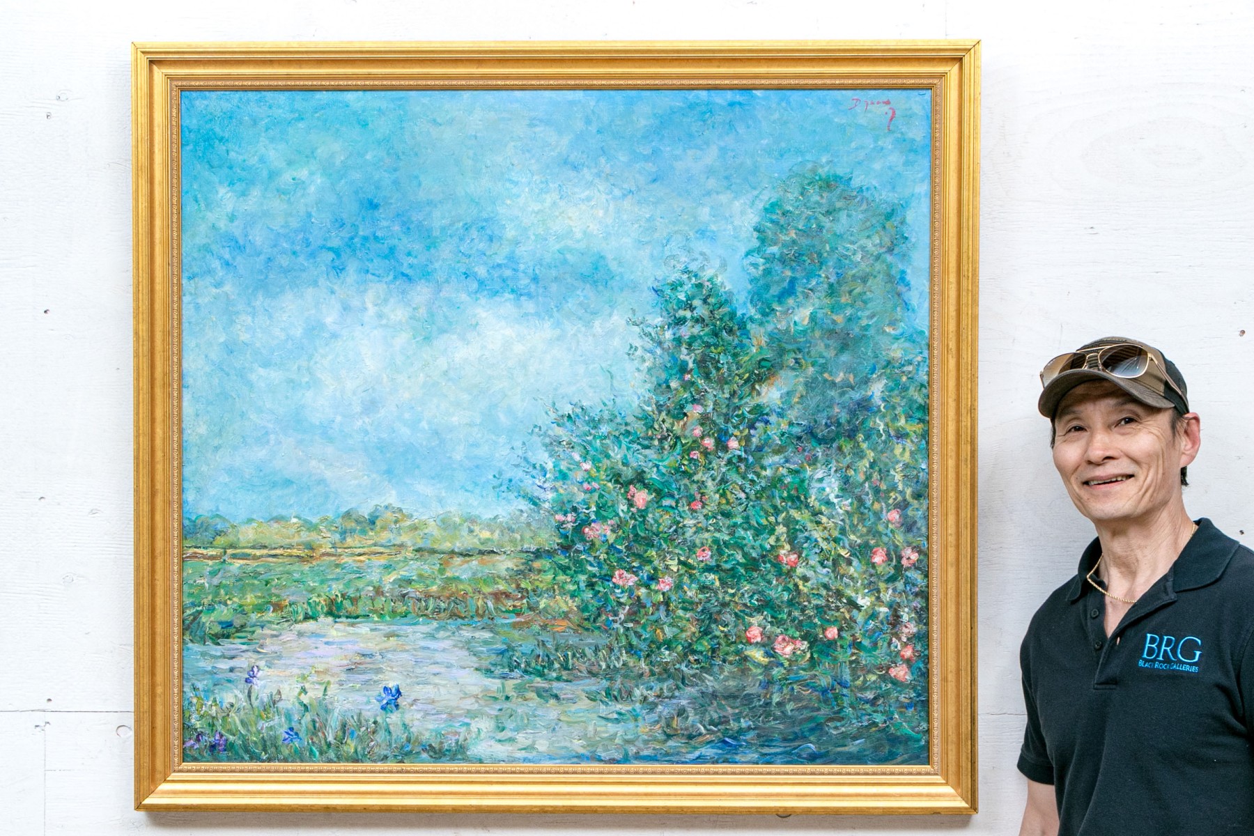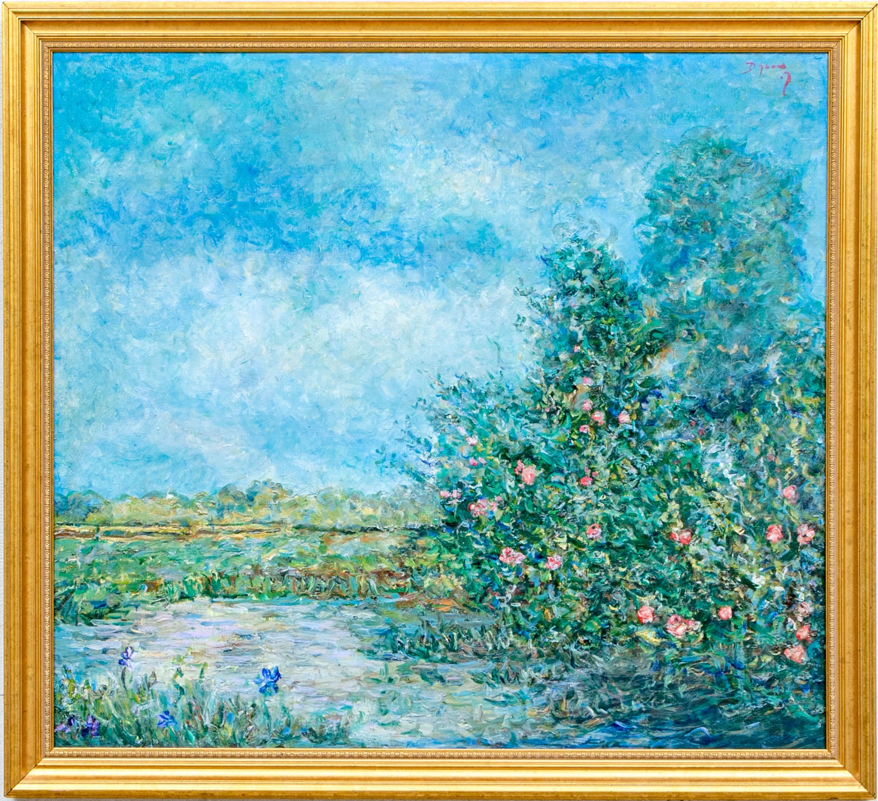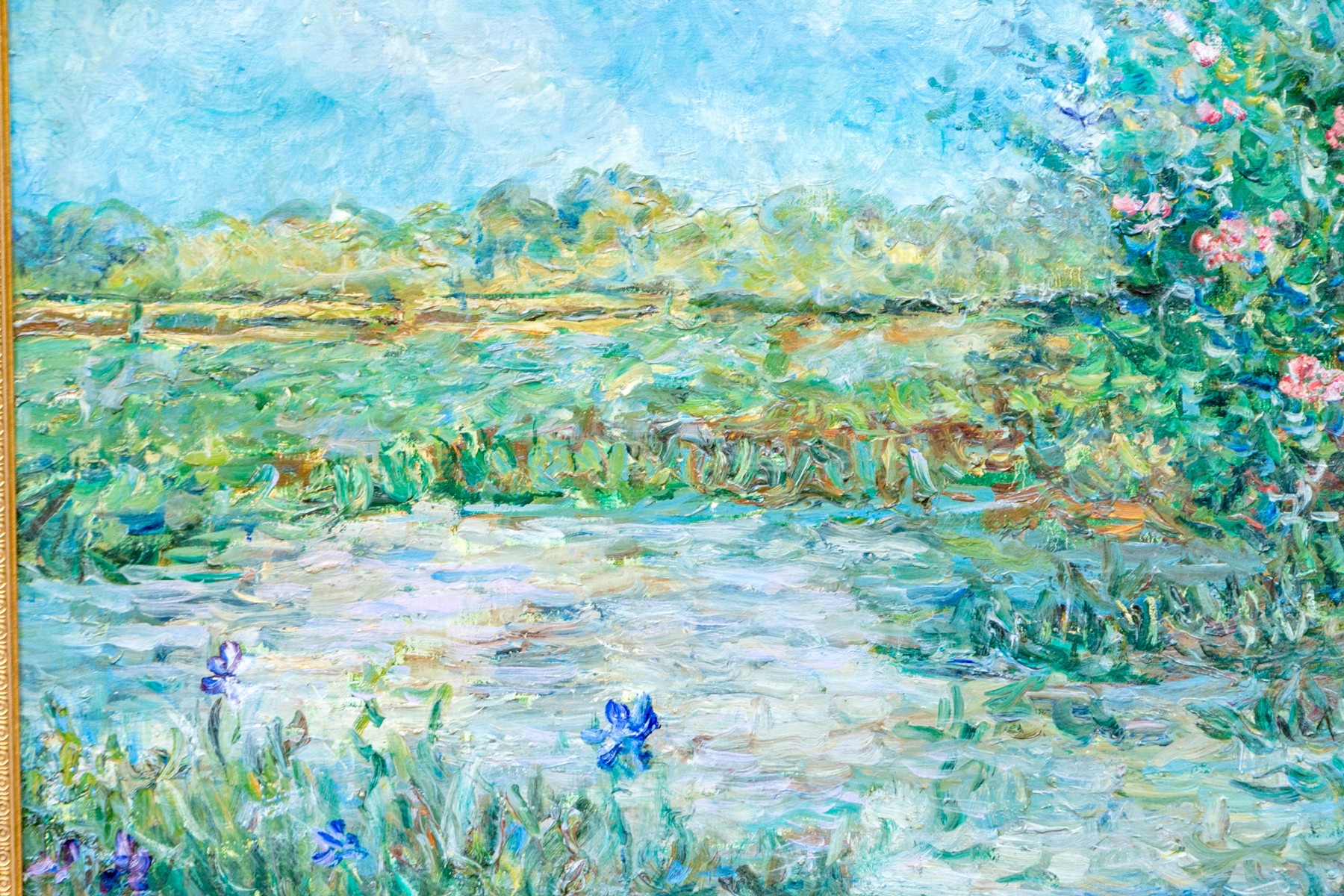 Signed upper right. Lush pink flowering foliage at the border of the marsh with green grasses and hills beyond. All under a lovely blue summer sky. Presented in a gilt frame.