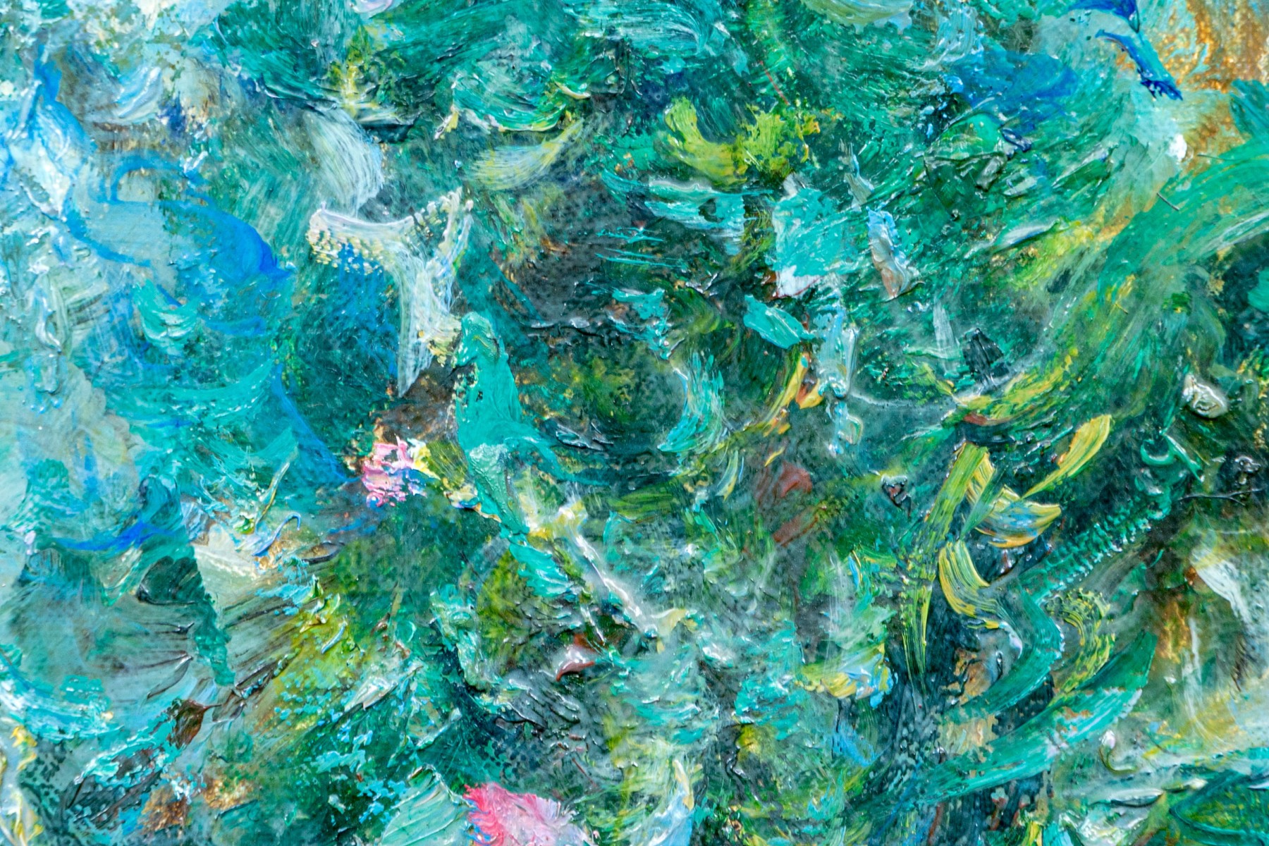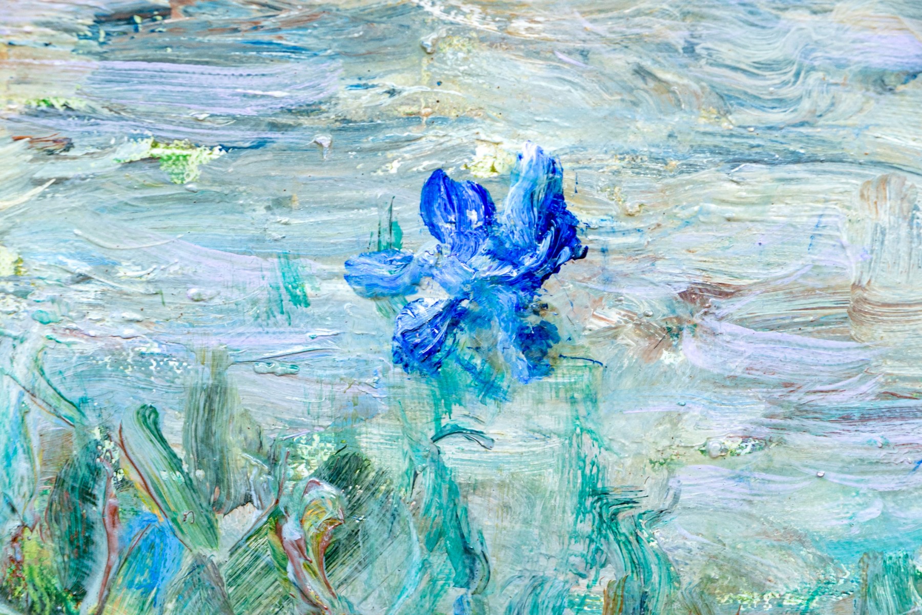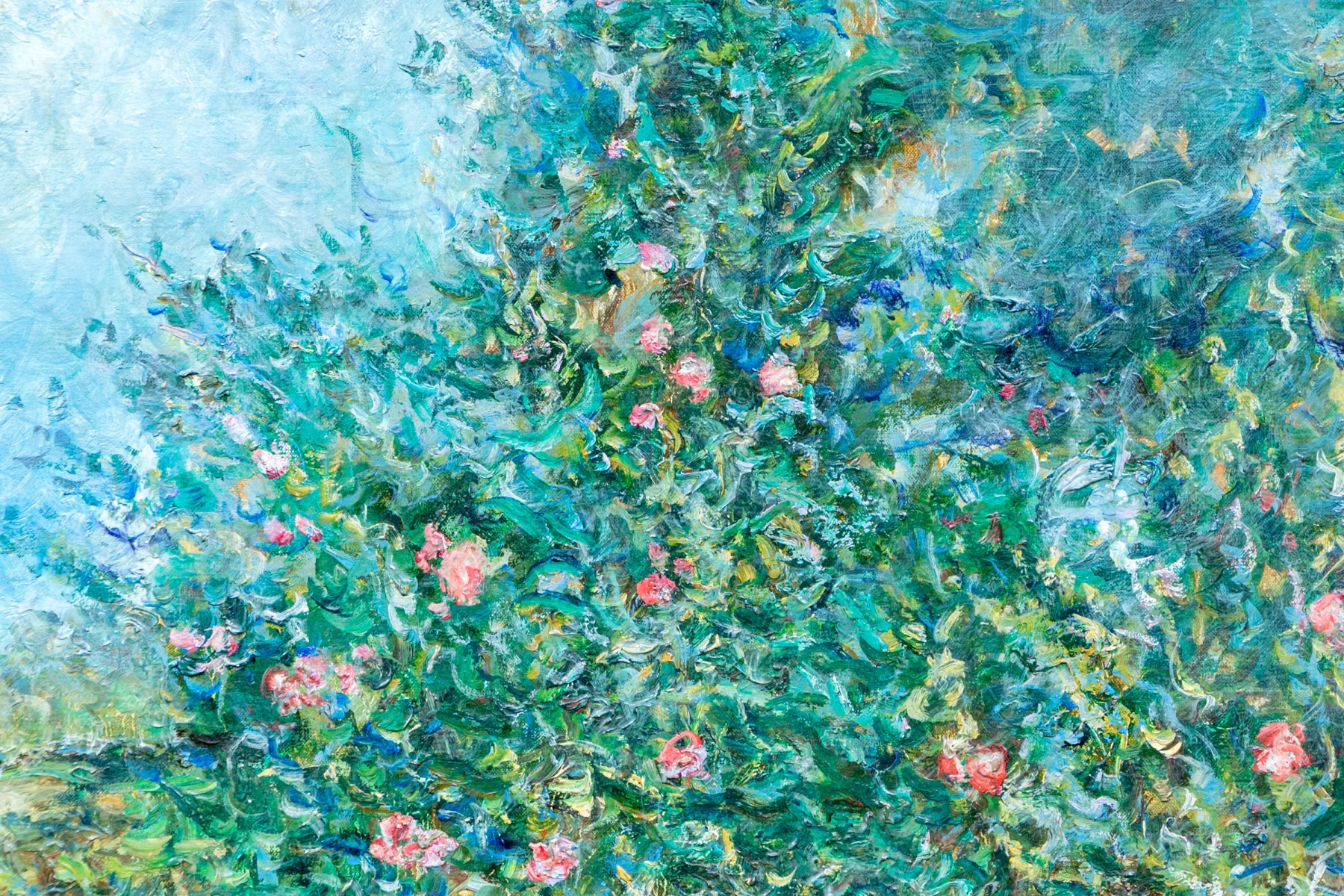 Signed upper right. Lush pink flowering foliage at the border of the marsh with green grasses and hills beyond. All under a lovely blue summer sky. Presented in a gilt frame.