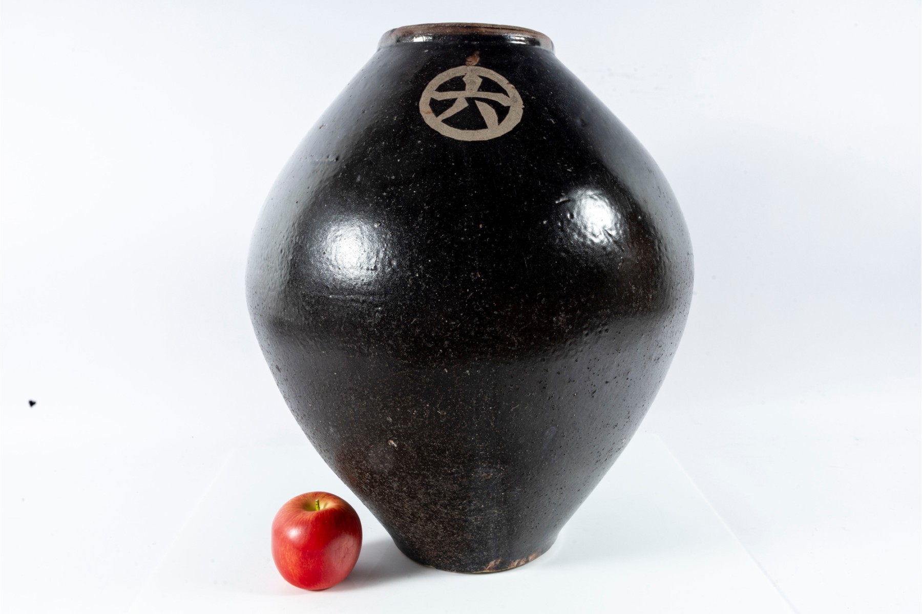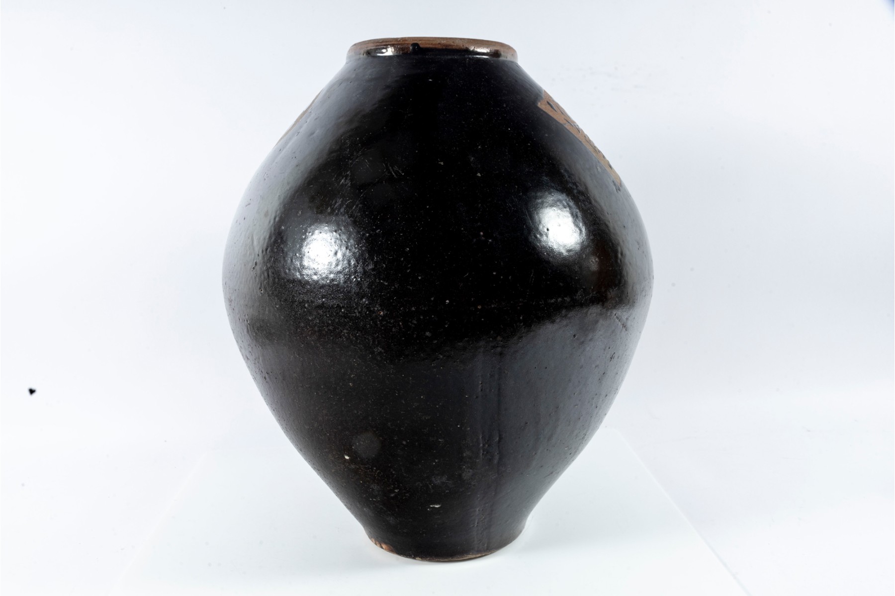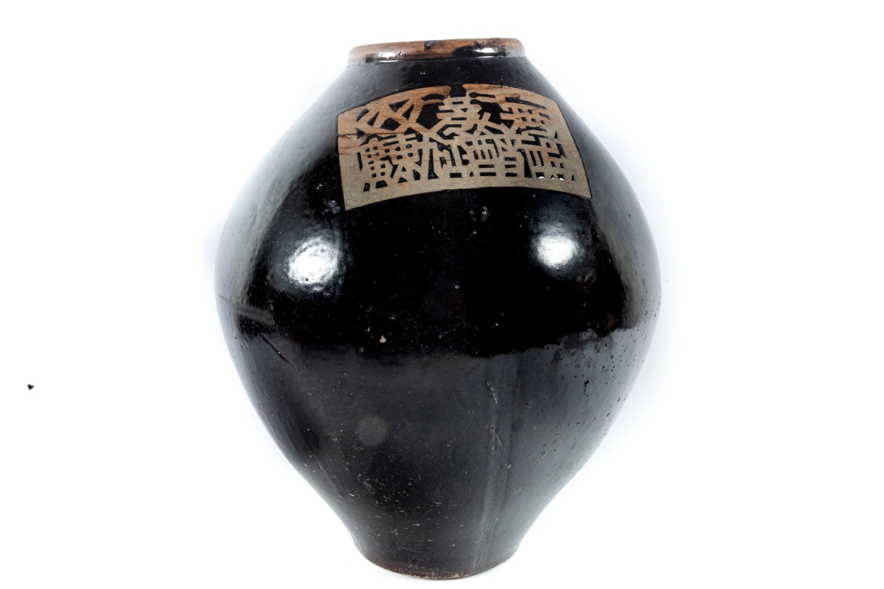 This early 20th-century ceramic jar is formed in a traditional shape meant for storing wine and spirits. The jar has a wonderfully balanced, oblong form accentuated by an all-over dark brown glaze. The product and maker's name is written in bare earthenware reliefs near the top.