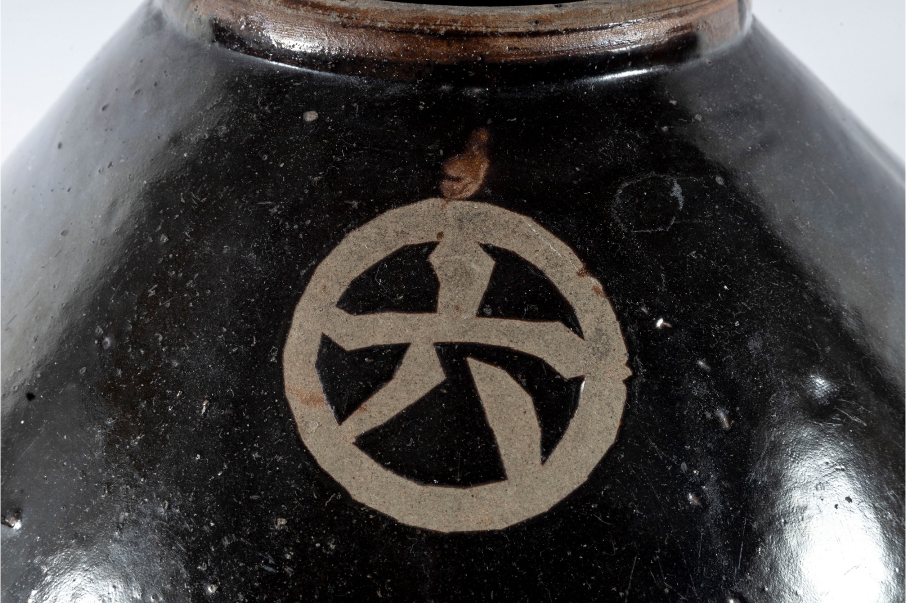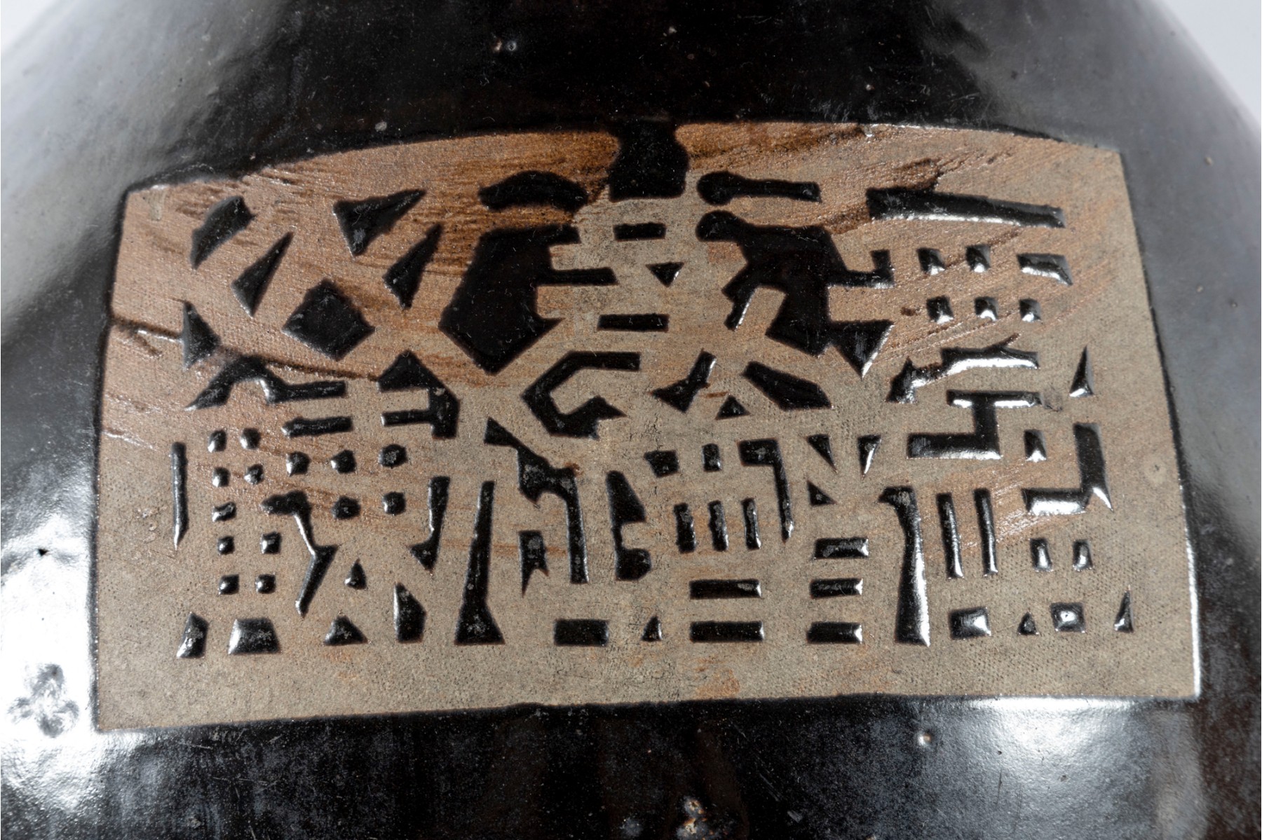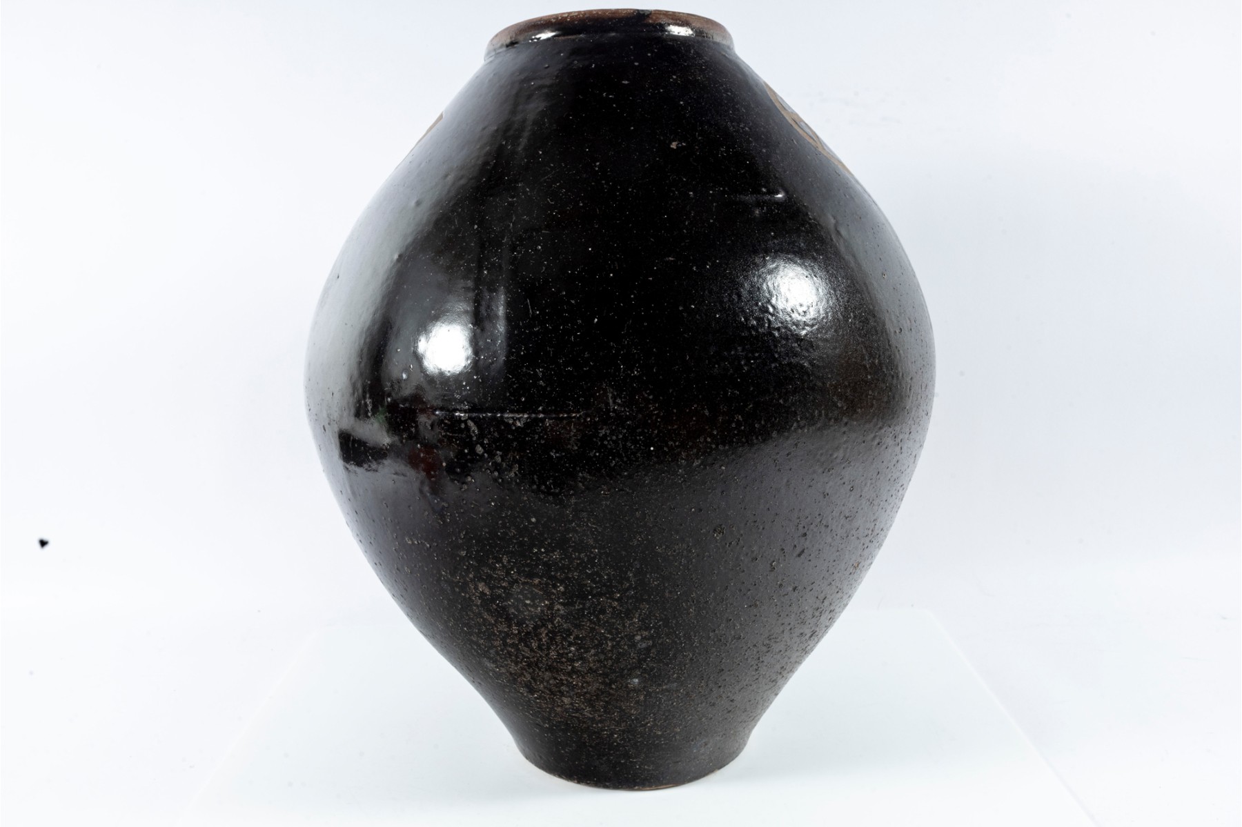 This early 20th-century ceramic jar is formed in a traditional shape meant for storing wine and spirits. The jar has a wonderfully balanced, oblong form accentuated by an all-over dark brown glaze. The product and maker's name is written in bare earthenware reliefs near the top.