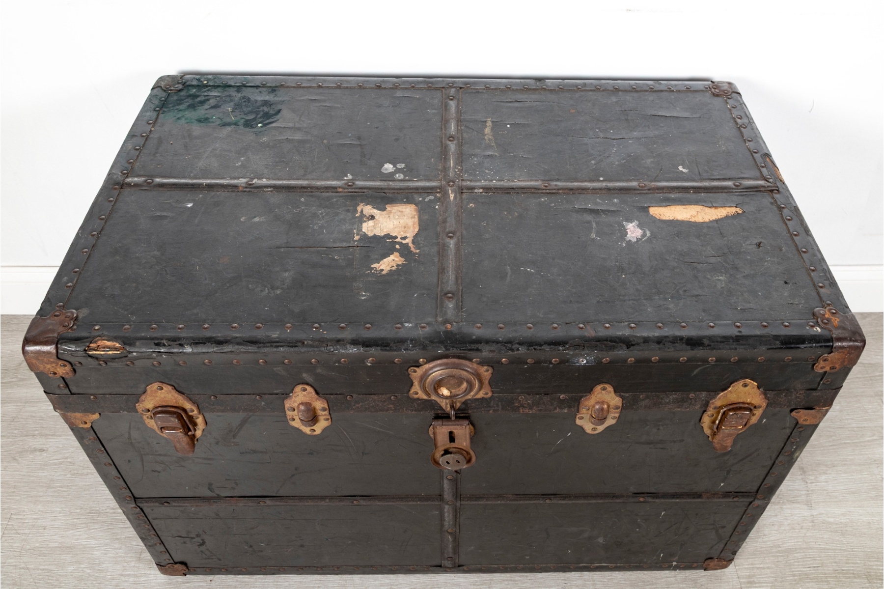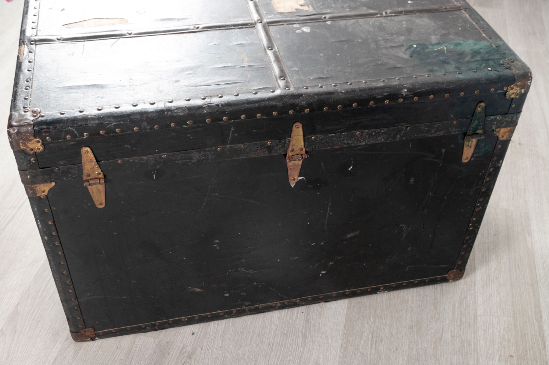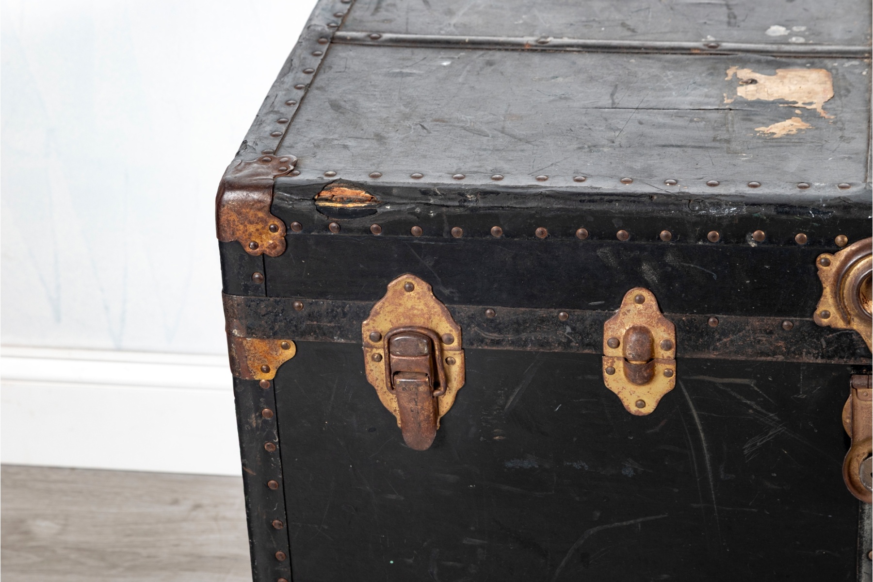 Early 20th-century black-painted steamer trunk with riveted trim, metal hardware, and original interior lining.