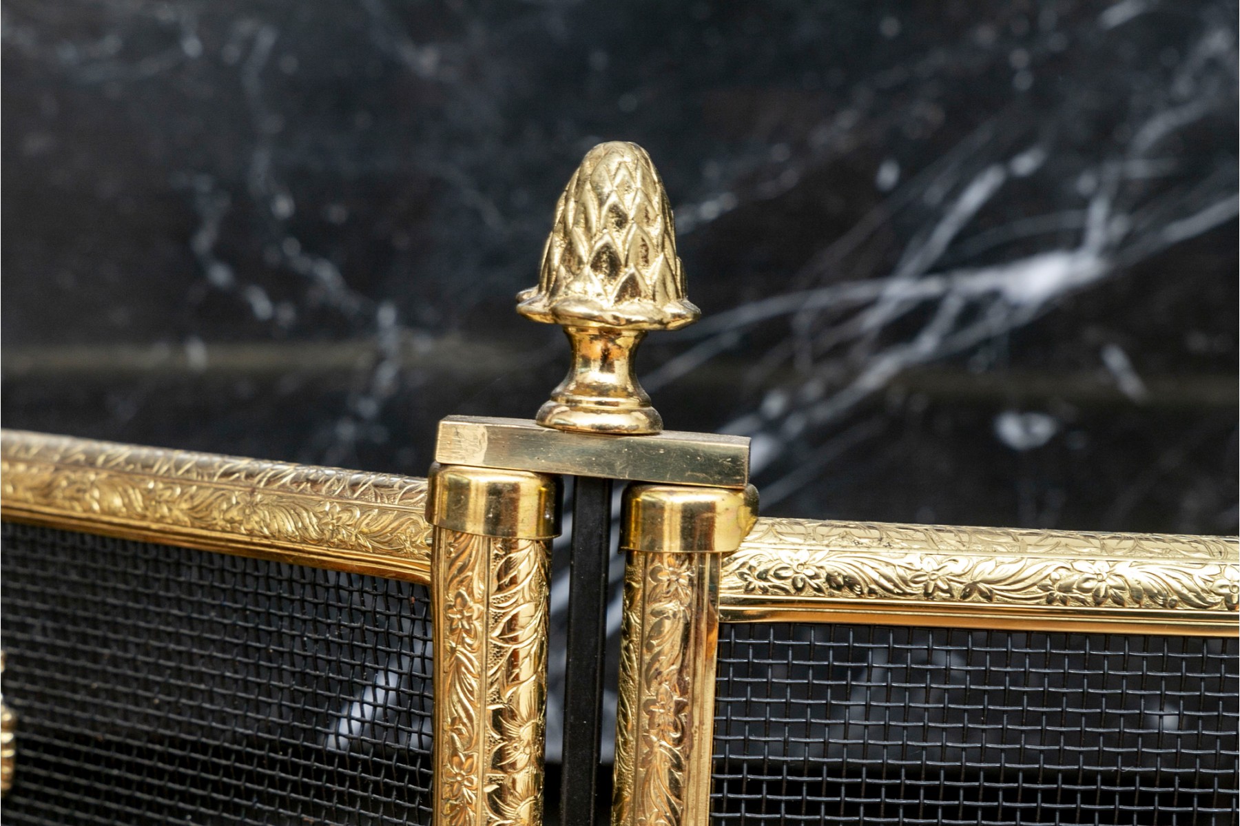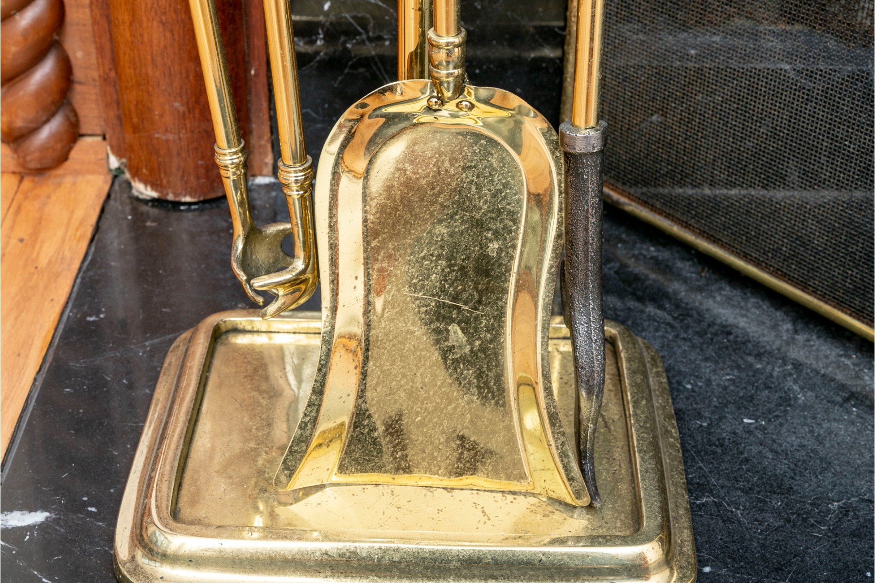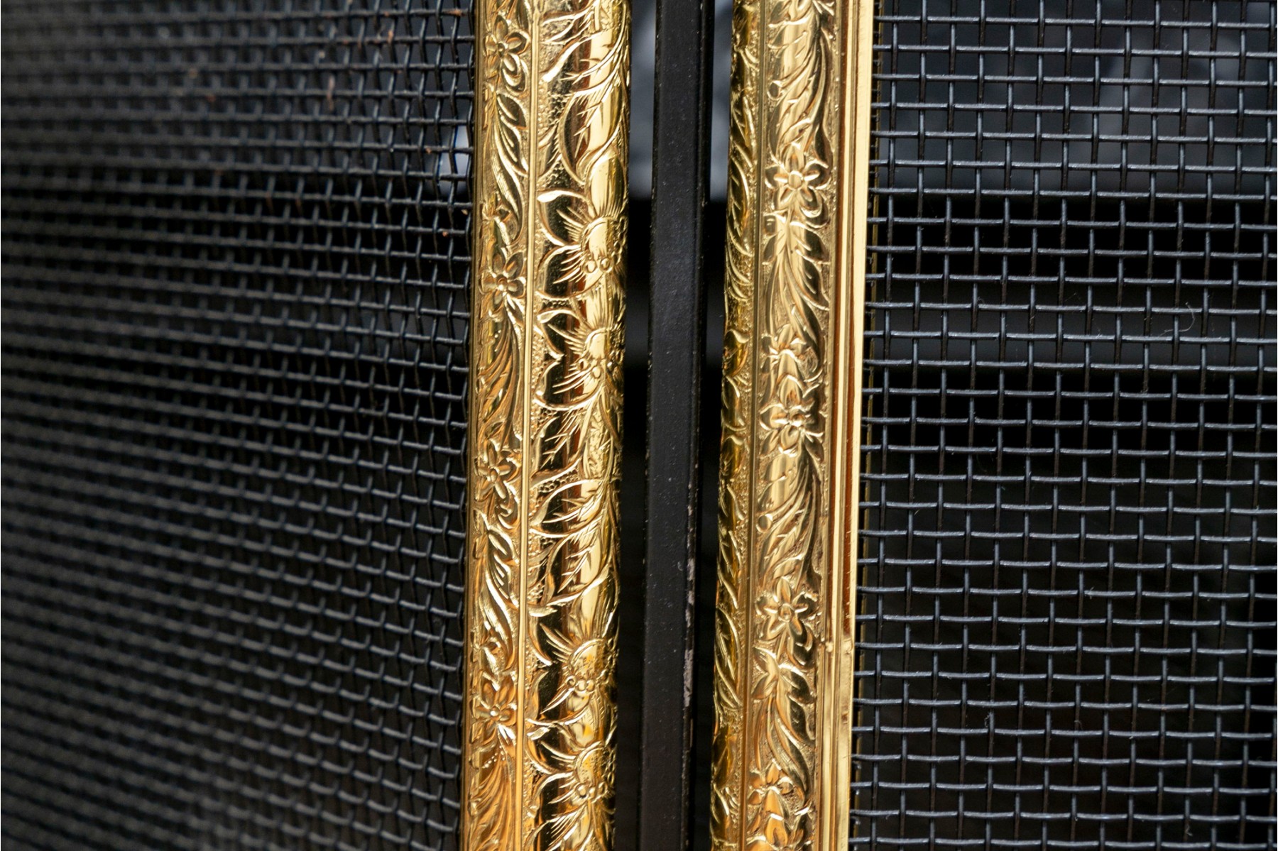 A repousse decorated three panel fire screen with two finials and a central brass swag decoration to mesh. Along with a set of brass brass fire tools with stand.
