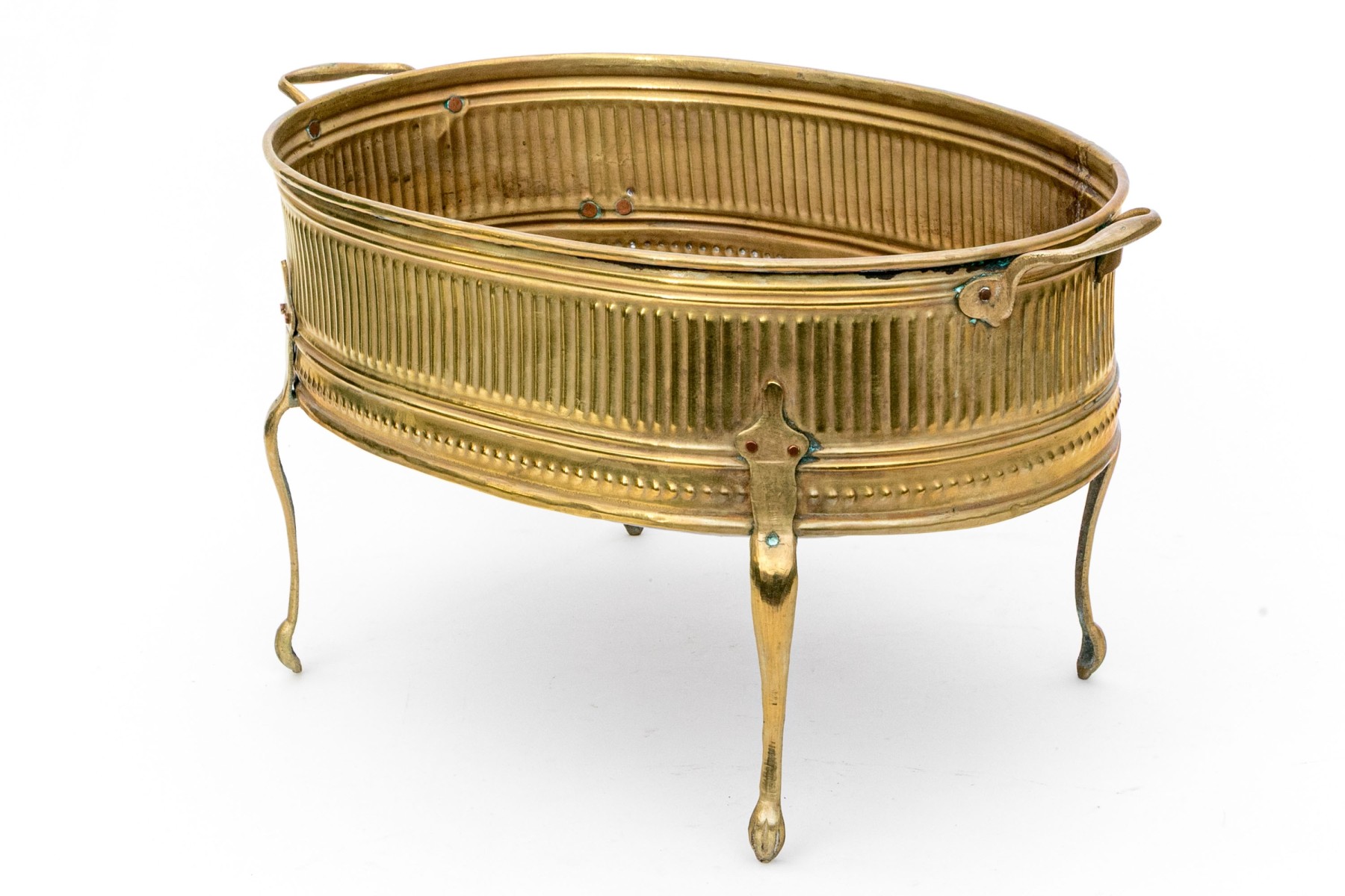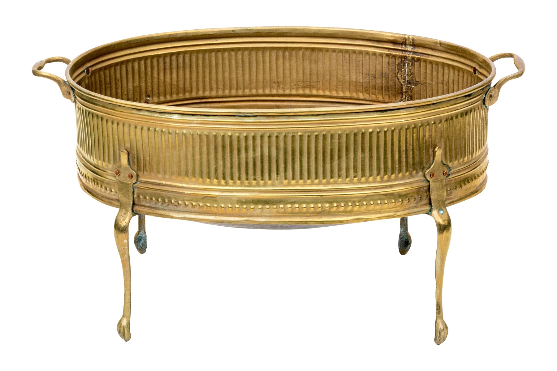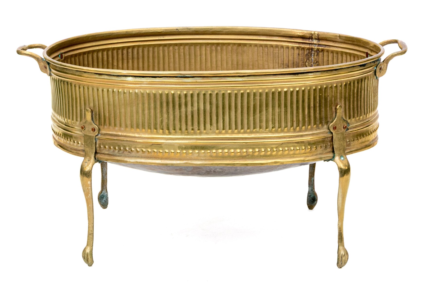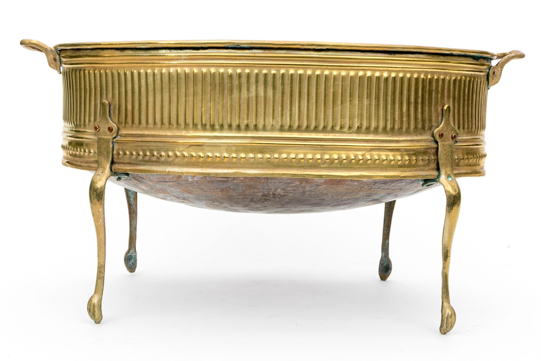 A gorgeous early 20th century brass and copper jardiniere exuding Neoclassical inspired French elegance with an oval basin finely decorated with repousse fluting and stippling around the body, which is flanked by twin handles. The body is raised on four tall cabriole legs with tip-toe paw feet.