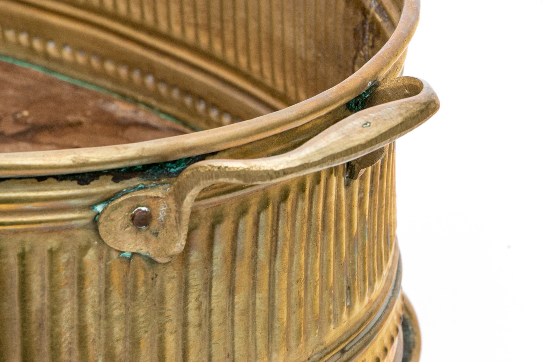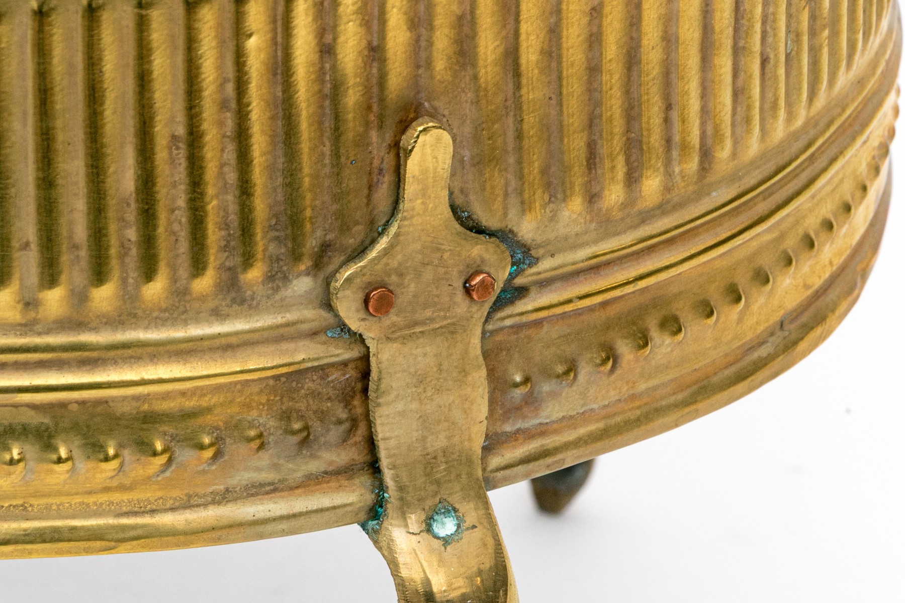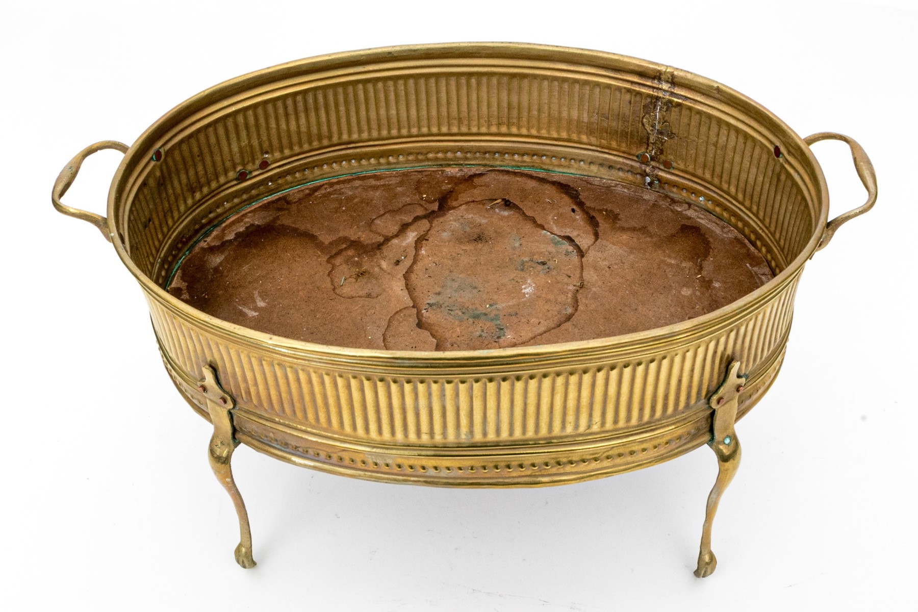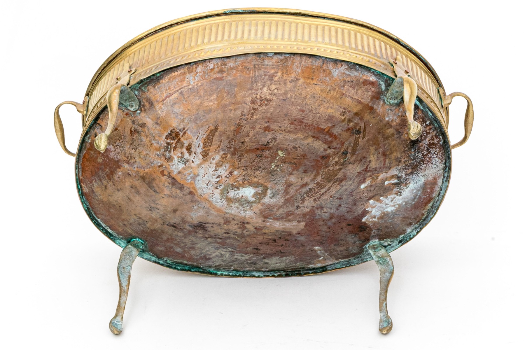 A gorgeous early 20th century brass and copper jardiniere exuding Neoclassical inspired French elegance with an oval basin finely decorated with repousse fluting and stippling around the body, which is flanked by twin handles. The body is raised on four tall cabriole legs with tip-toe paw feet.