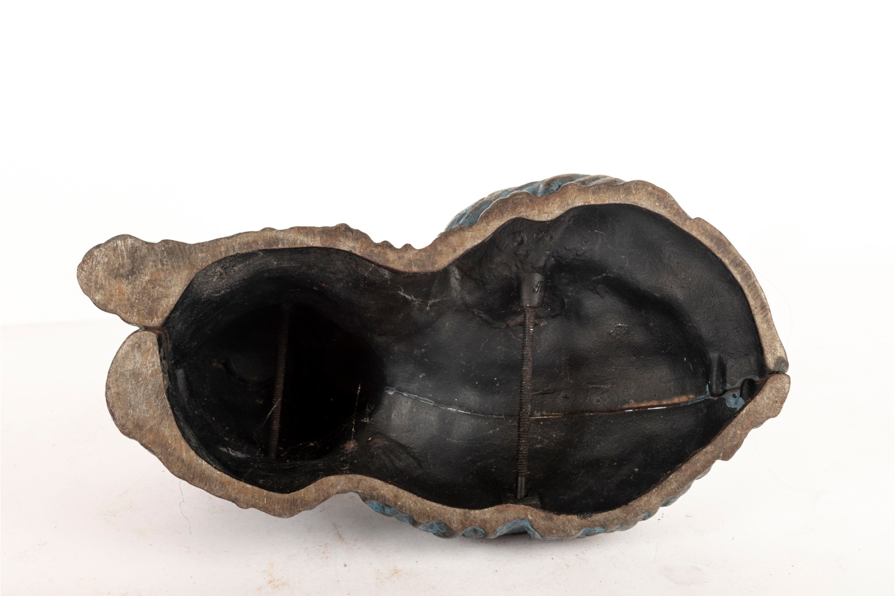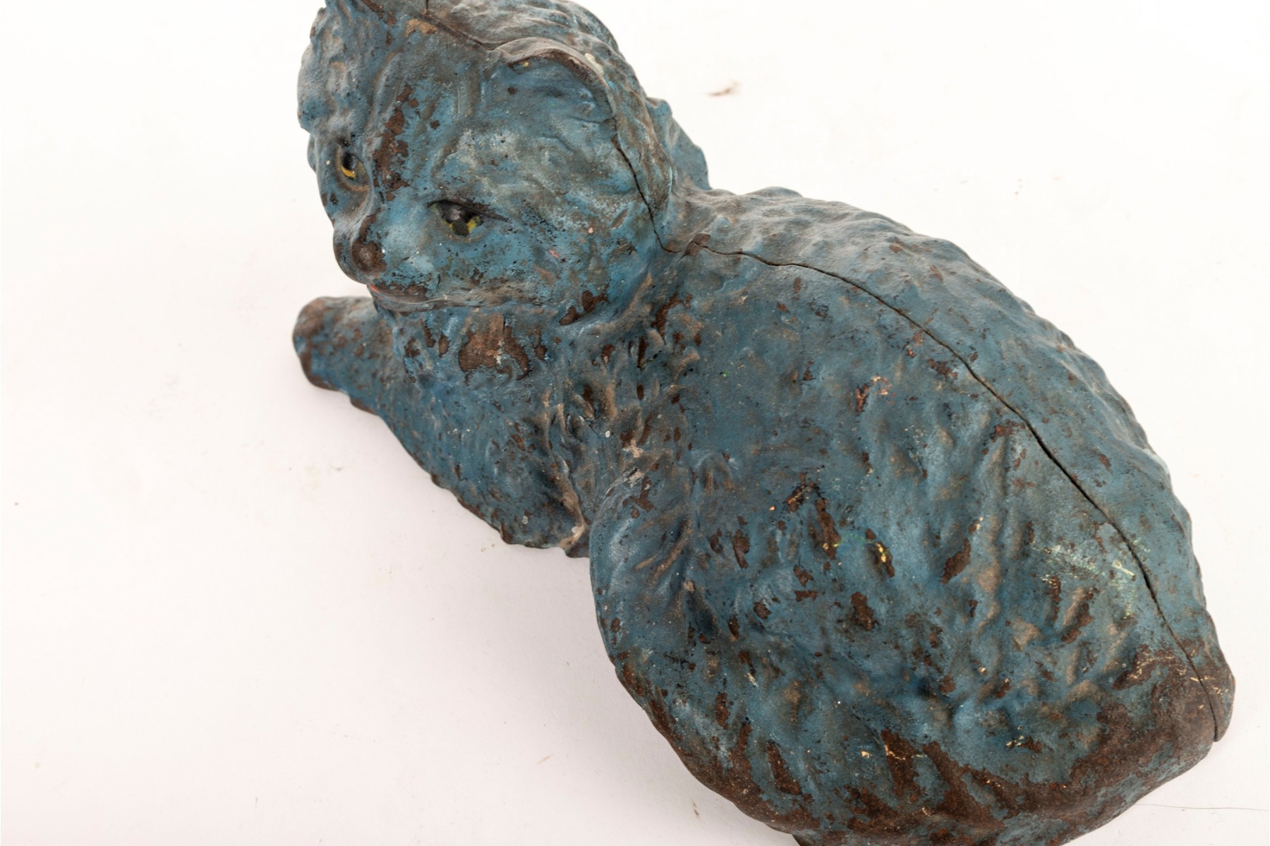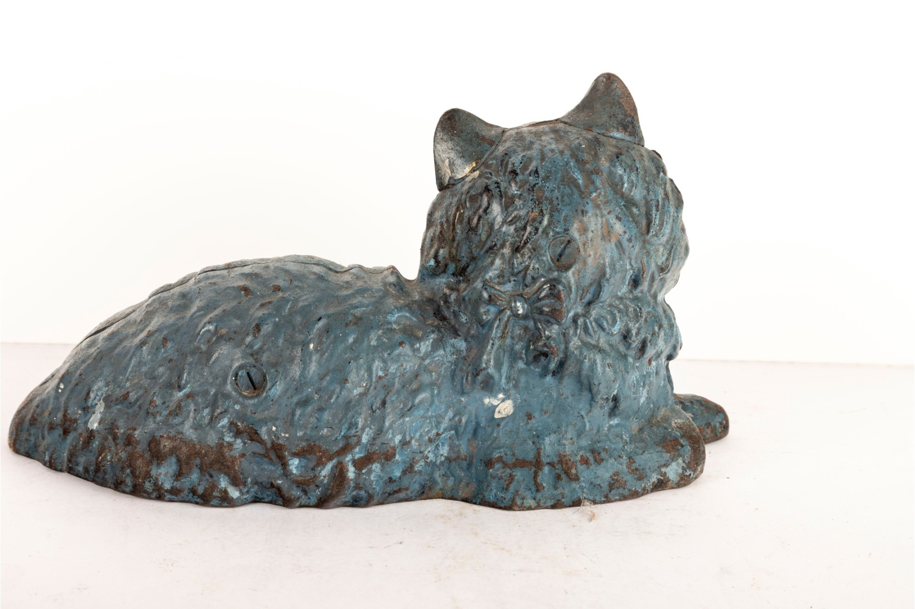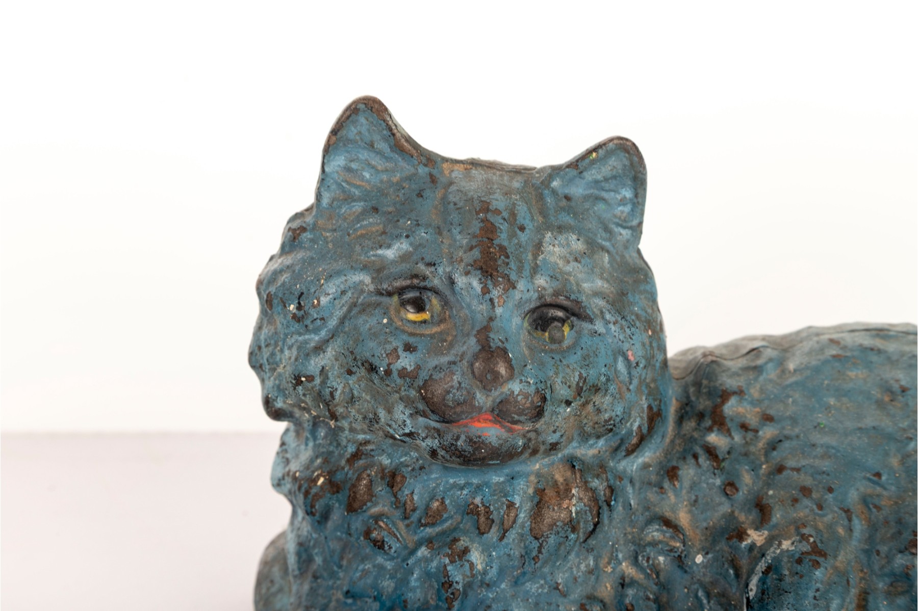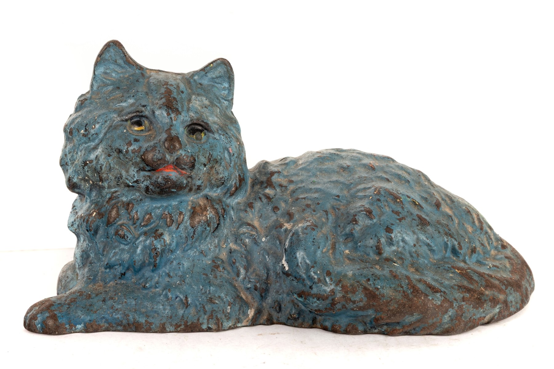 A charming cast iron doorstop in the form of a reclining long-haired cat, produced in the United States (circa 1910–1930).
