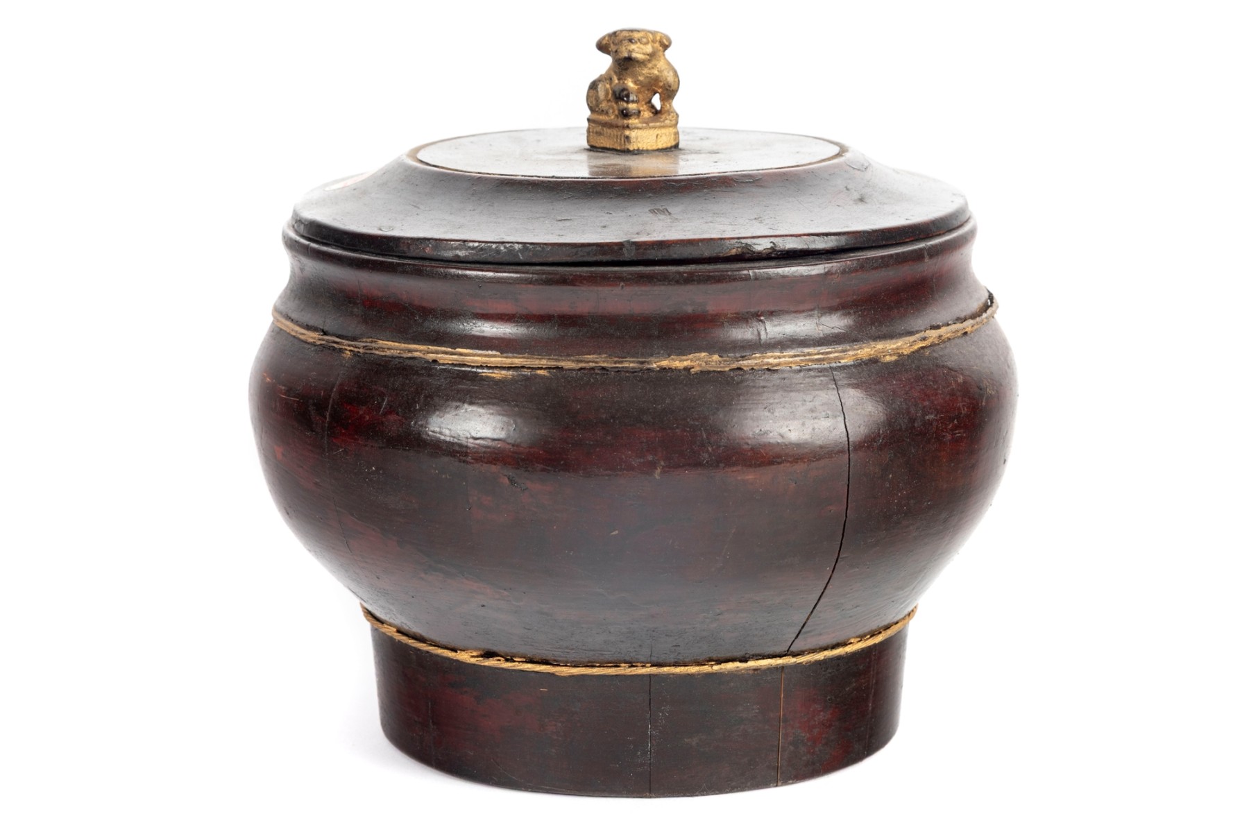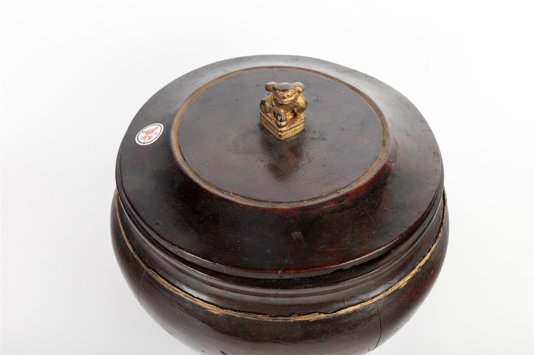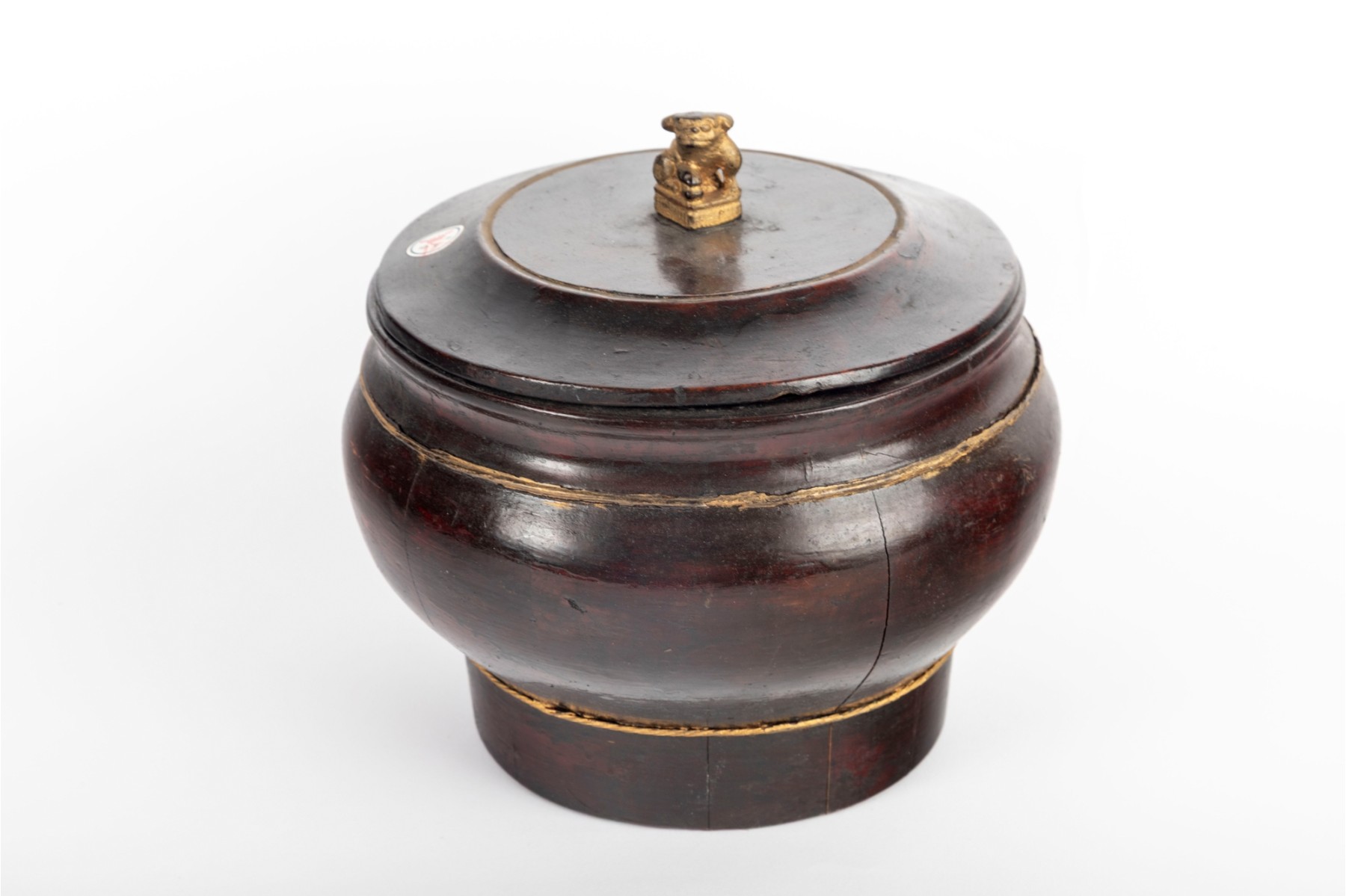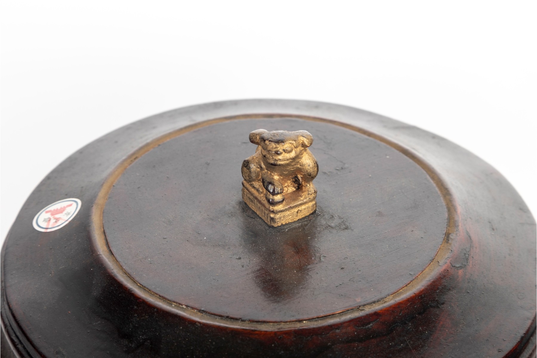 An antique Chinese storage box from the early 20th century, crafted from wood with painted gold-tone trim and decorative foo-dog finial.