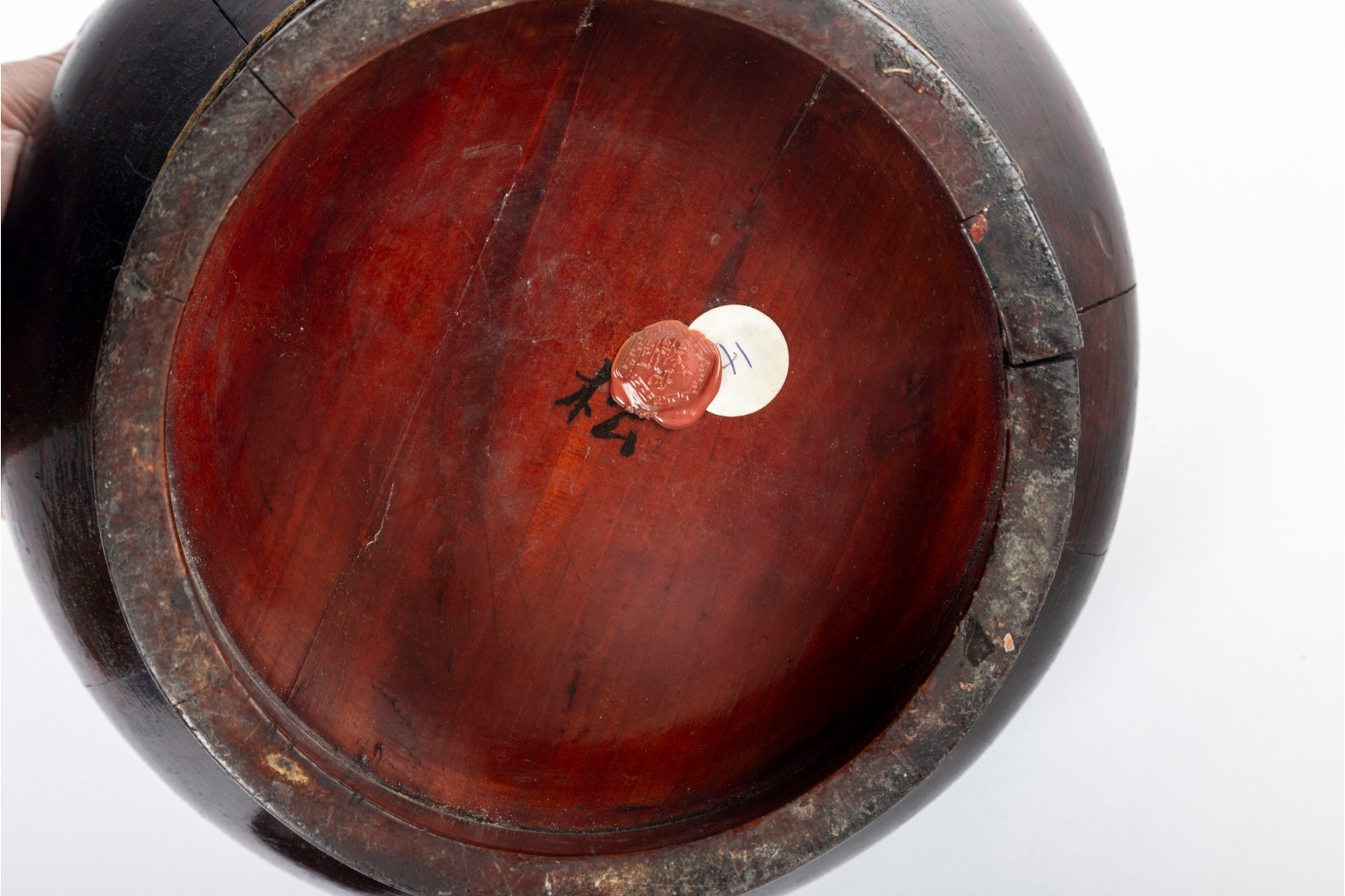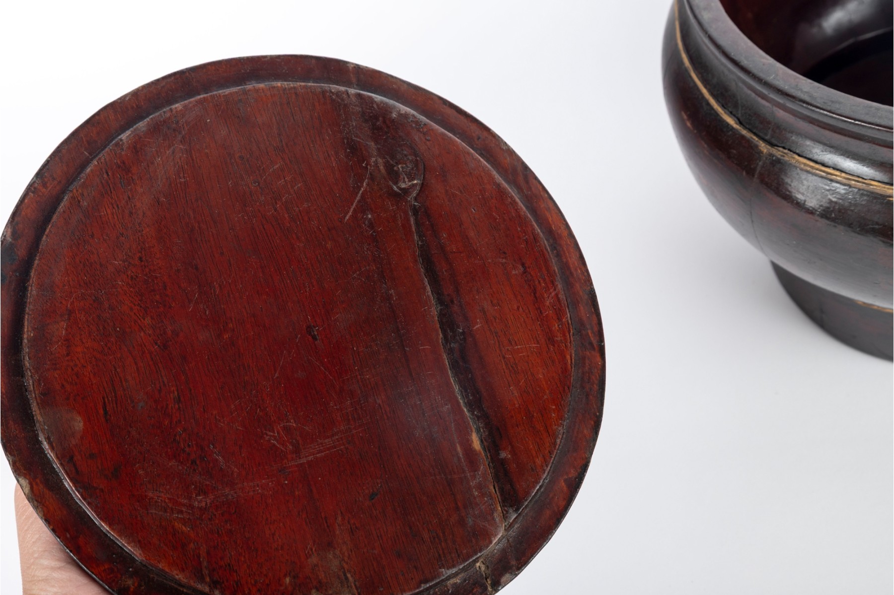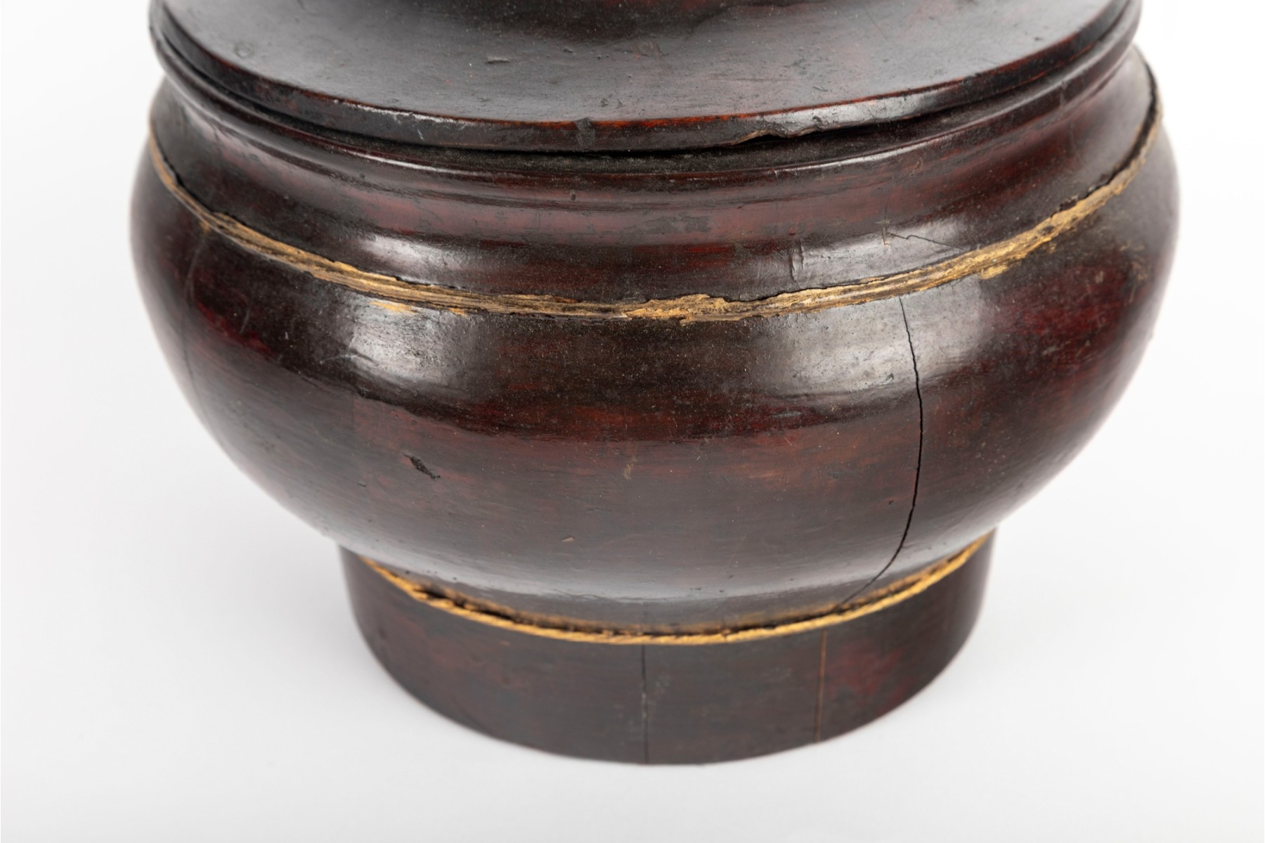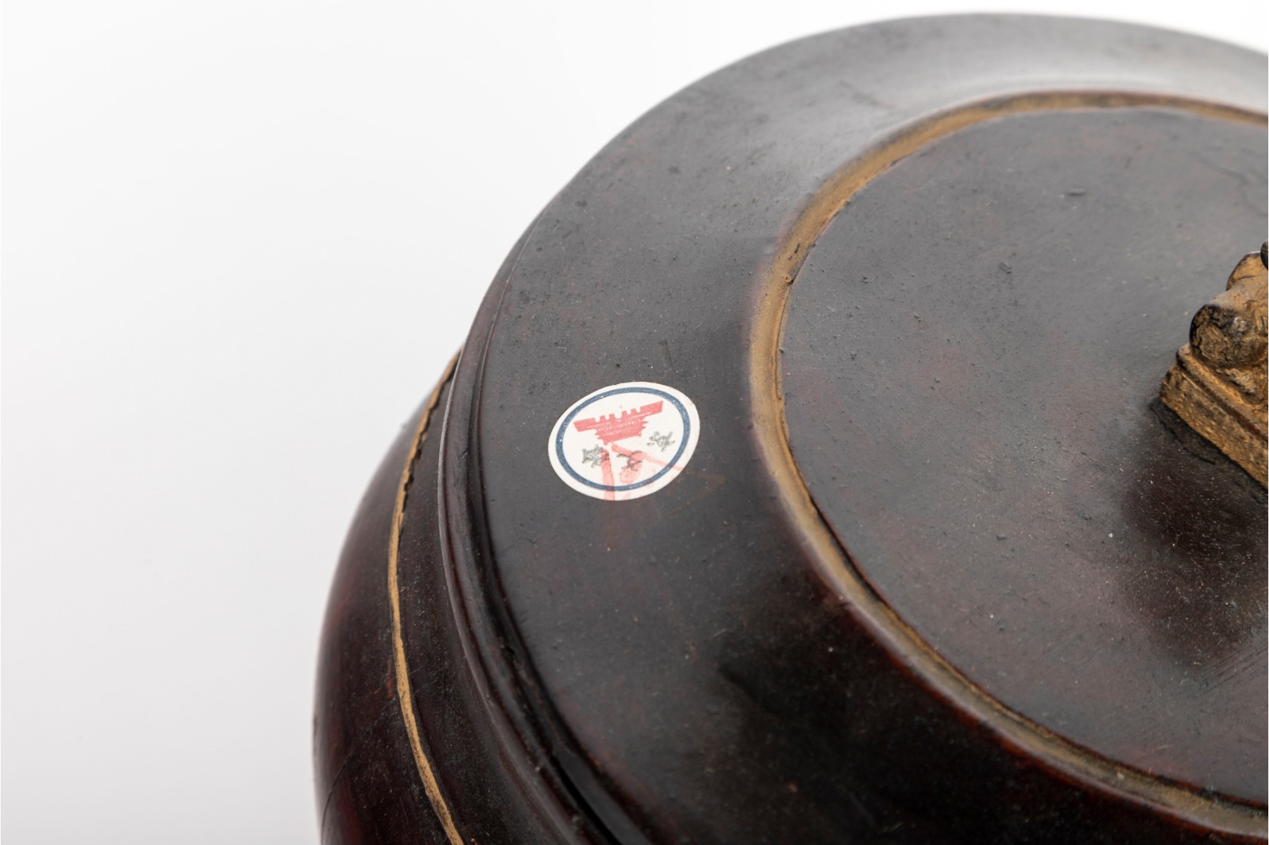 An antique Chinese storage box from the early 20th century, crafted from wood with painted gold-tone trim and decorative foo-dog finial.