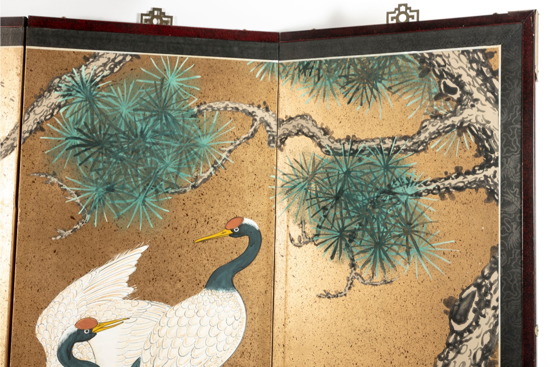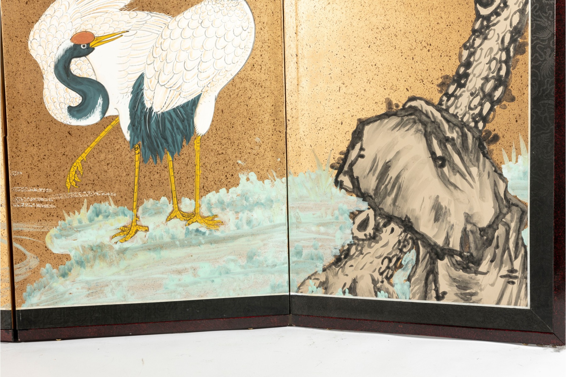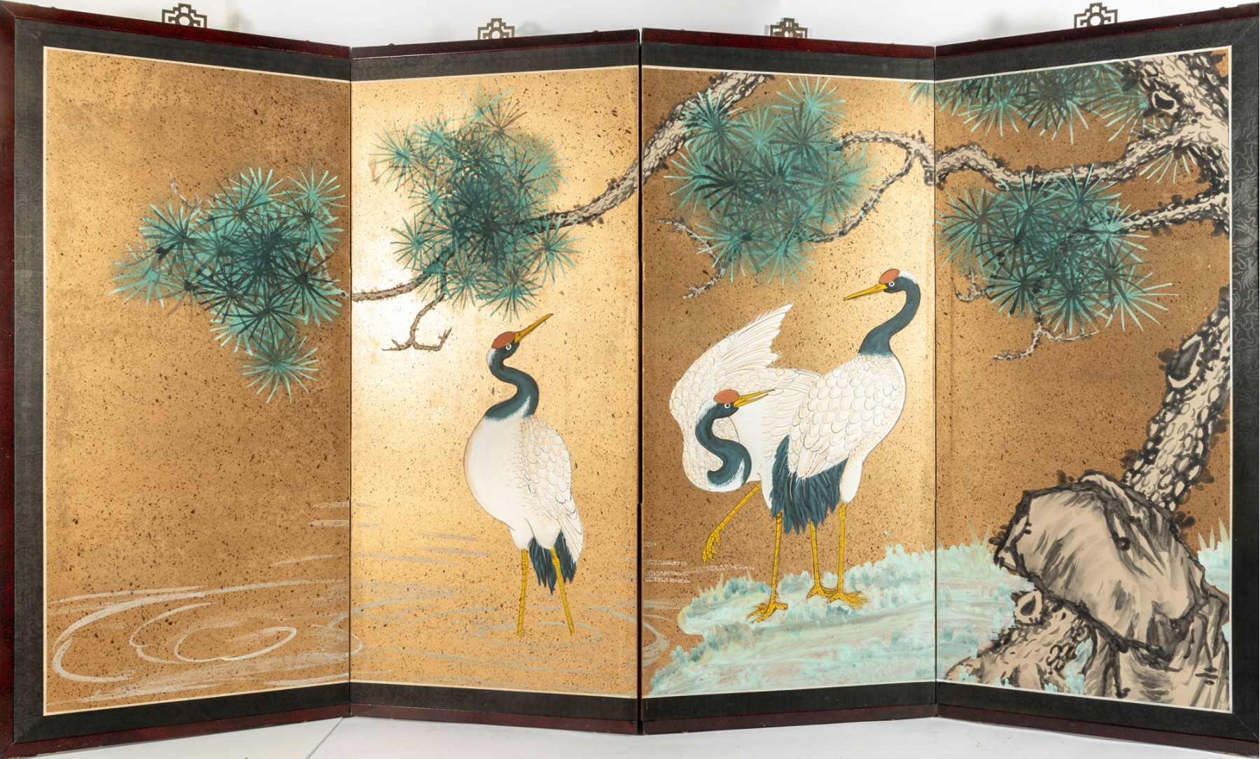 A stunning vintage decorative four-panel byobu screen -- Chinese, depicting a hand-painted landscape scene with three eastern cranes beneath a tree canopy. The piece is complete with a lacquered wood frame complimented by a black brocade border.