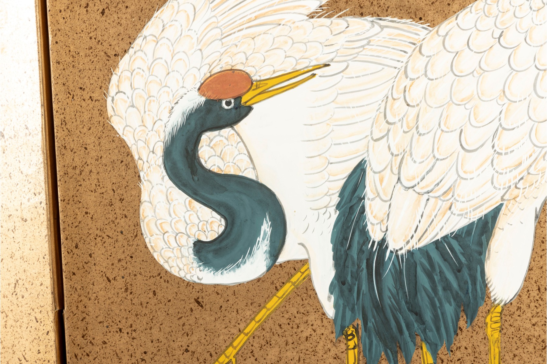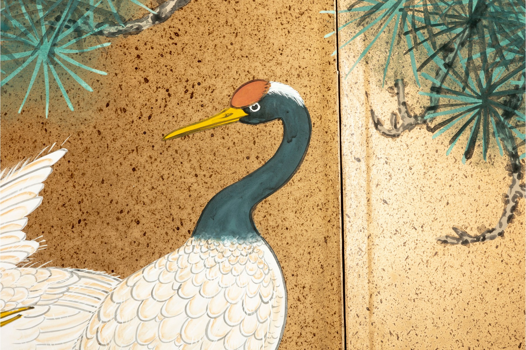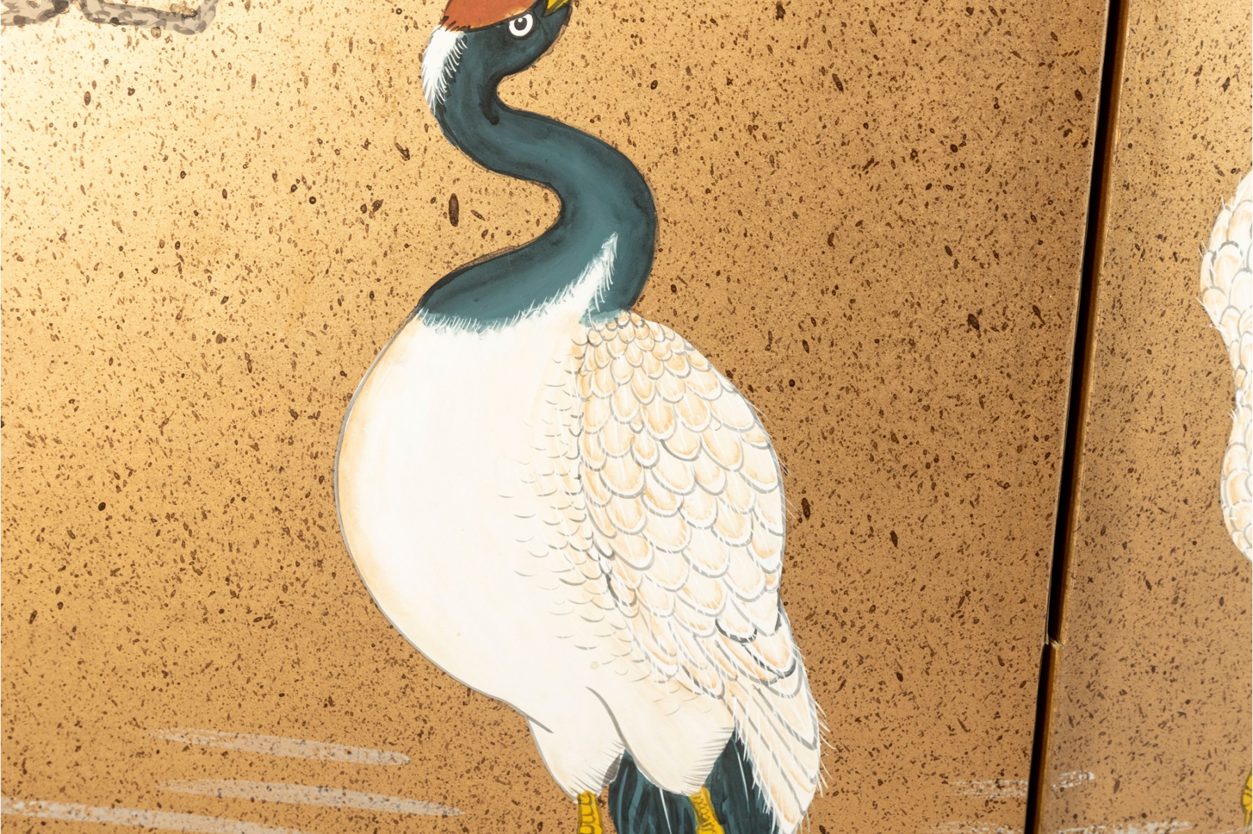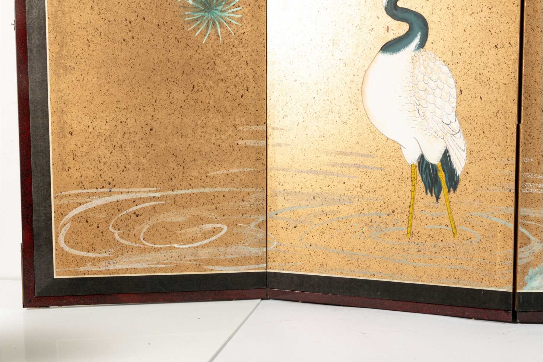 A stunning vintage decorative four-panel byobu screen -- Chinese, depicting a hand-painted landscape scene with three eastern cranes beneath a tree canopy. The piece is complete with a lacquered wood frame complimented by a black brocade border.
