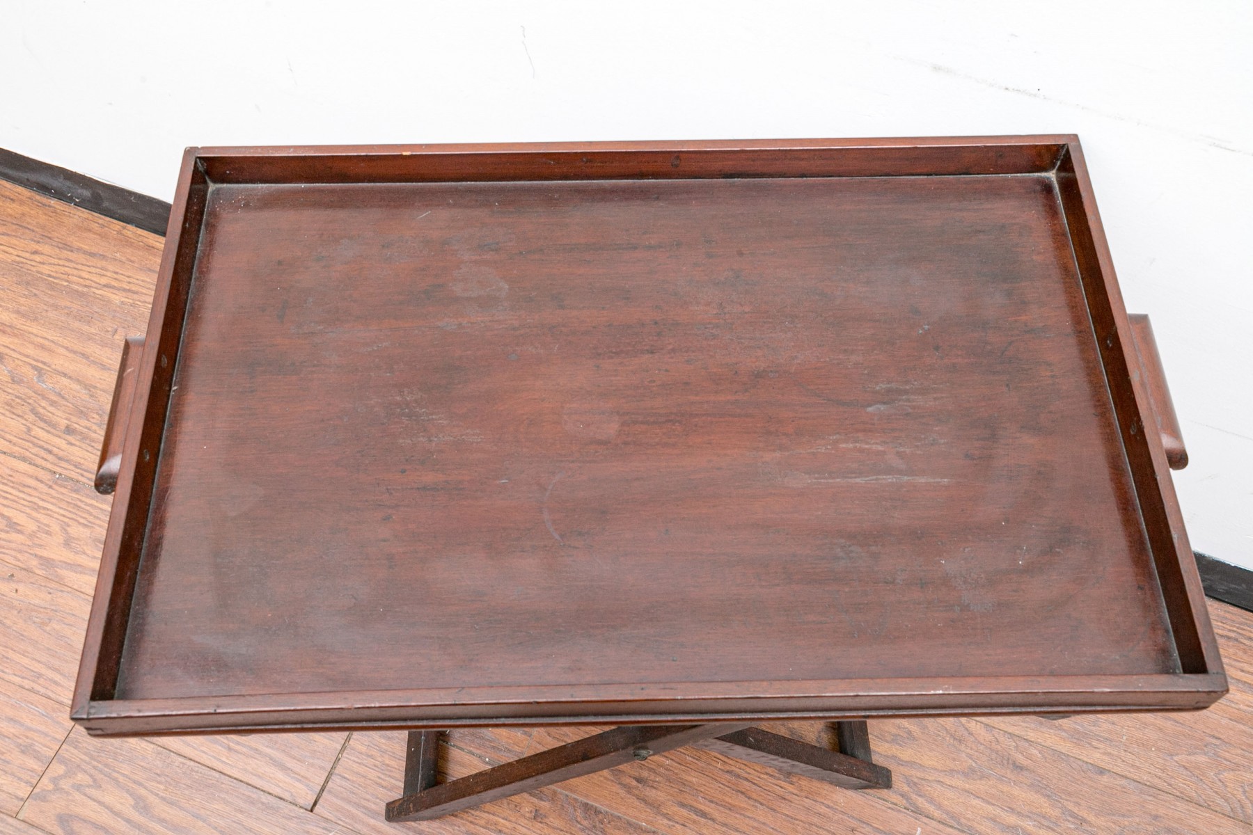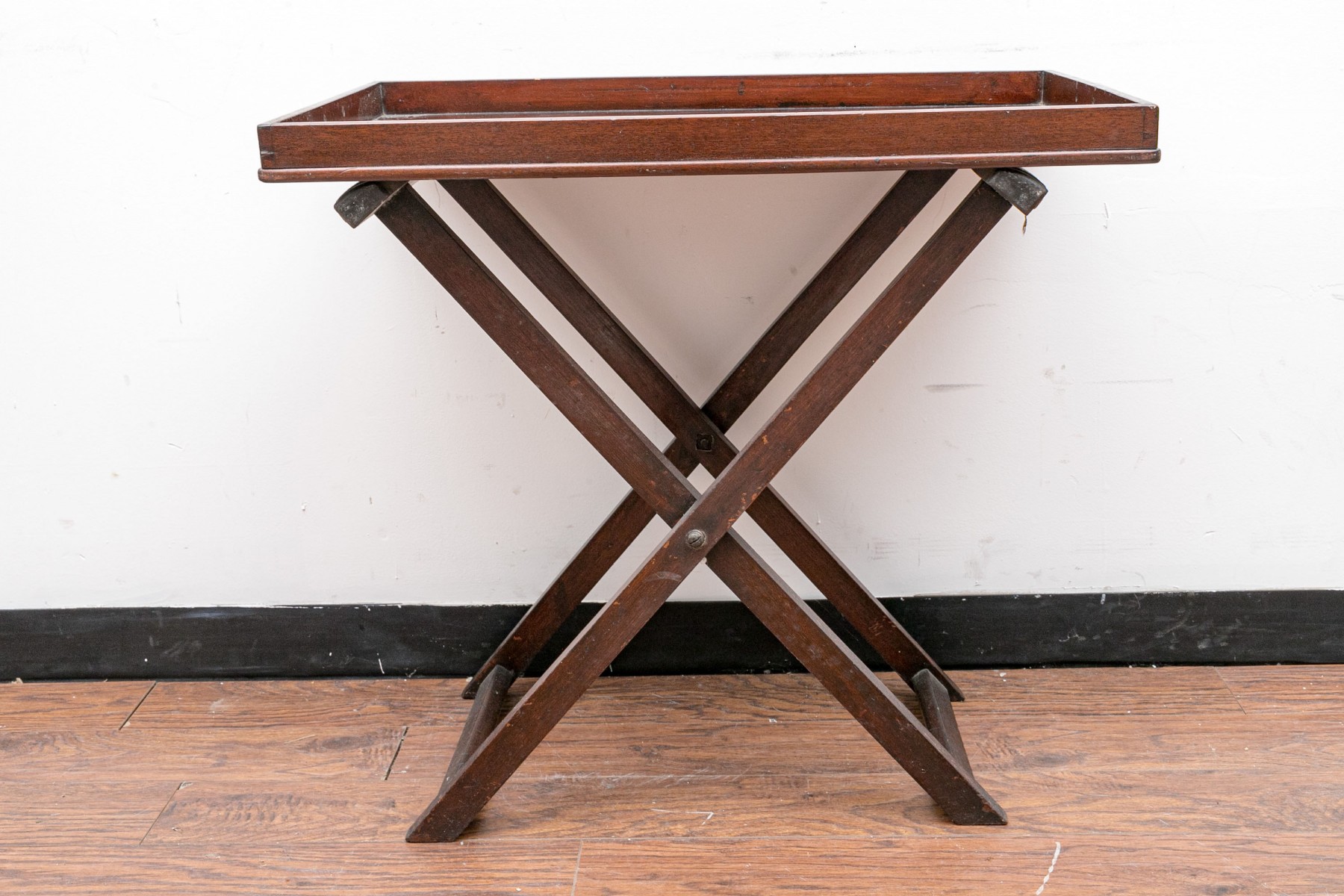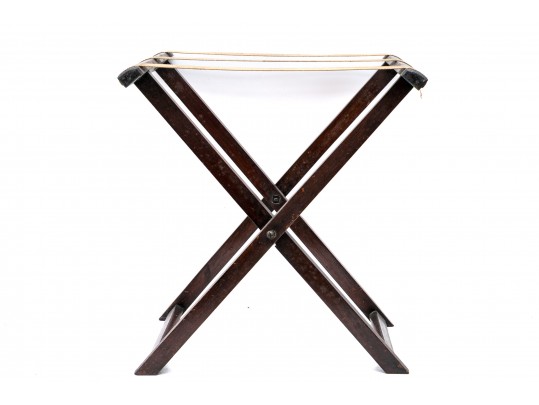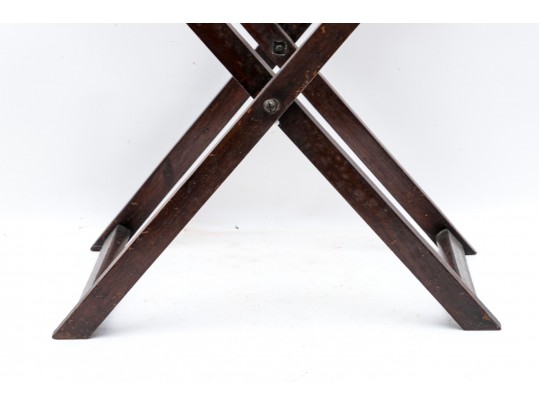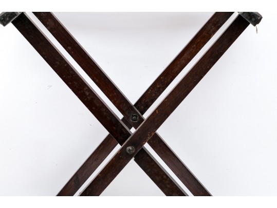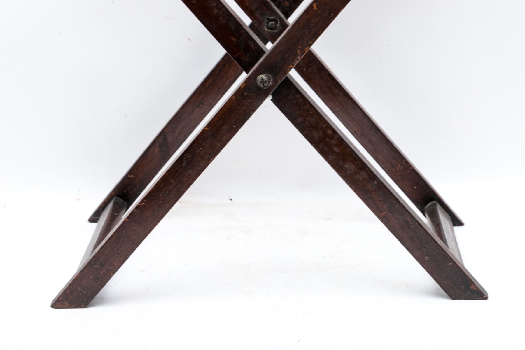 Early 20th century luggage tray table. Having a rectangular butler's tray resting on a classic folding X-form base with fabric strap supports.