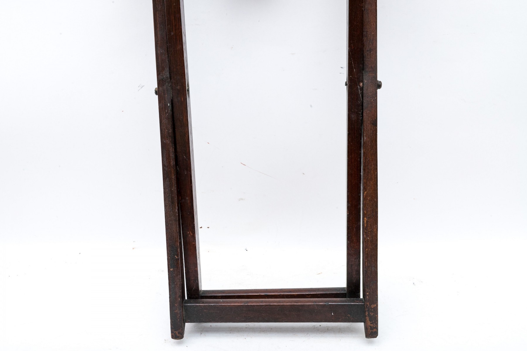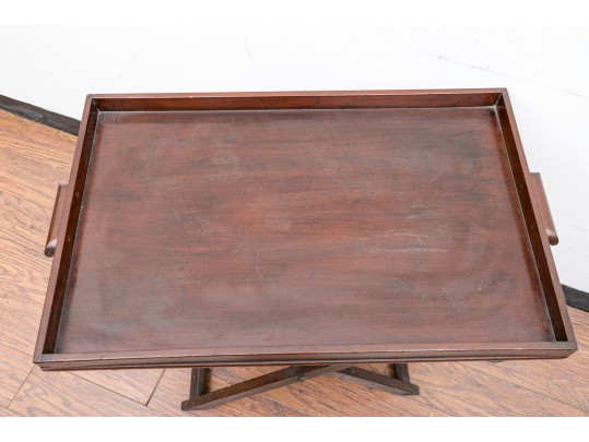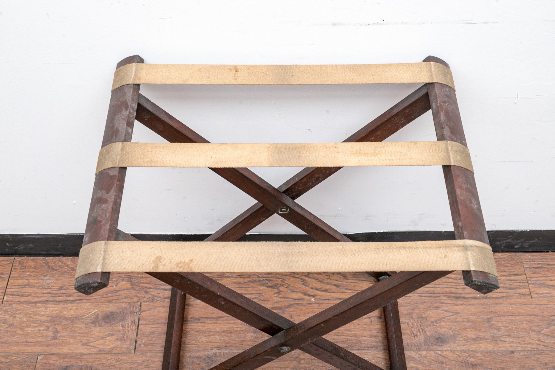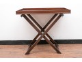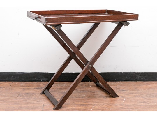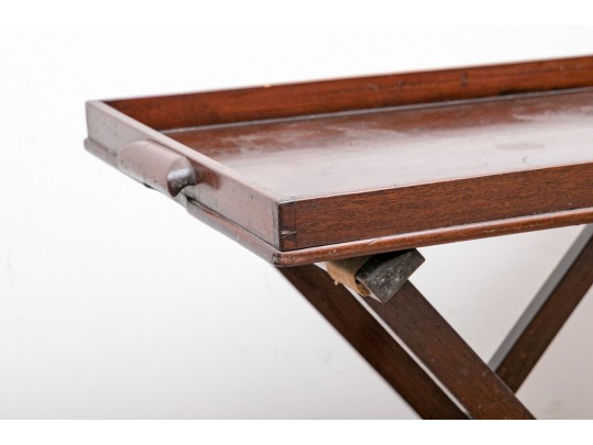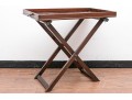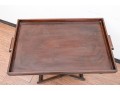 Early 20th century luggage tray table. Having a rectangular butler's tray resting on a classic folding X-form base with fabric strap supports.