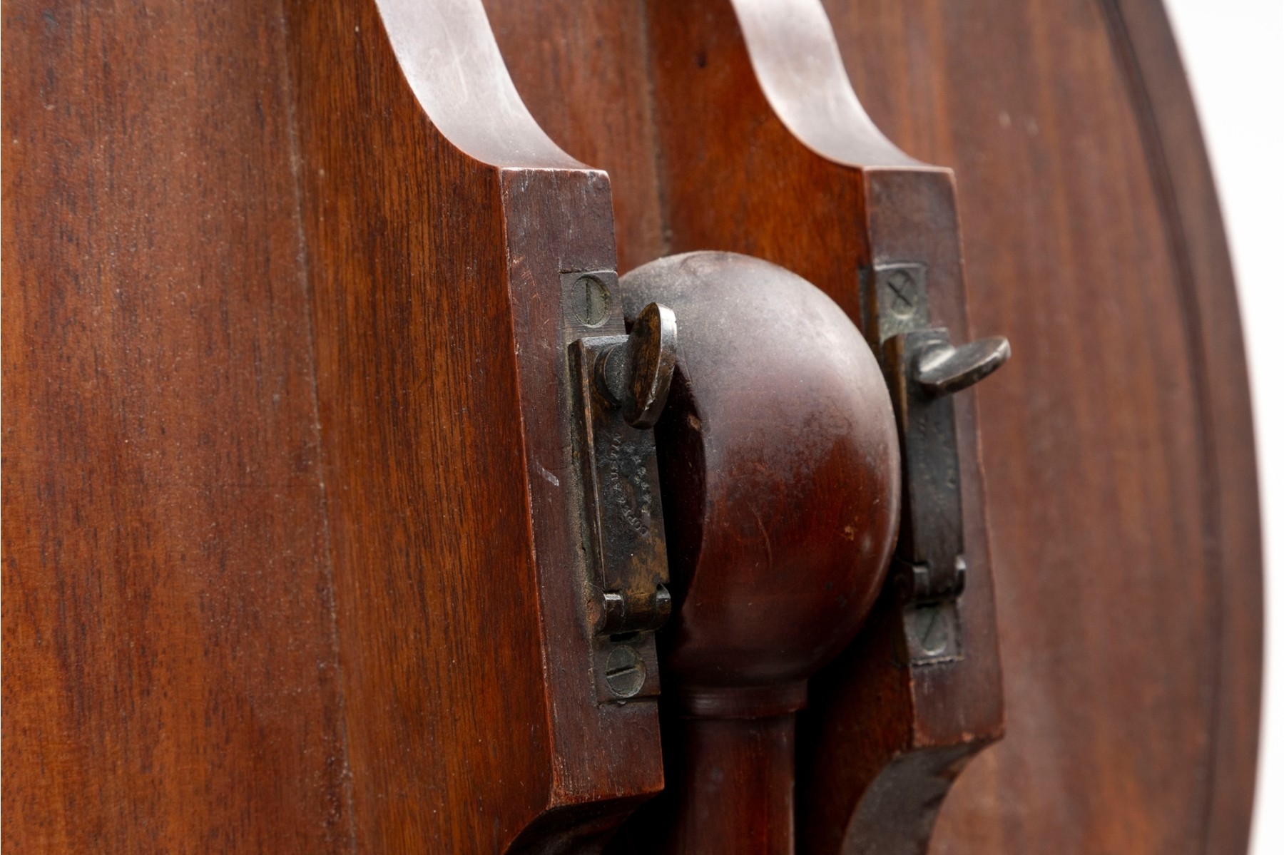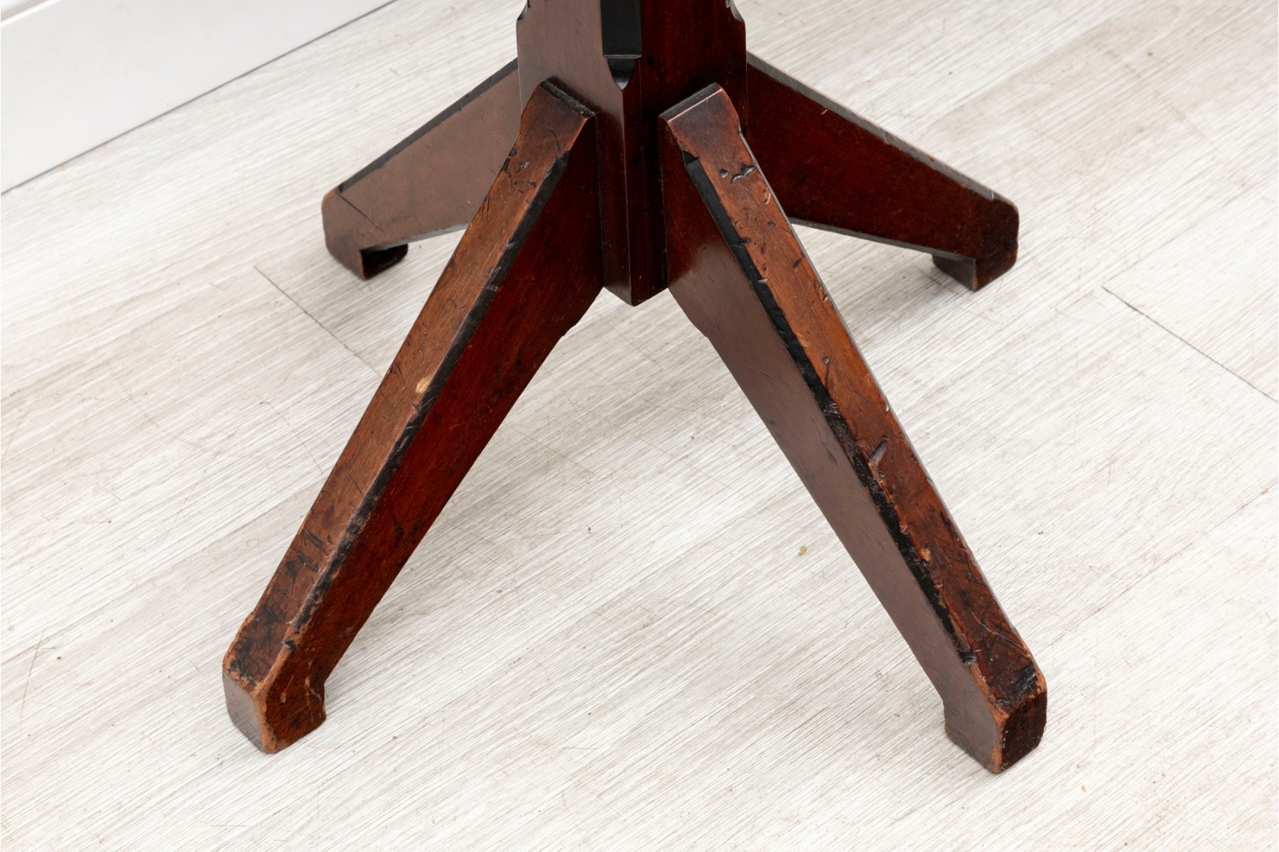 An early 20th-century wooden shaving stand featuring a tall, compact design with a simple rectangular stand, a central column, and an adjustable mirror mounted on top with a hinged top for storage. The mirror is removable.