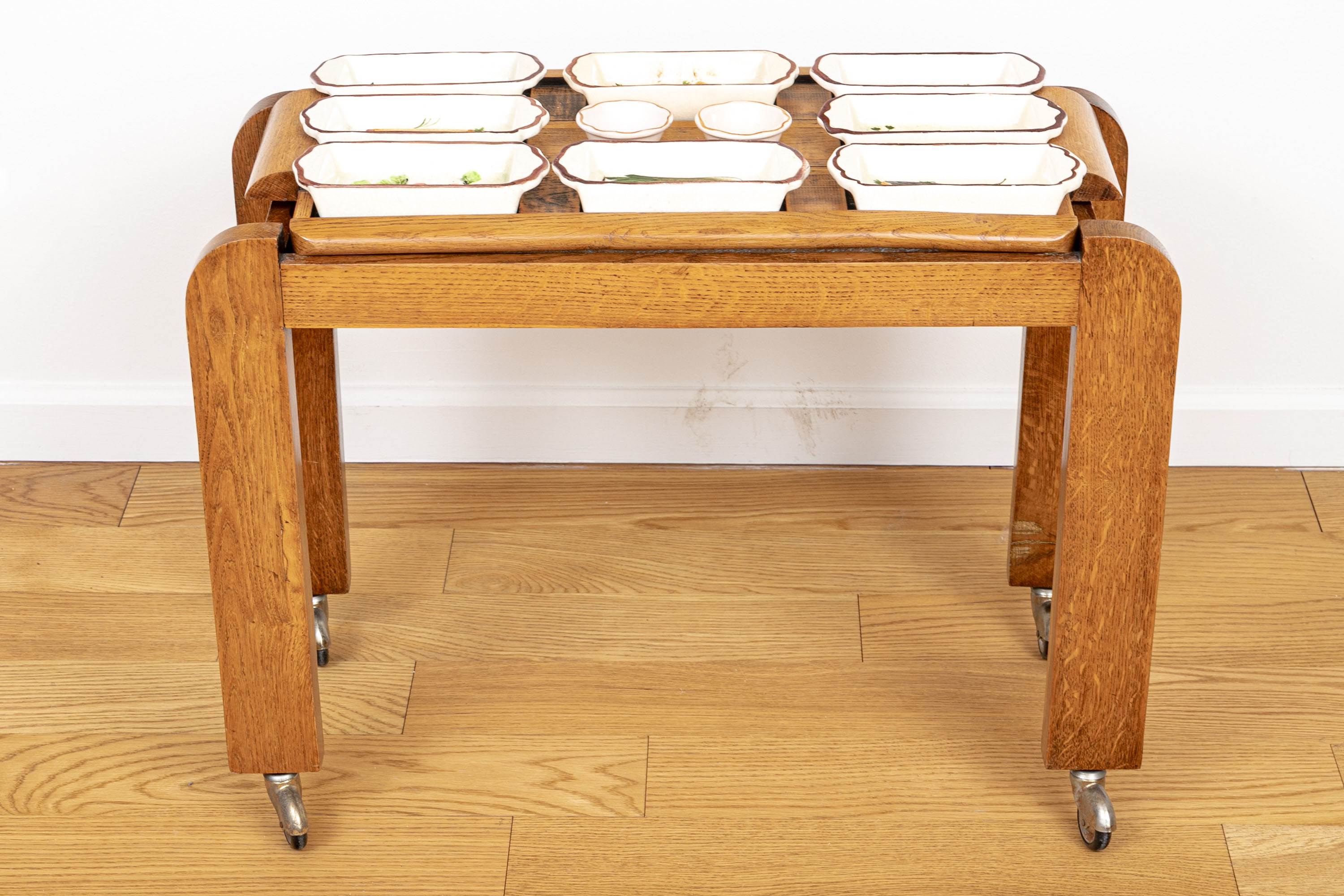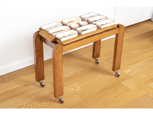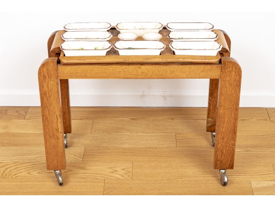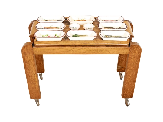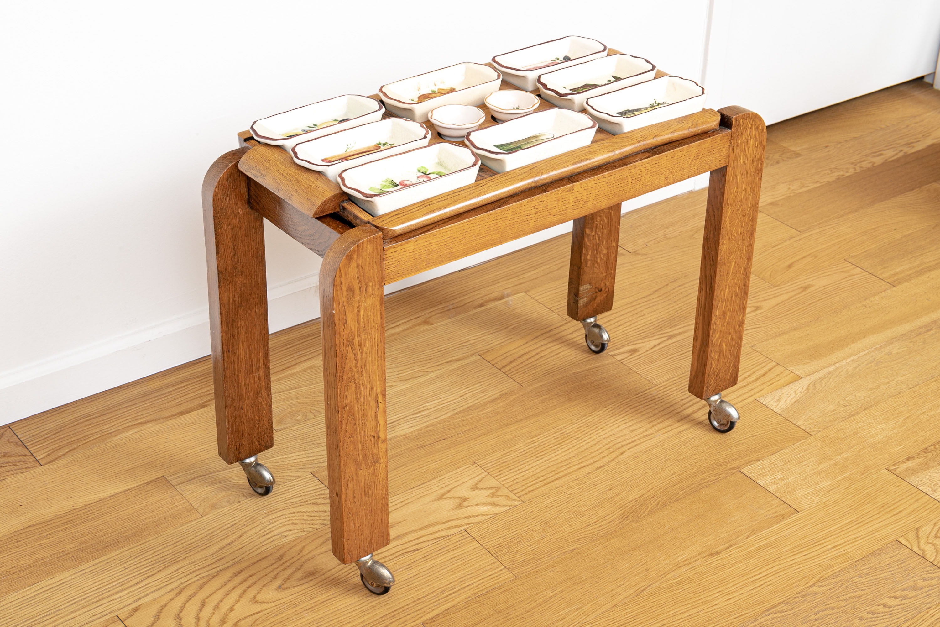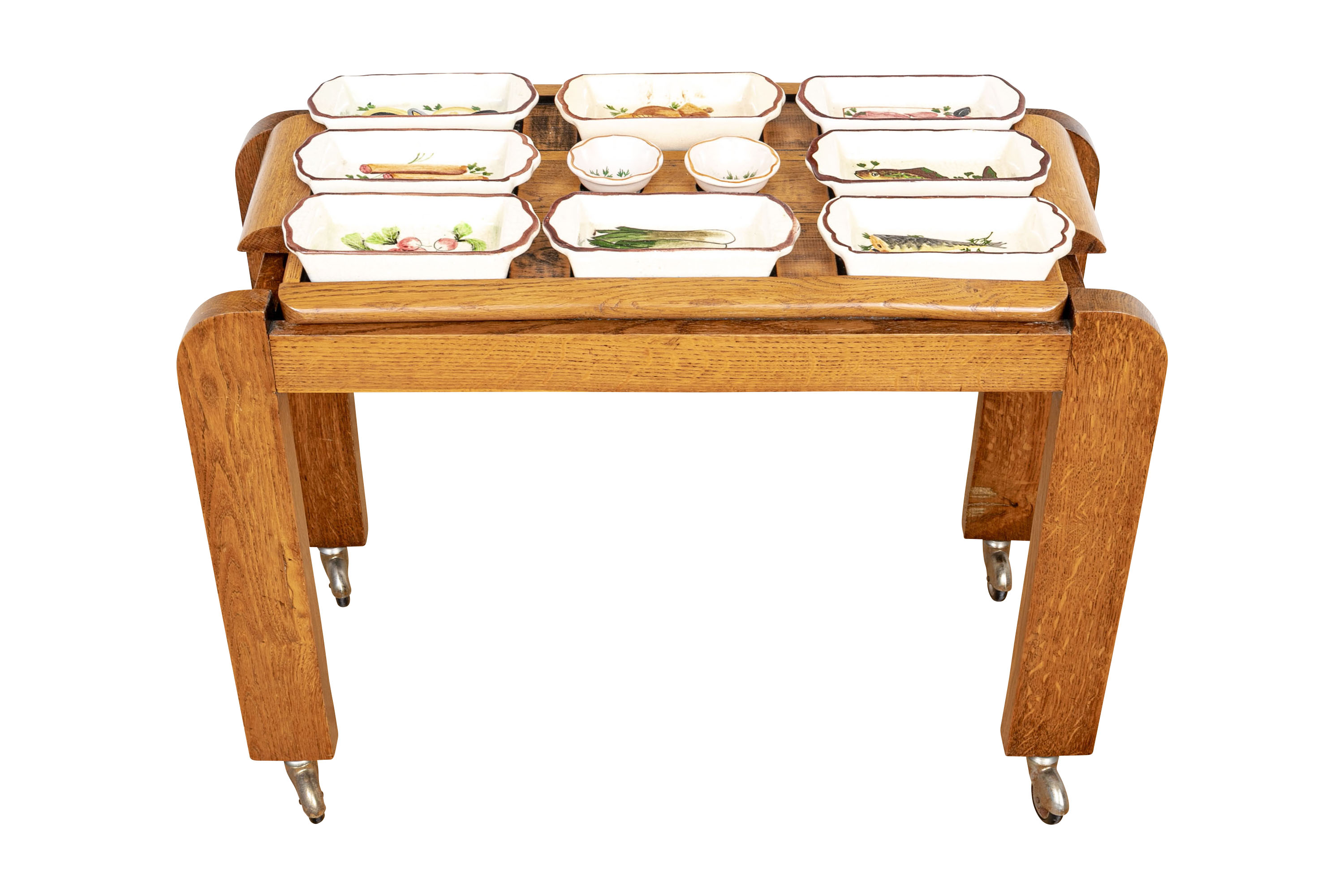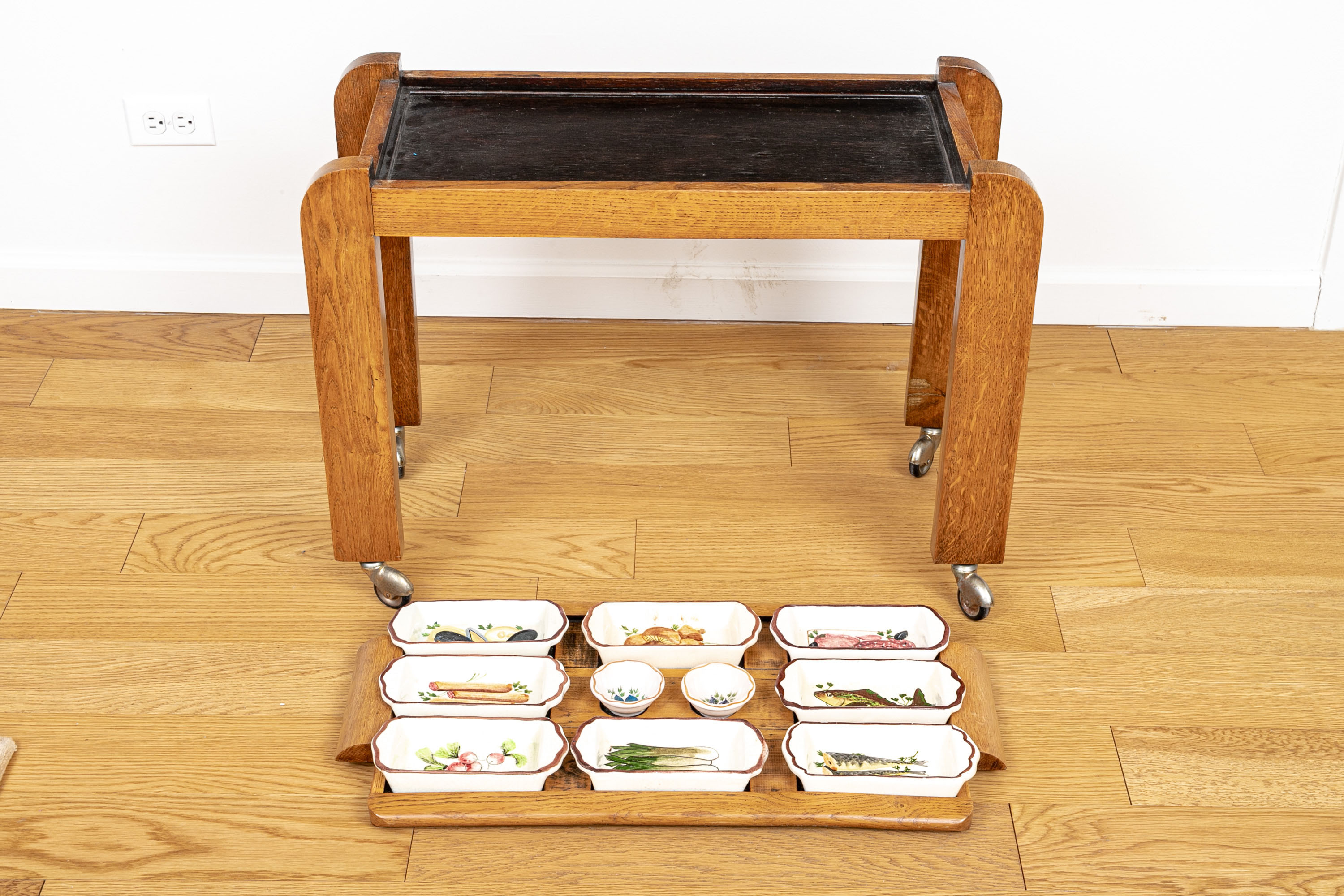 Early 20th century trolley fitted with hand painted French pottery dishes on a removable handled tray. The tray is fitted with 8 rectangular and 2 small round pottery dishes that nest into dark stained compartments. The tray lifts off to reveal a smooth dark stained surface. The trolley presents with straight legs and terminates with brass casters.