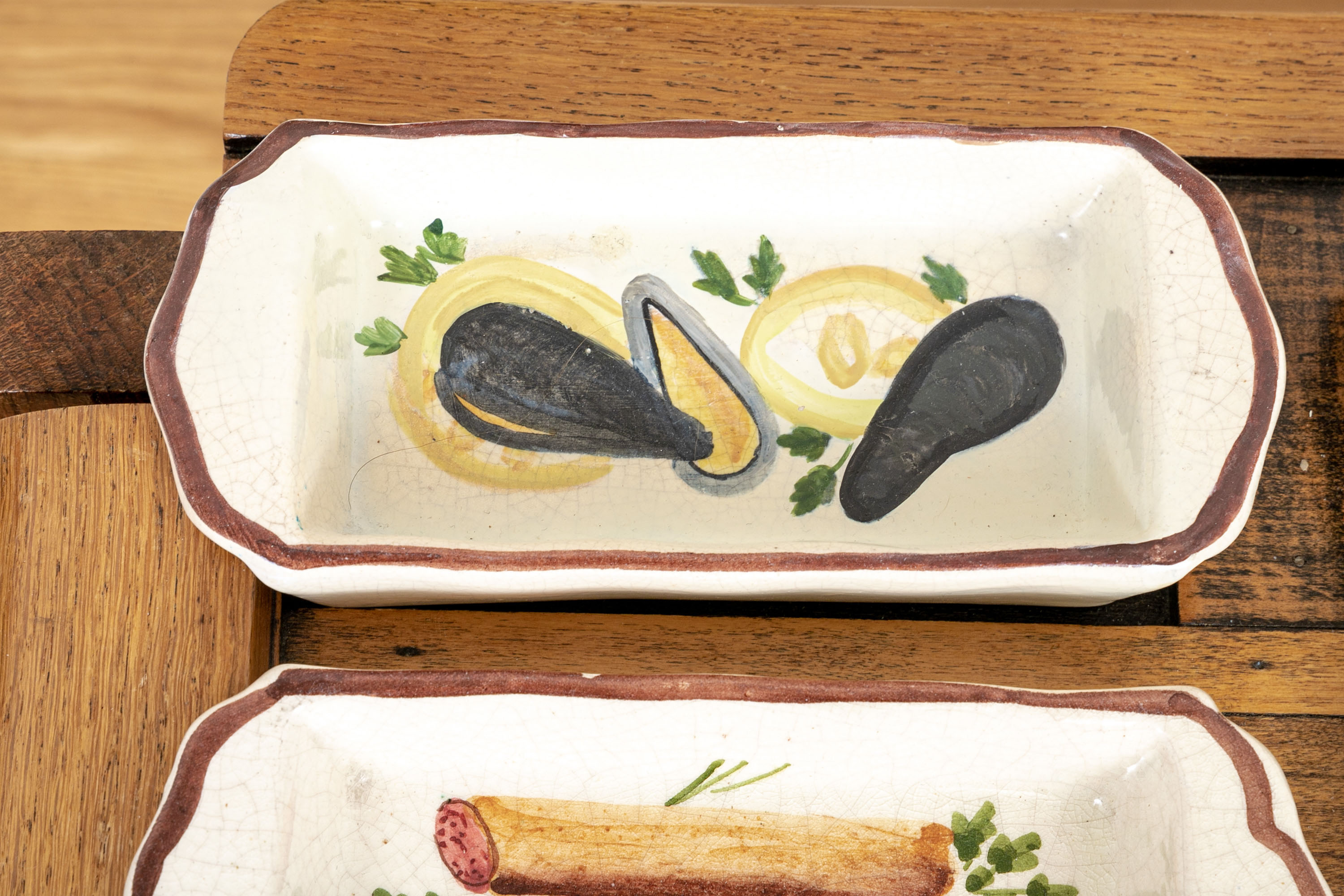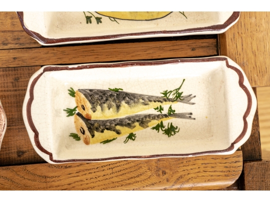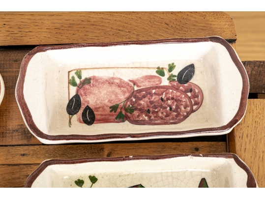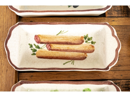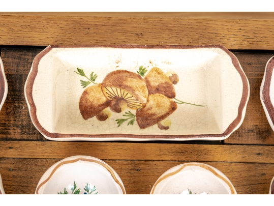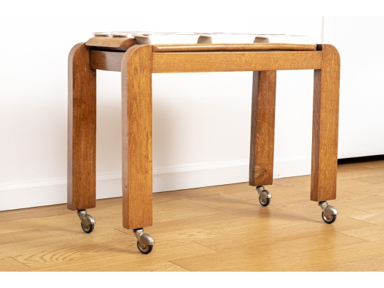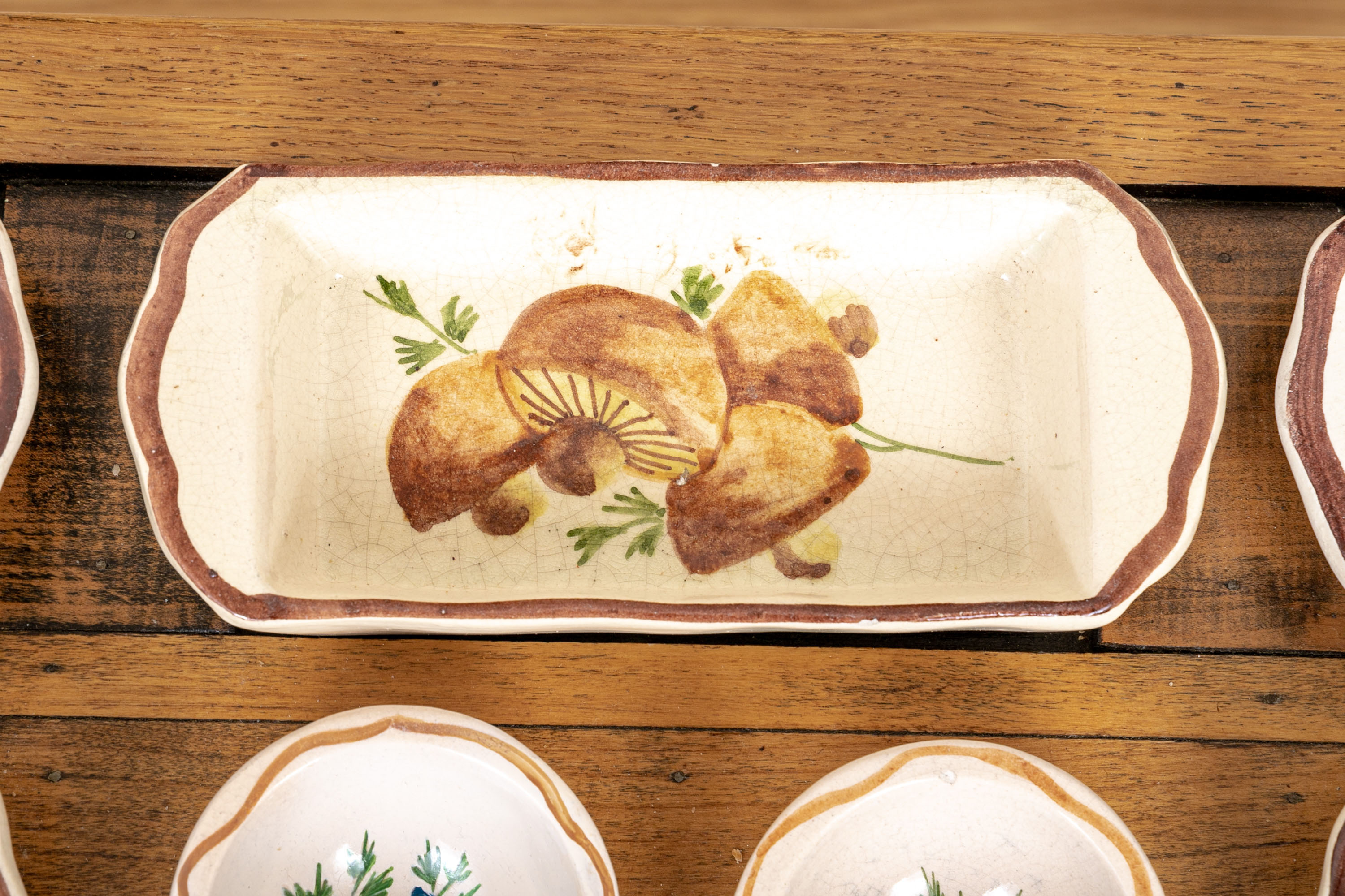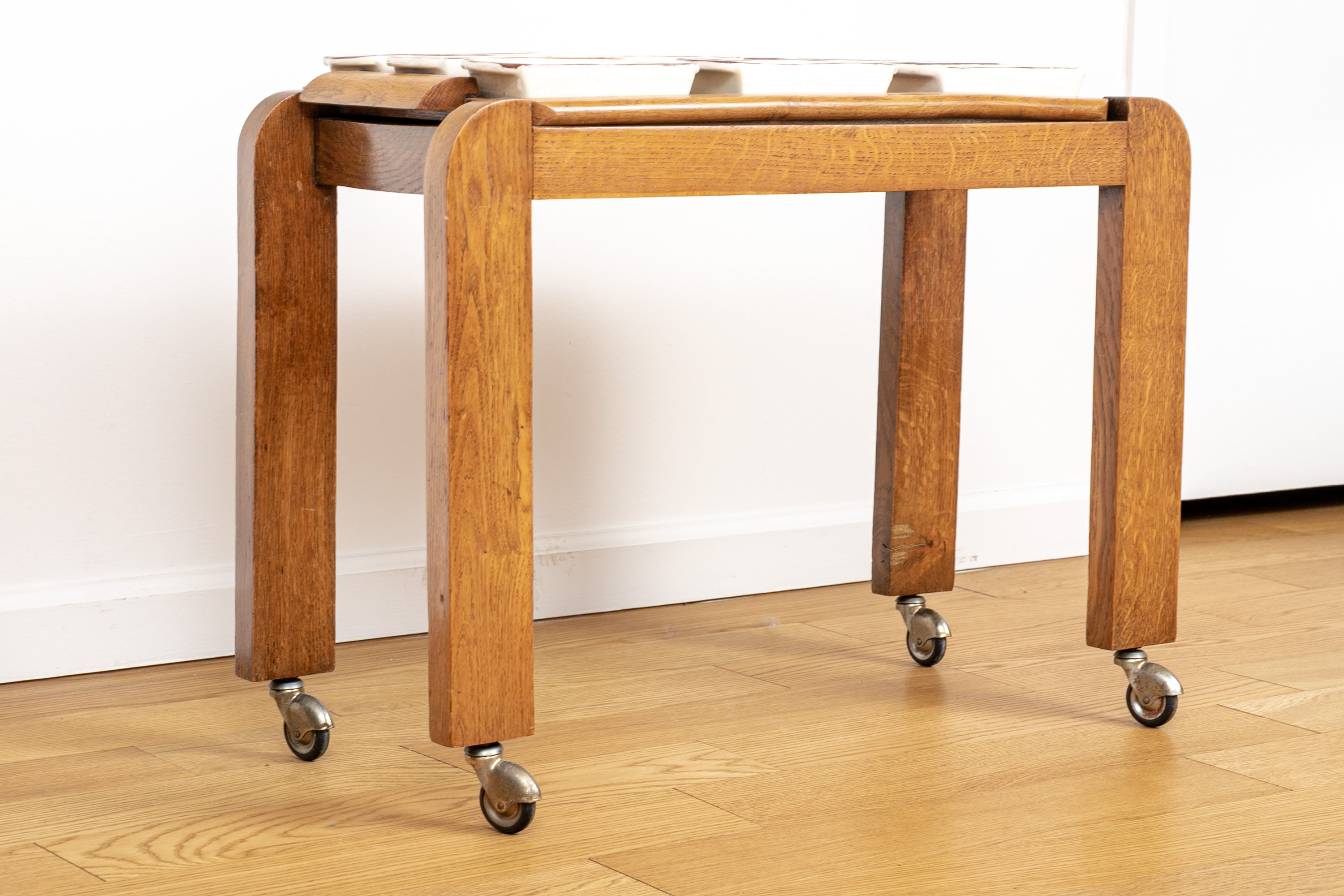 Early 20th century trolley fitted with hand painted French pottery dishes on a removable handled tray. The tray is fitted with 8 rectangular and 2 small round pottery dishes that nest into dark stained compartments. The tray lifts off to reveal a smooth dark stained surface. The trolley presents with straight legs and terminates with brass casters.