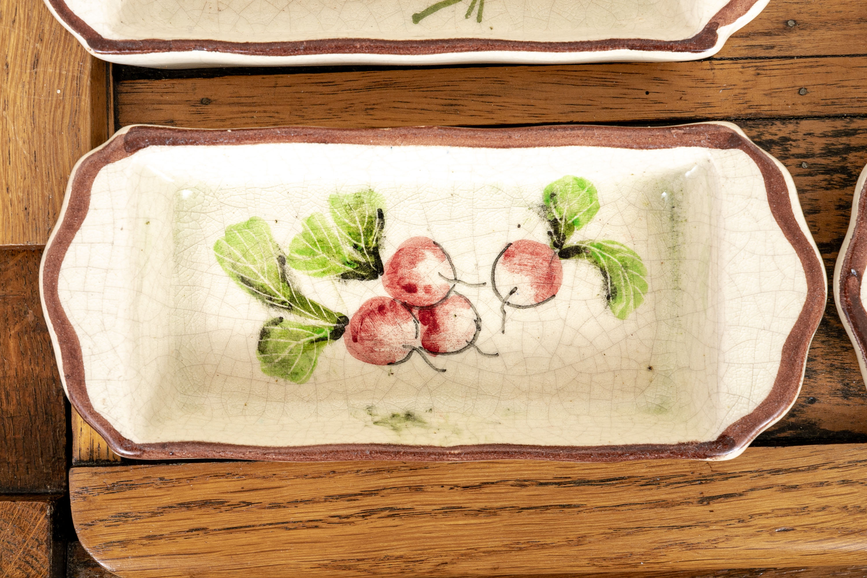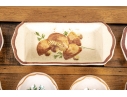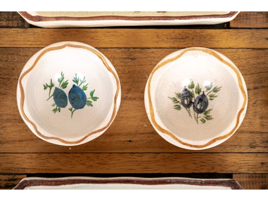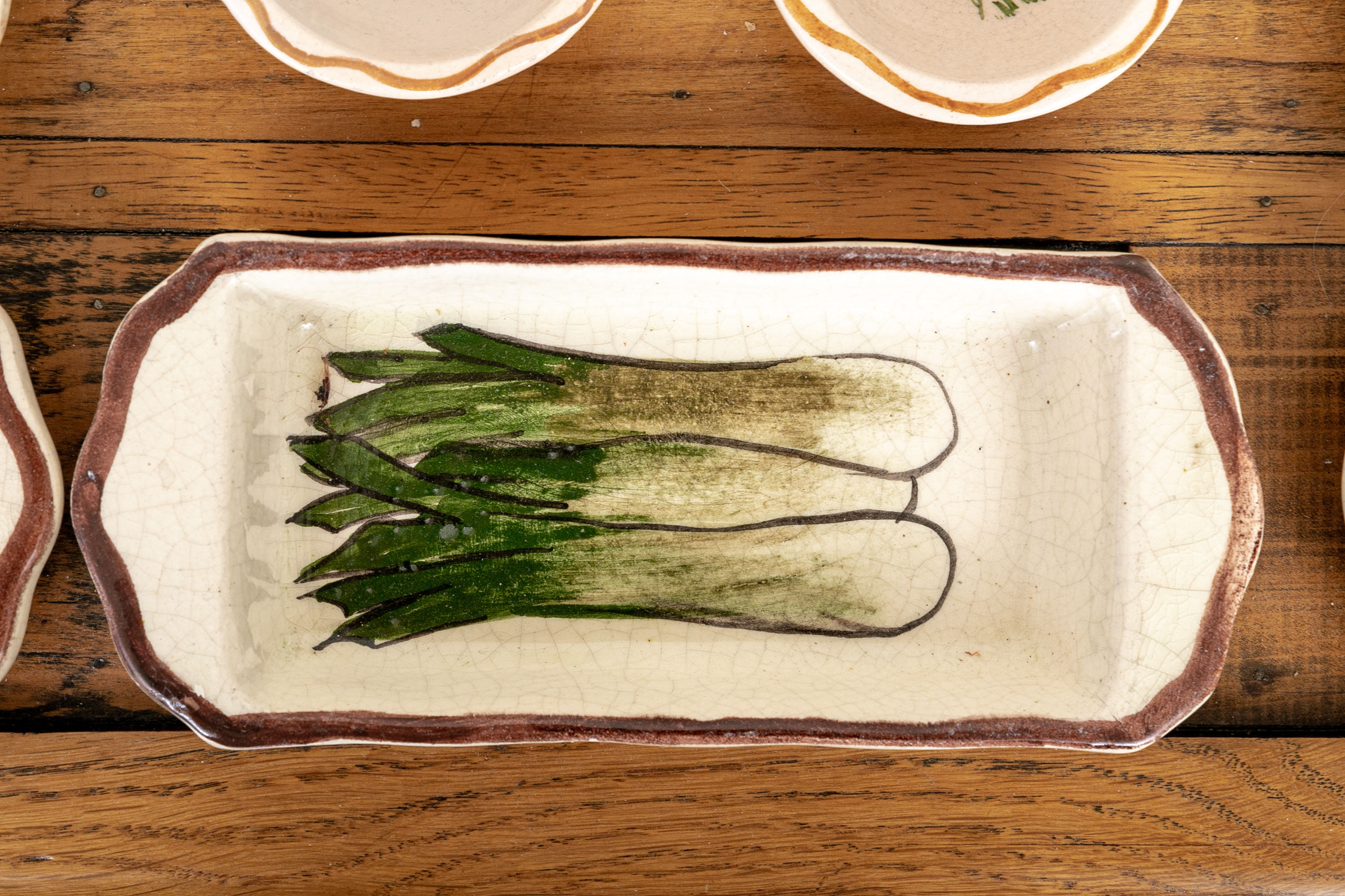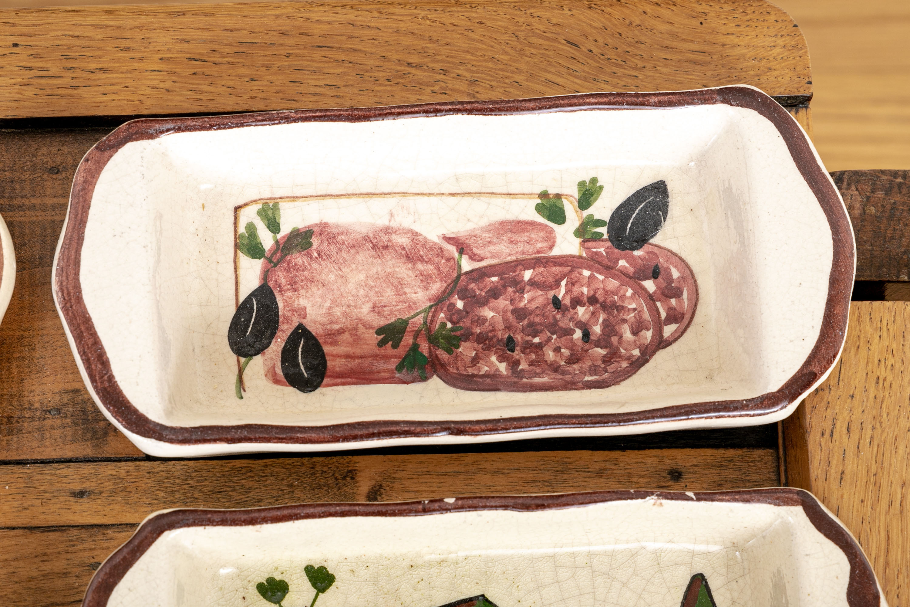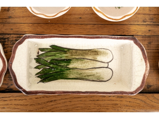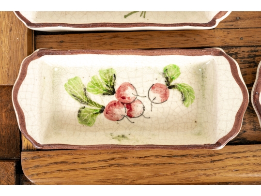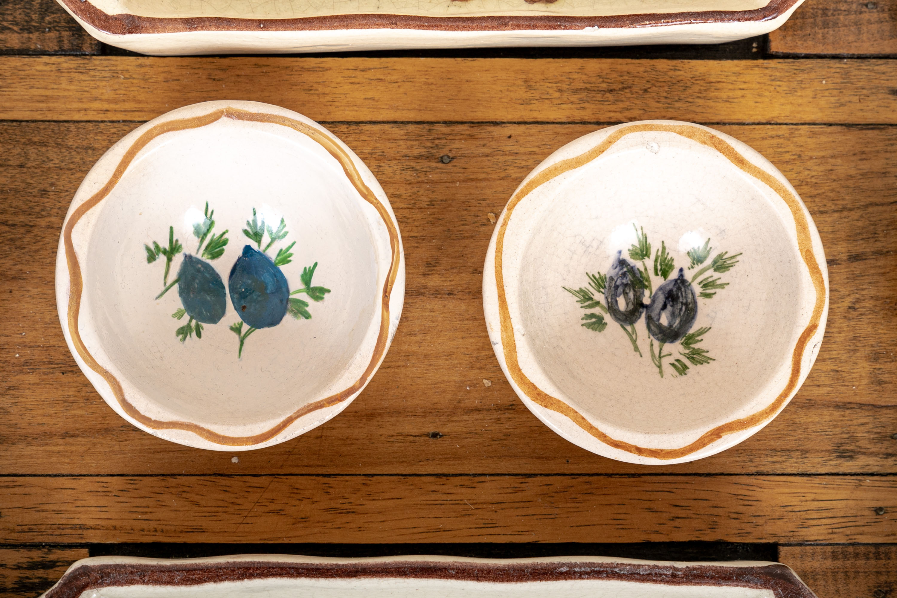 Early 20th century trolley fitted with hand painted French pottery dishes on a removable handled tray. The tray is fitted with 8 rectangular and 2 small round pottery dishes that nest into dark stained compartments. The tray lifts off to reveal a smooth dark stained surface. The trolley presents with straight legs and terminates with brass casters.