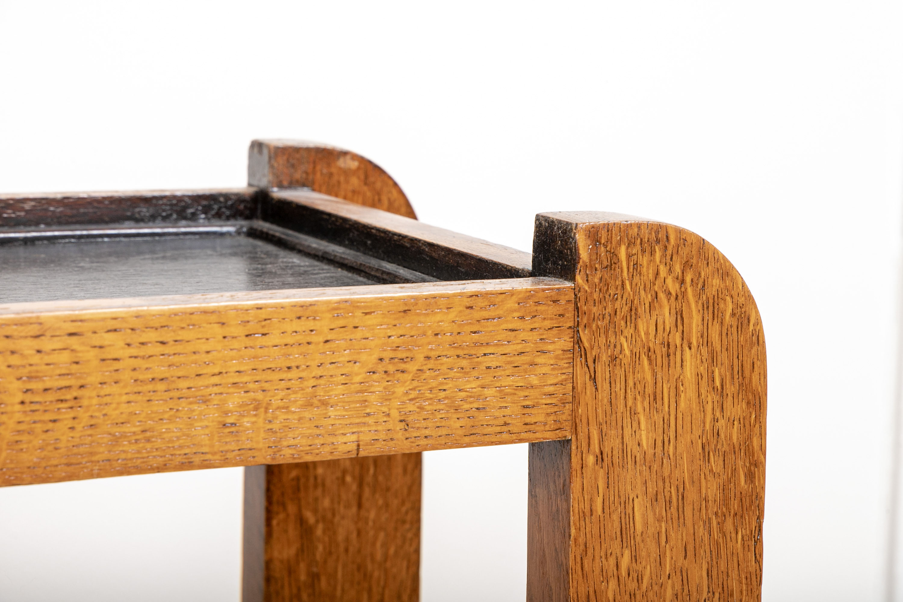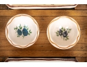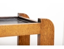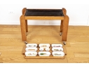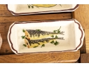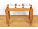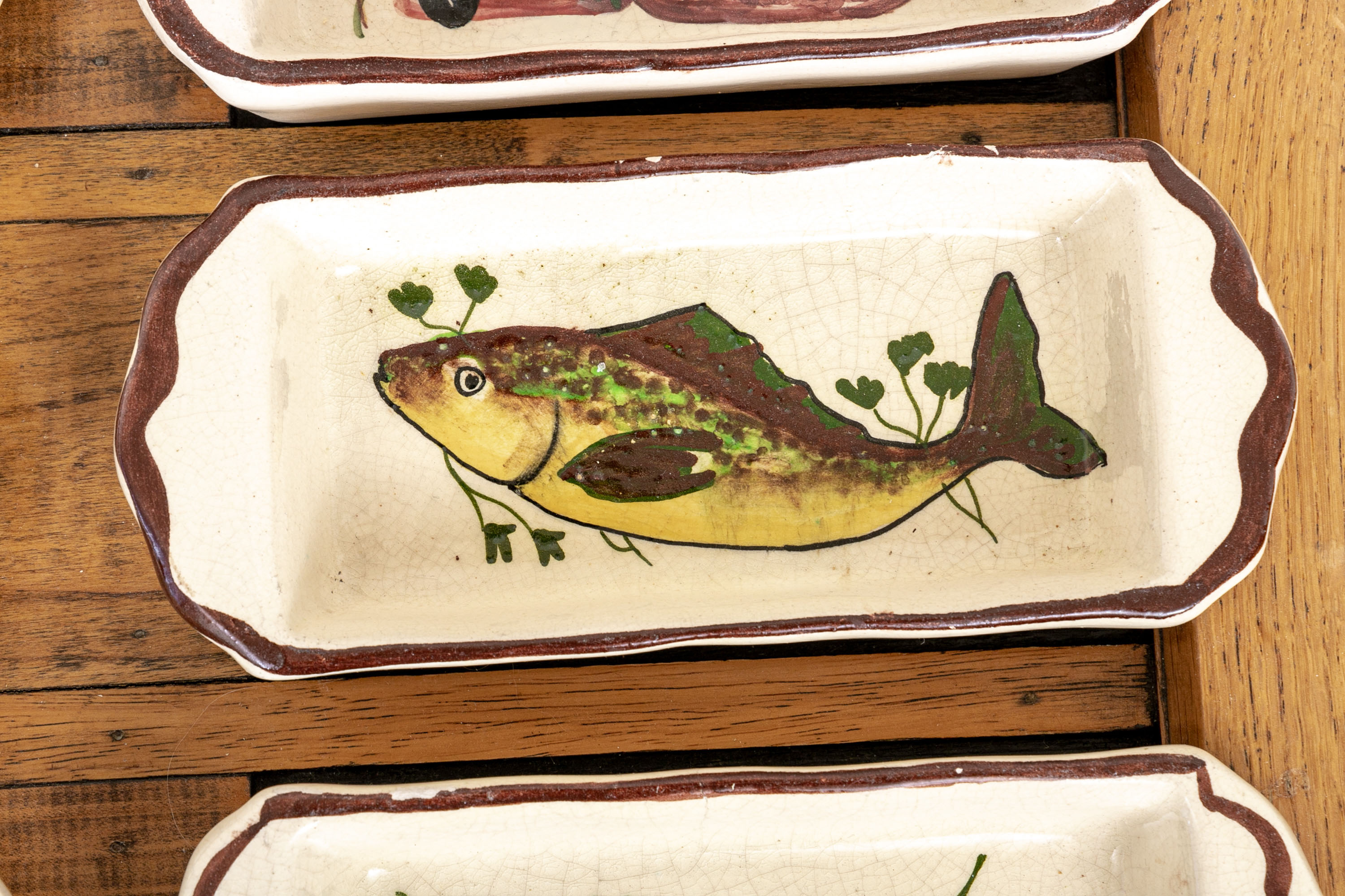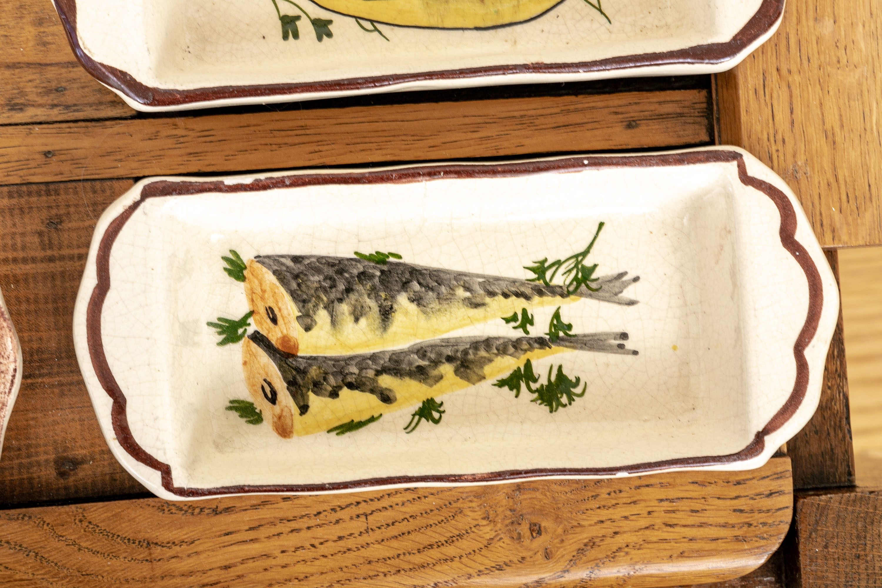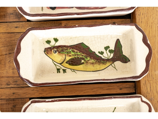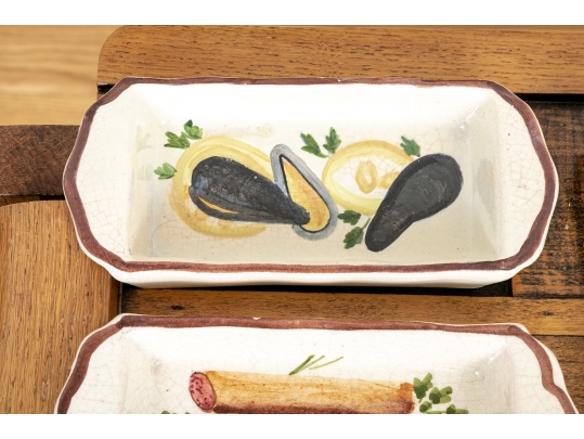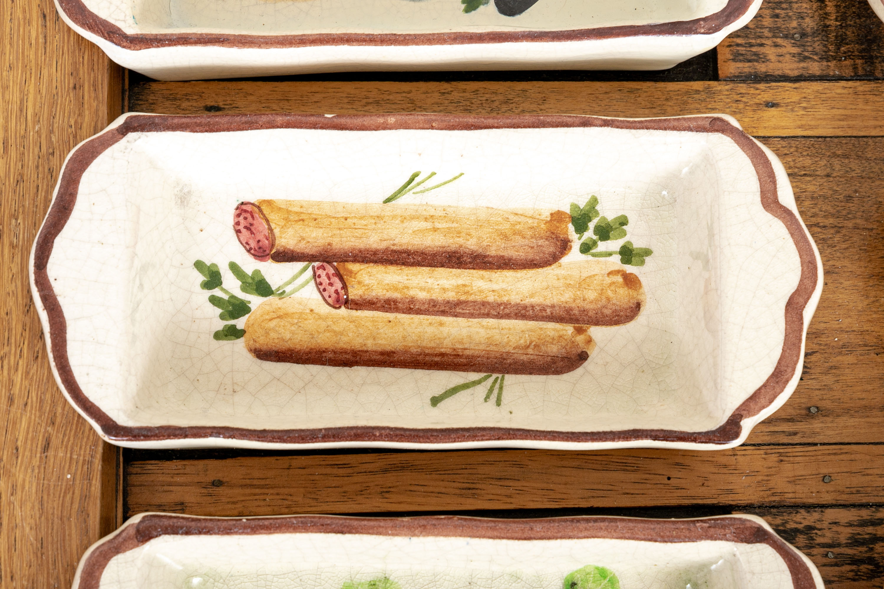 Early 20th century trolley fitted with hand painted French pottery dishes on a removable handled tray. The tray is fitted with 8 rectangular and 2 small round pottery dishes that nest into dark stained compartments. The tray lifts off to reveal a smooth dark stained surface. The trolley presents with straight legs and terminates with brass casters.