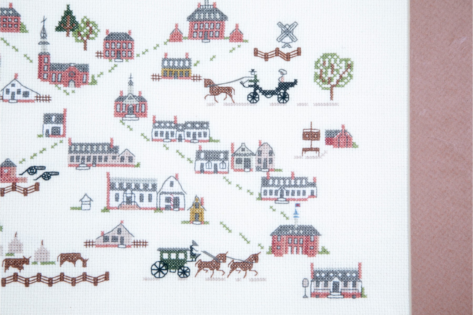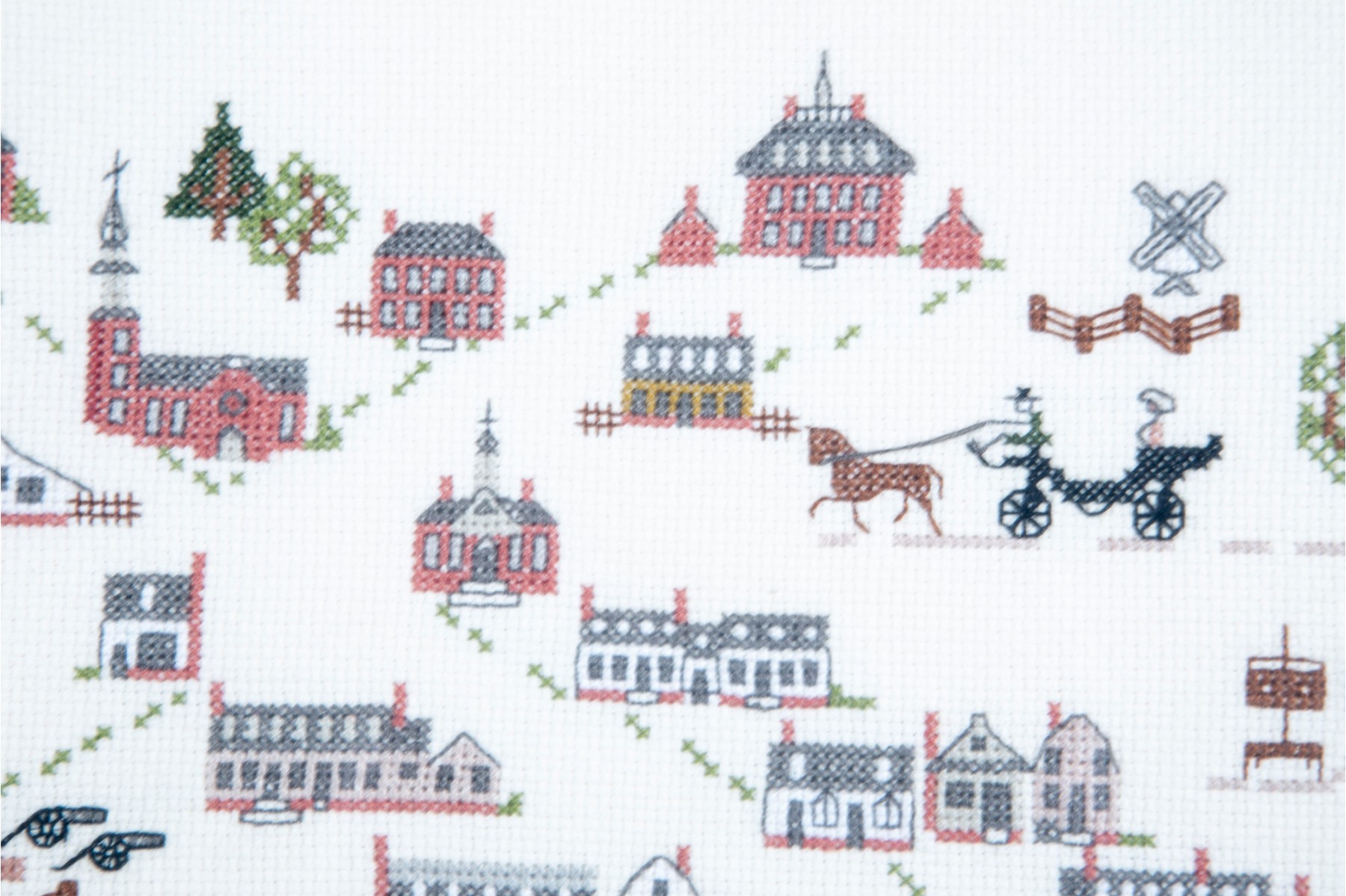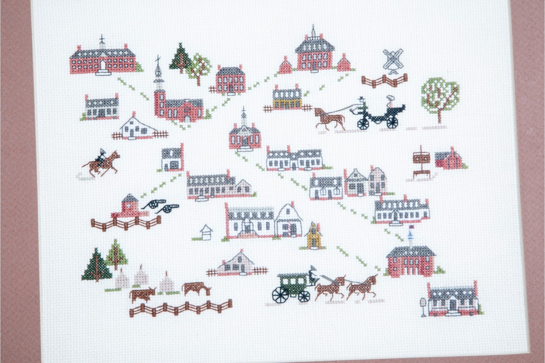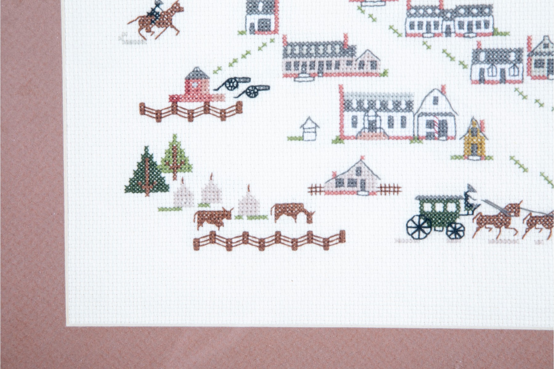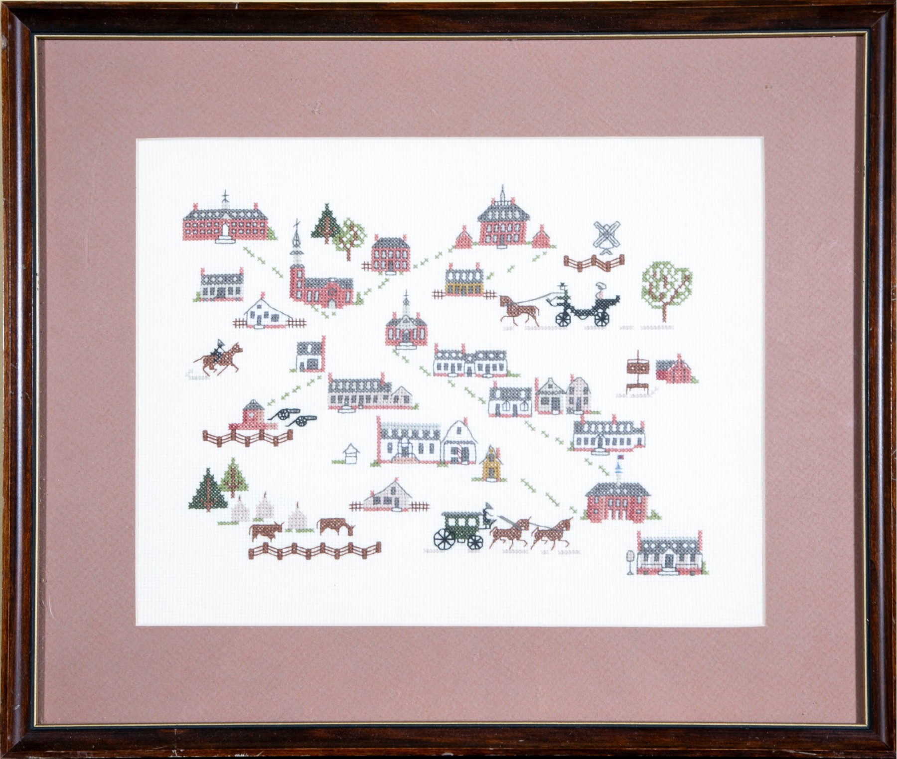 A framed cross-stitch textile artwork displaying various early American buildings and cottages. The embroidery is presented in a simple wood frame accented with a mat-border and faced with glass.
