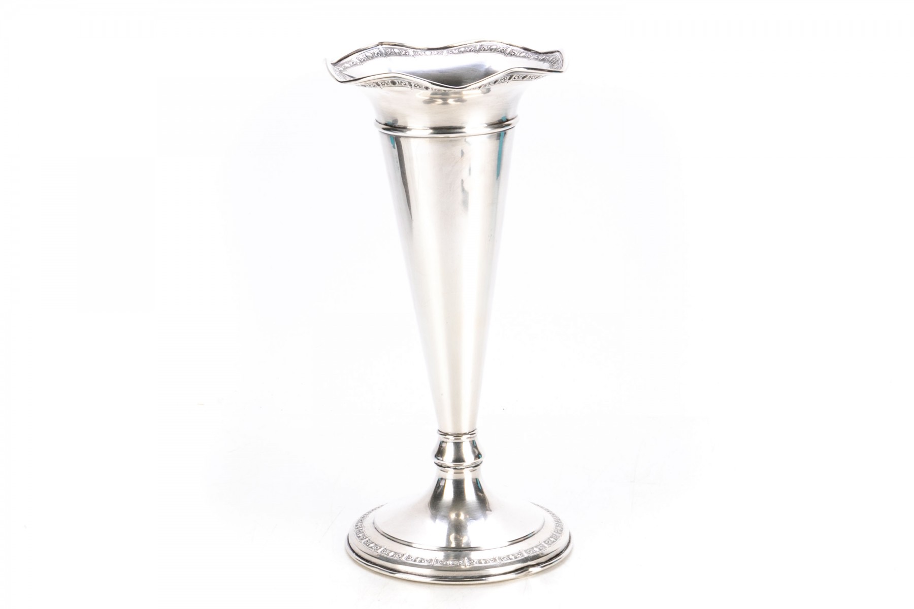 Early Gorham Weighted sterling trumpet vase. Fluted rim and base with repousee embellishment. Hallmarks verso.