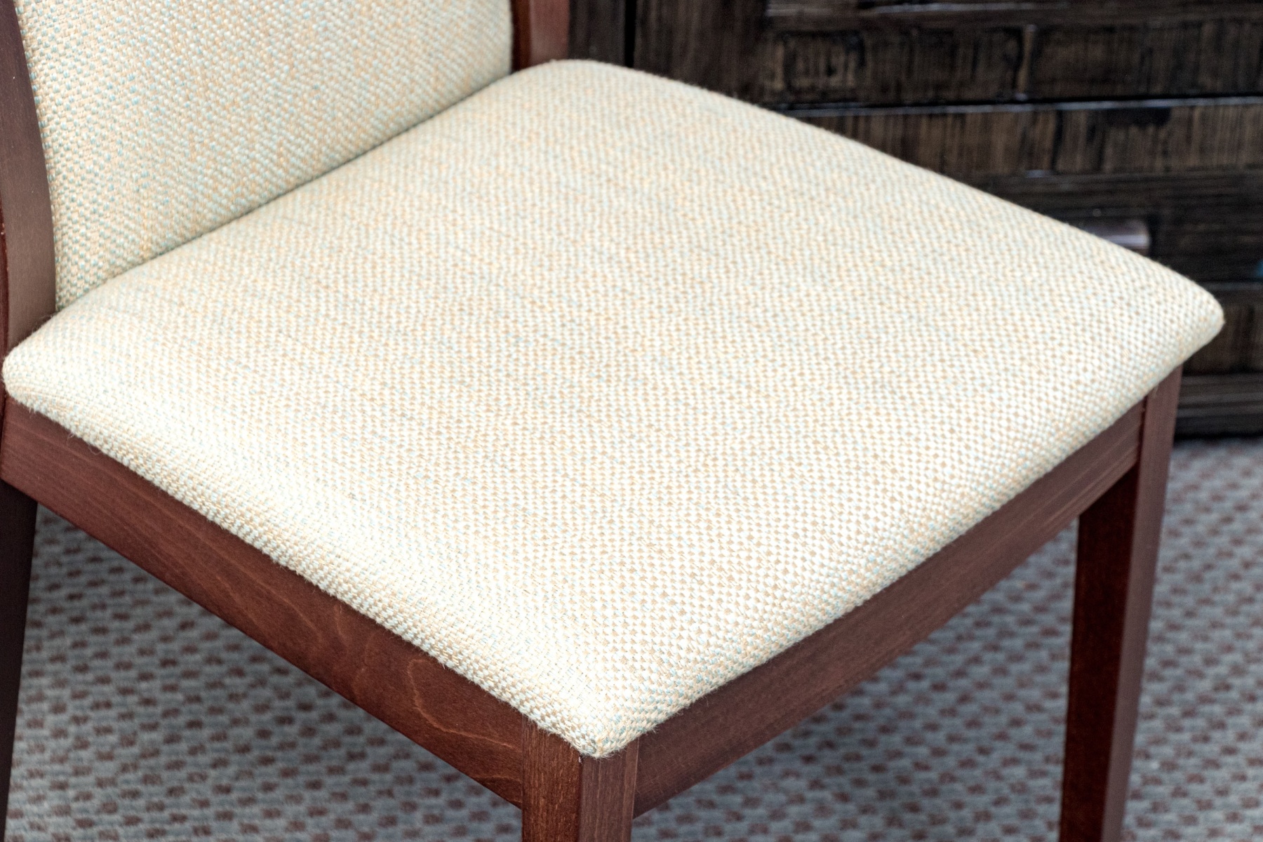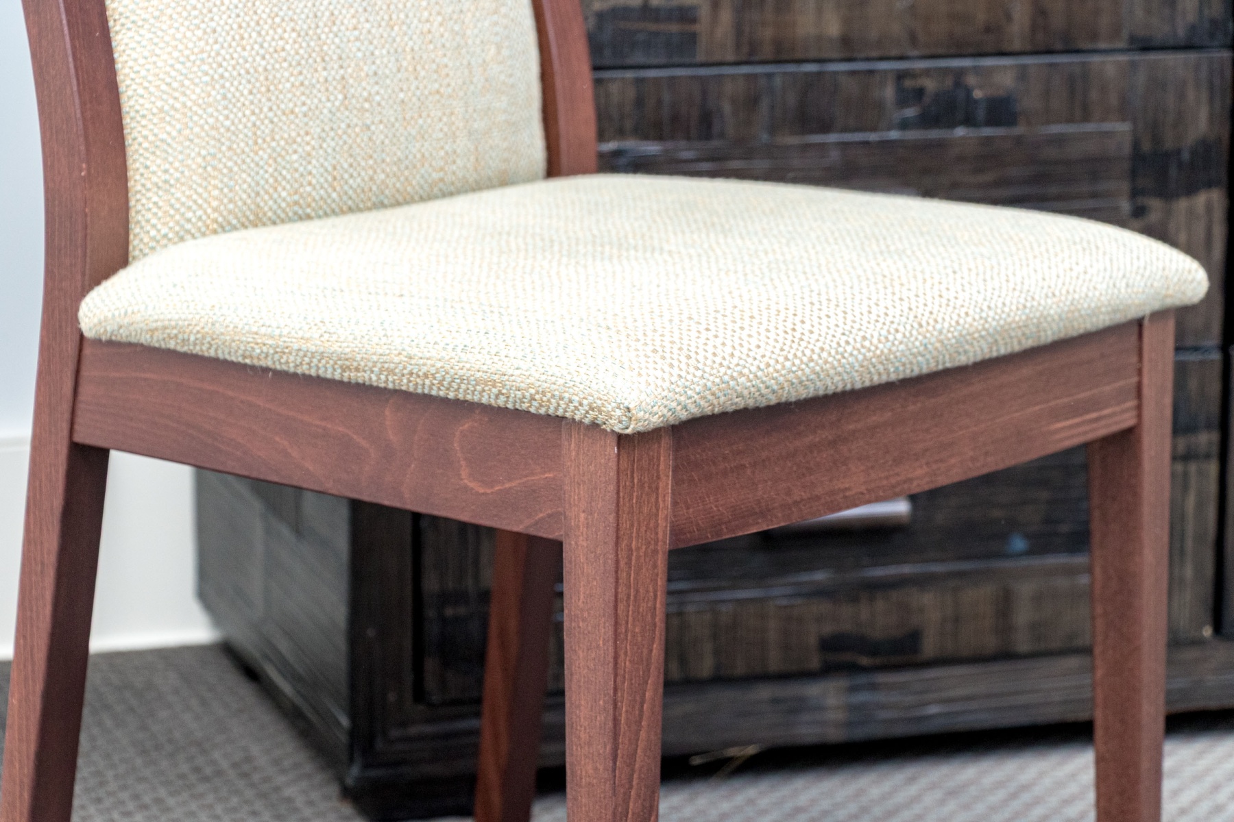 A wonderful East West Furniture "Lancy" accent chair with great modern Parson style, showcasing a sleek mahogany finished exposed wood frame and upholstered seat, seat back and seat back verso. The chair has elegant silhouette and comfortable seat, raised on front square tapered legs and square tapered splayed back legs.