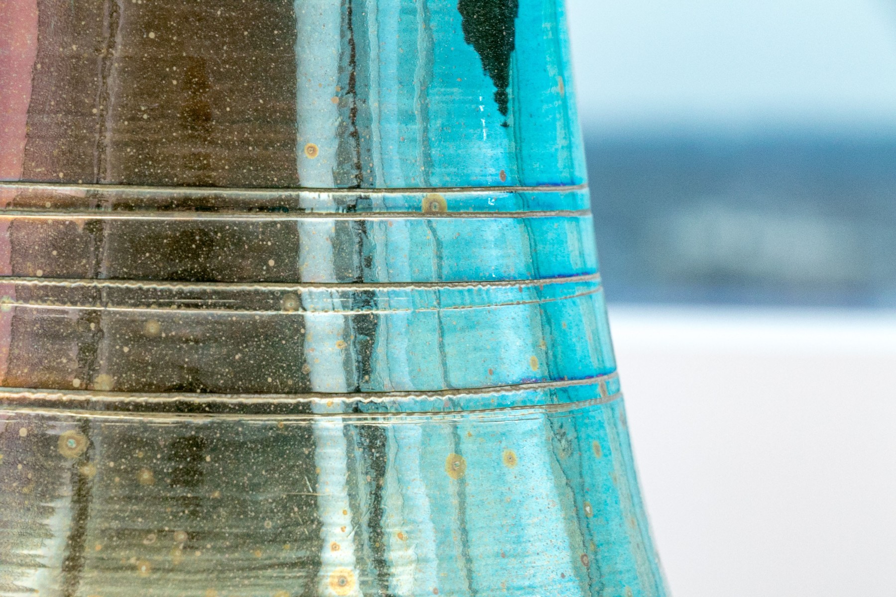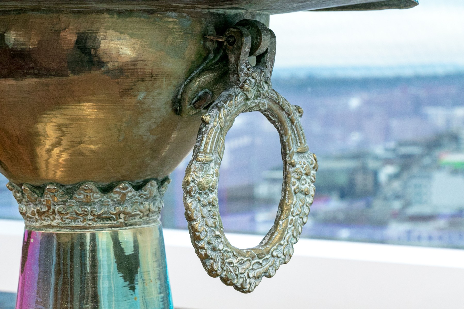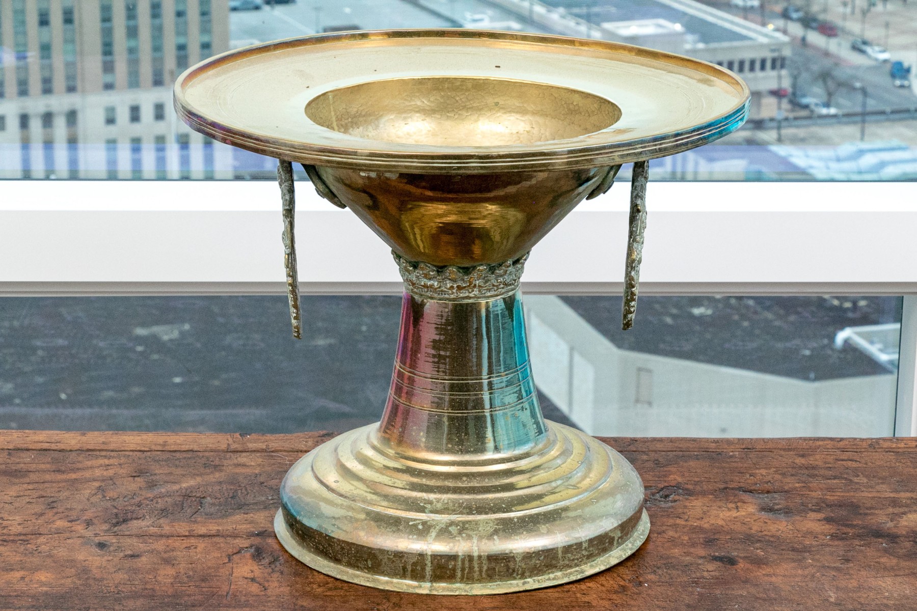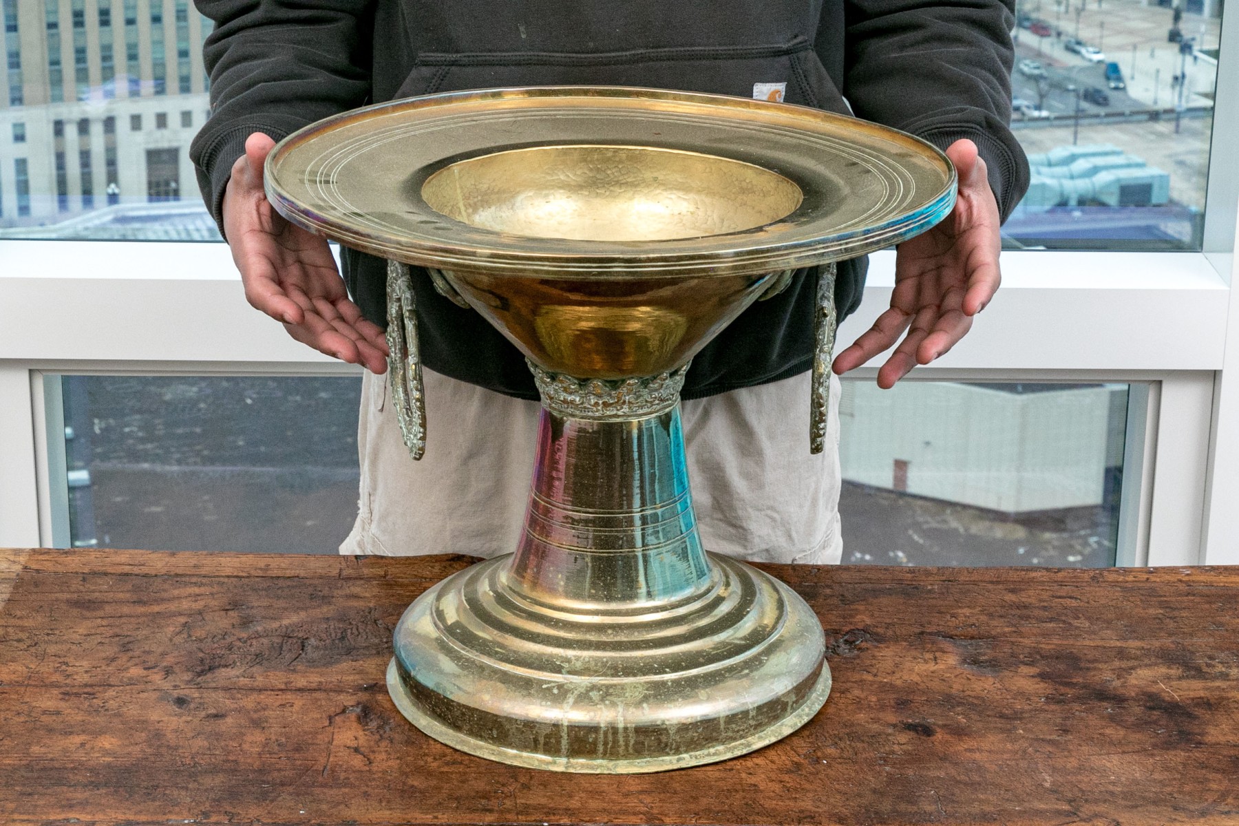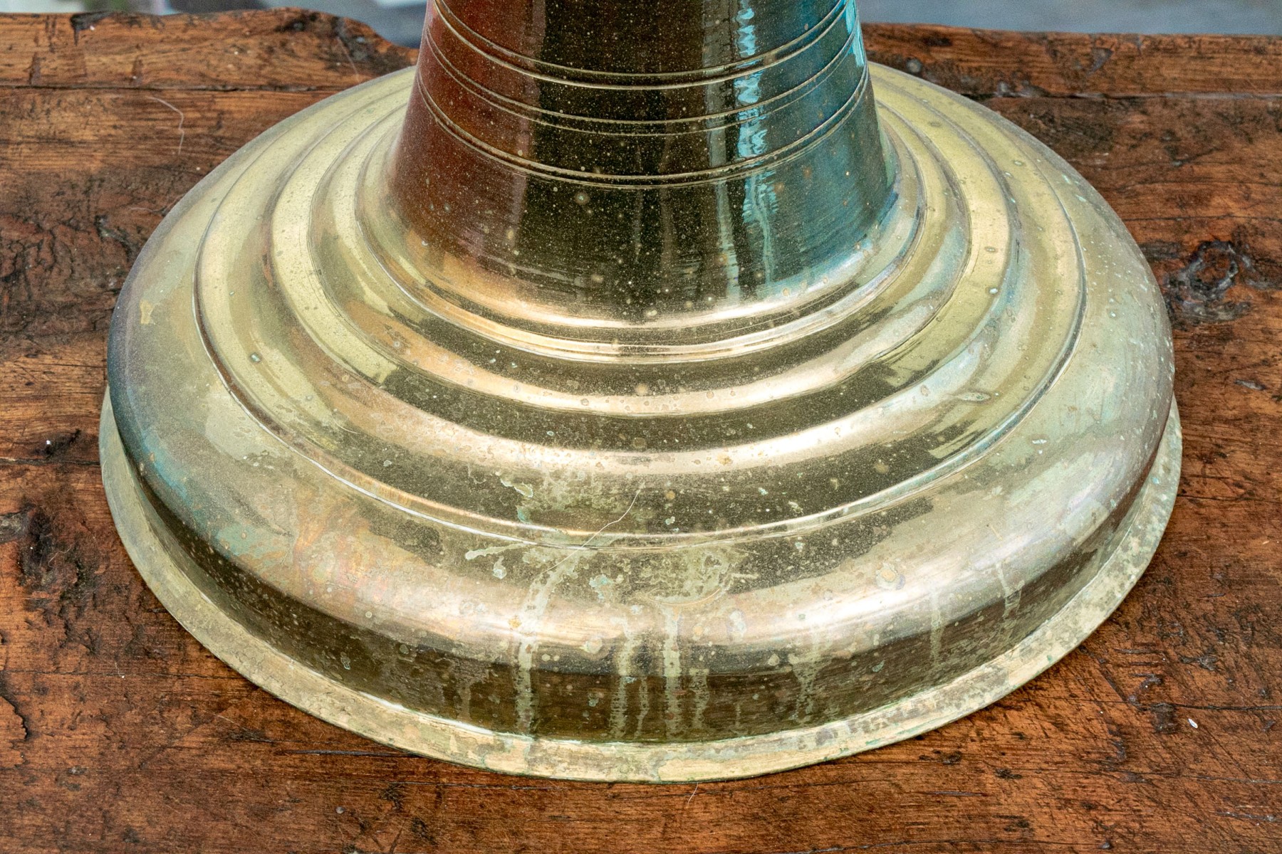 Condition: verdigris on the join and handles and inside the bowl, spots on the base. It stands slightly off center. Please review the photos as they are part of the condition report,