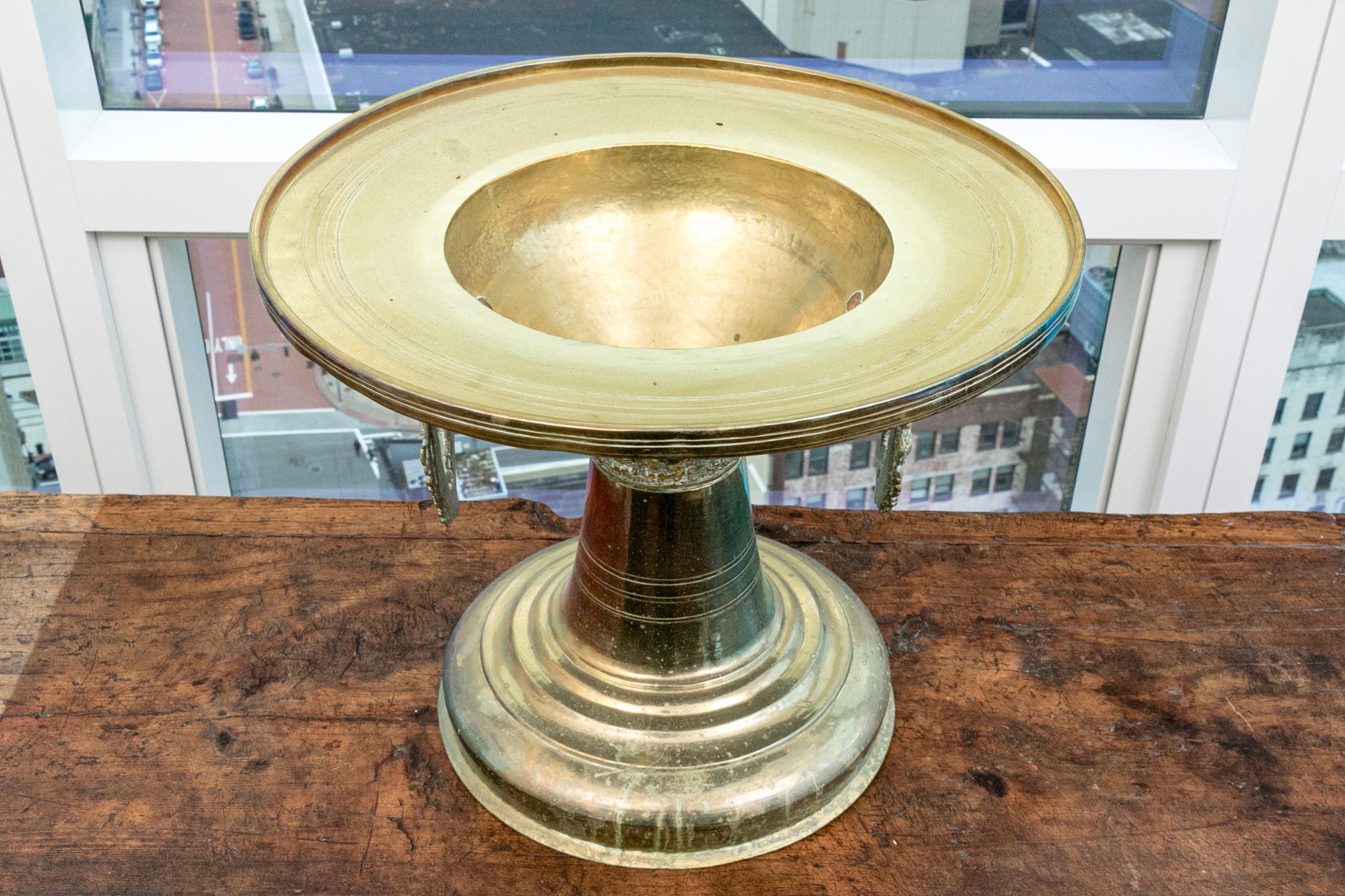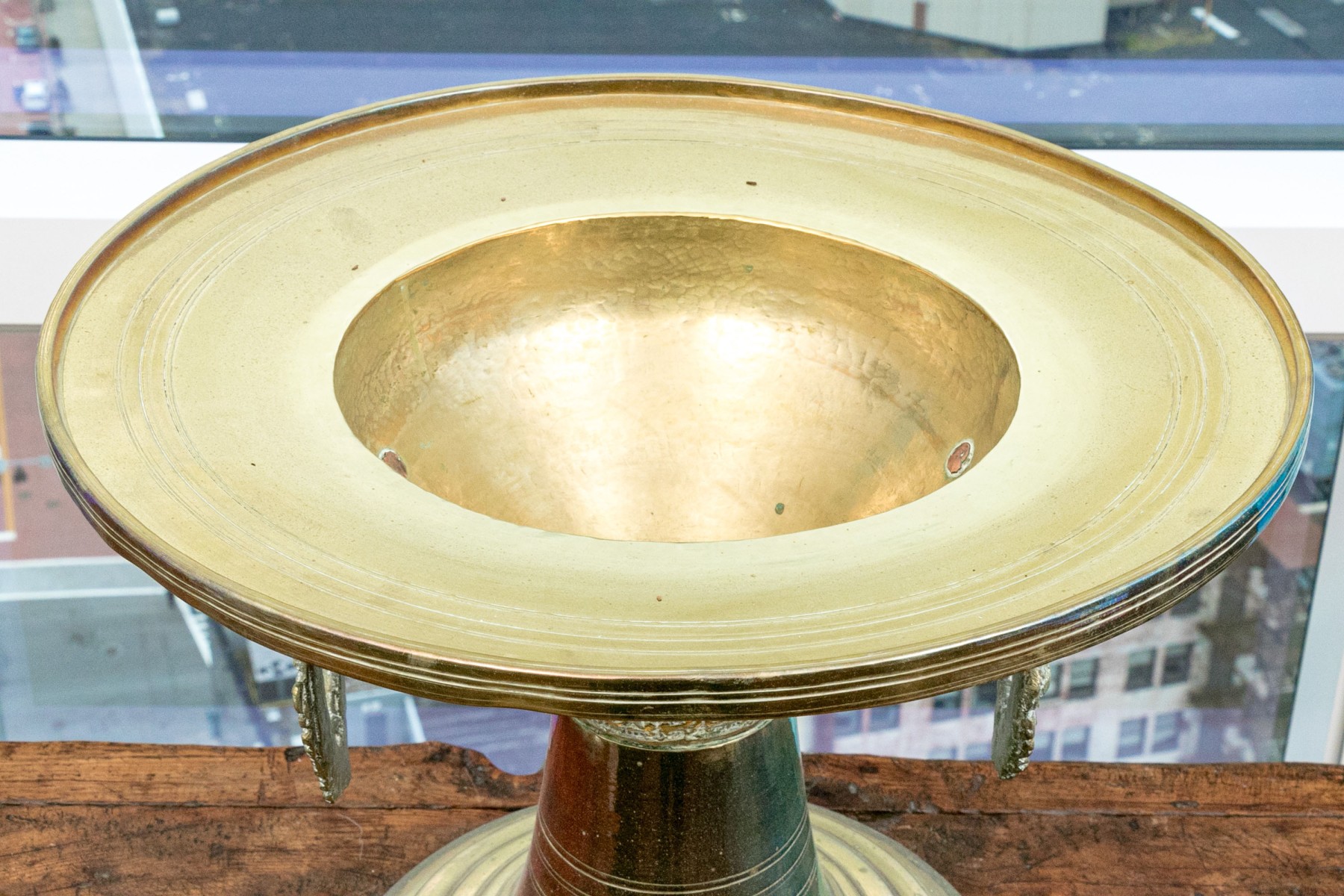 A brass stand with a deep bowl form top and textured serrated join for the top on the support. With twin foliate decorated ring handles. Mounted on a tiered circular base.