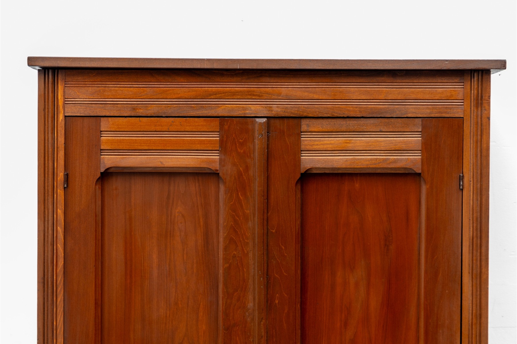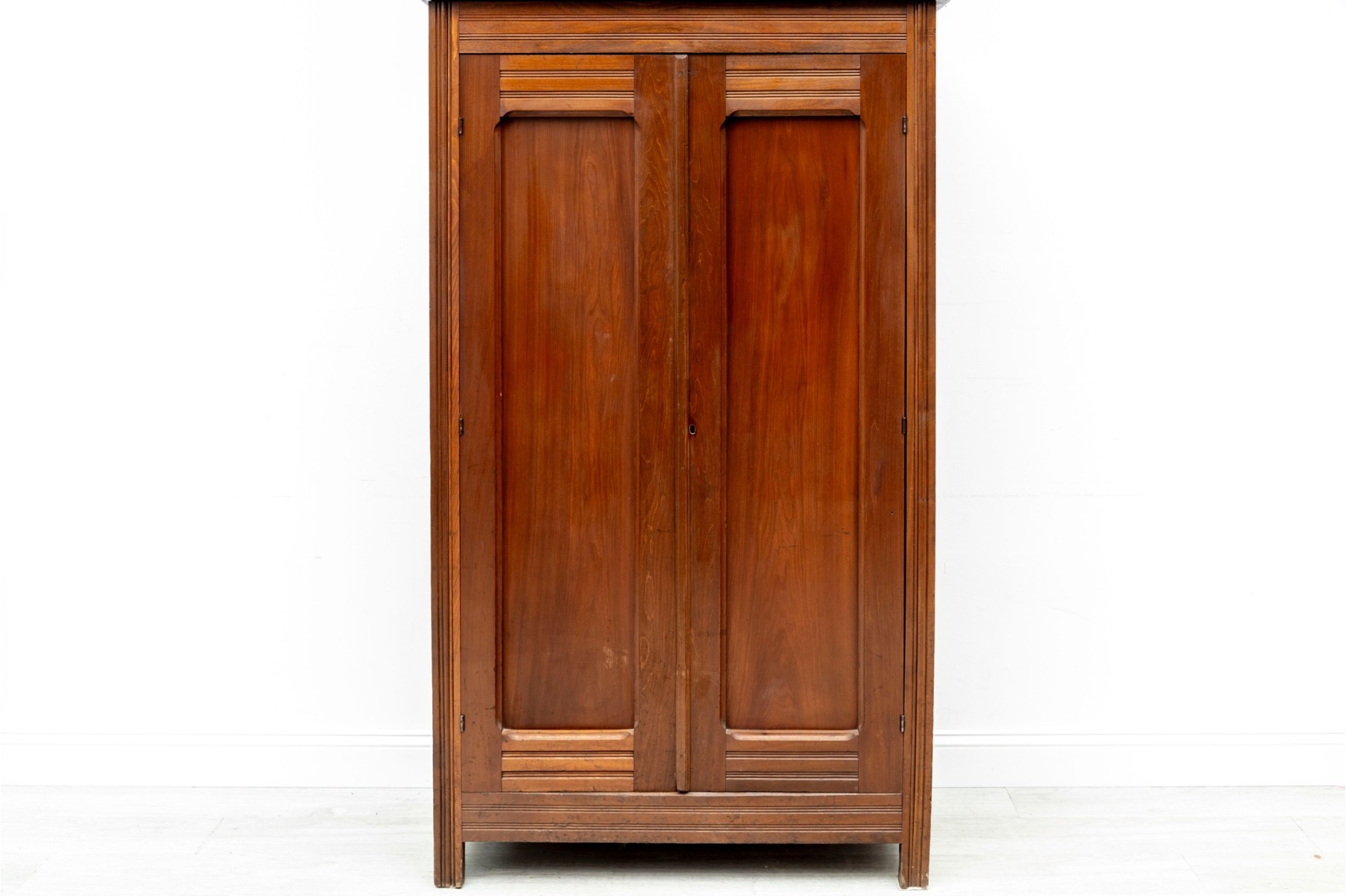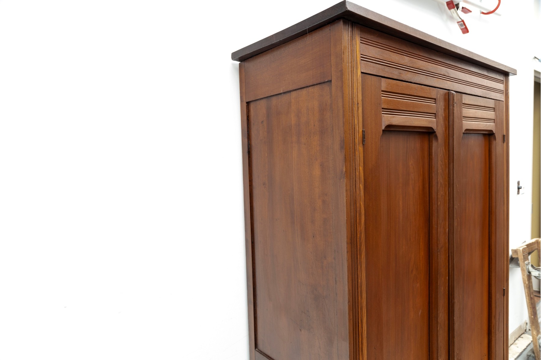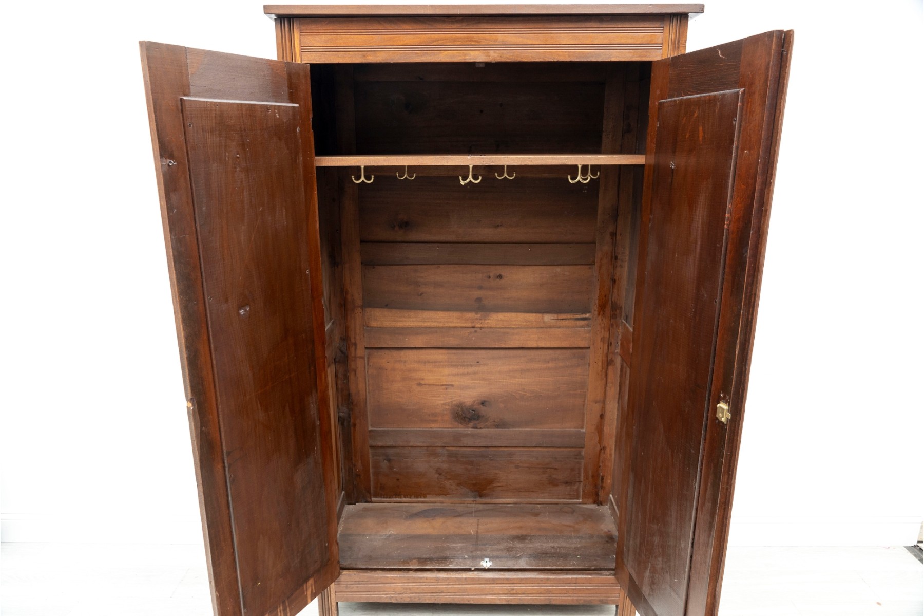An large wood wardrobe in the style of Eastlake. The large cabinet doors open up to a coat hanger rack shelf with ample space for more.