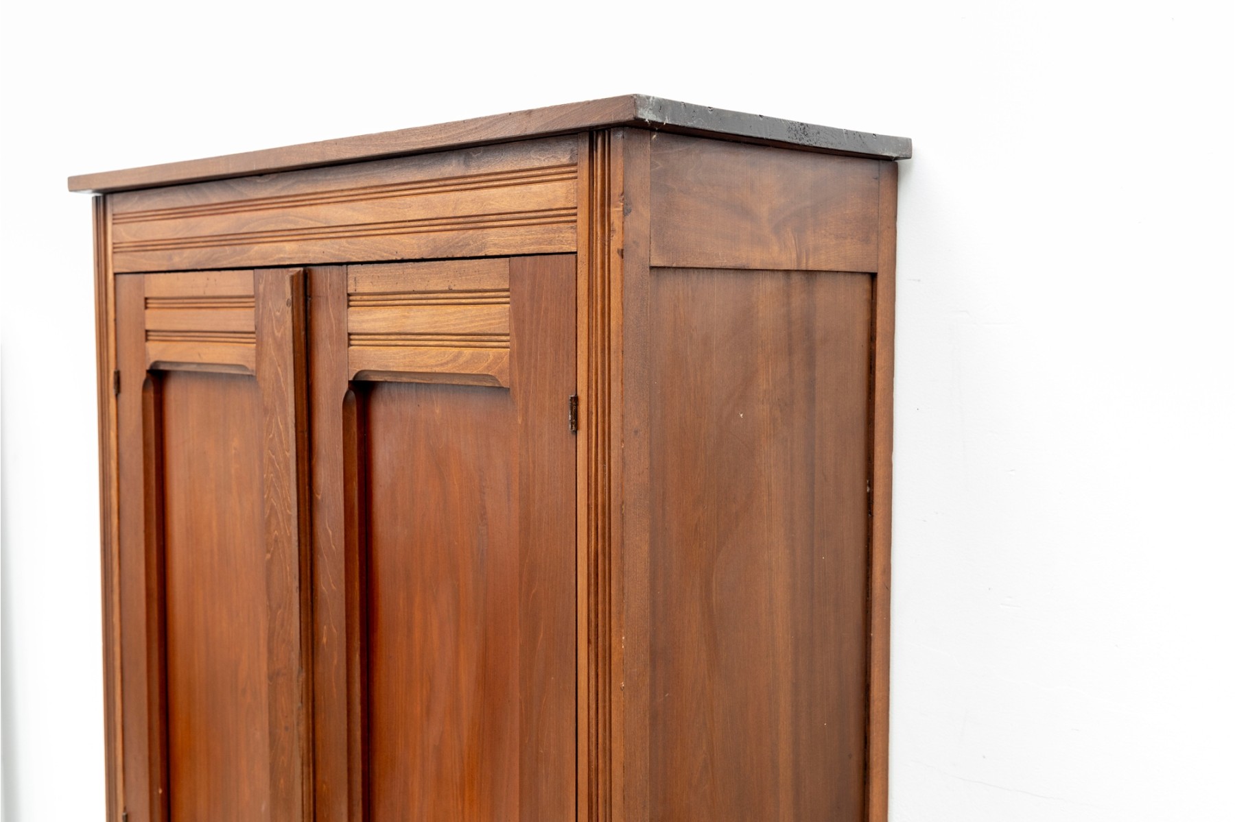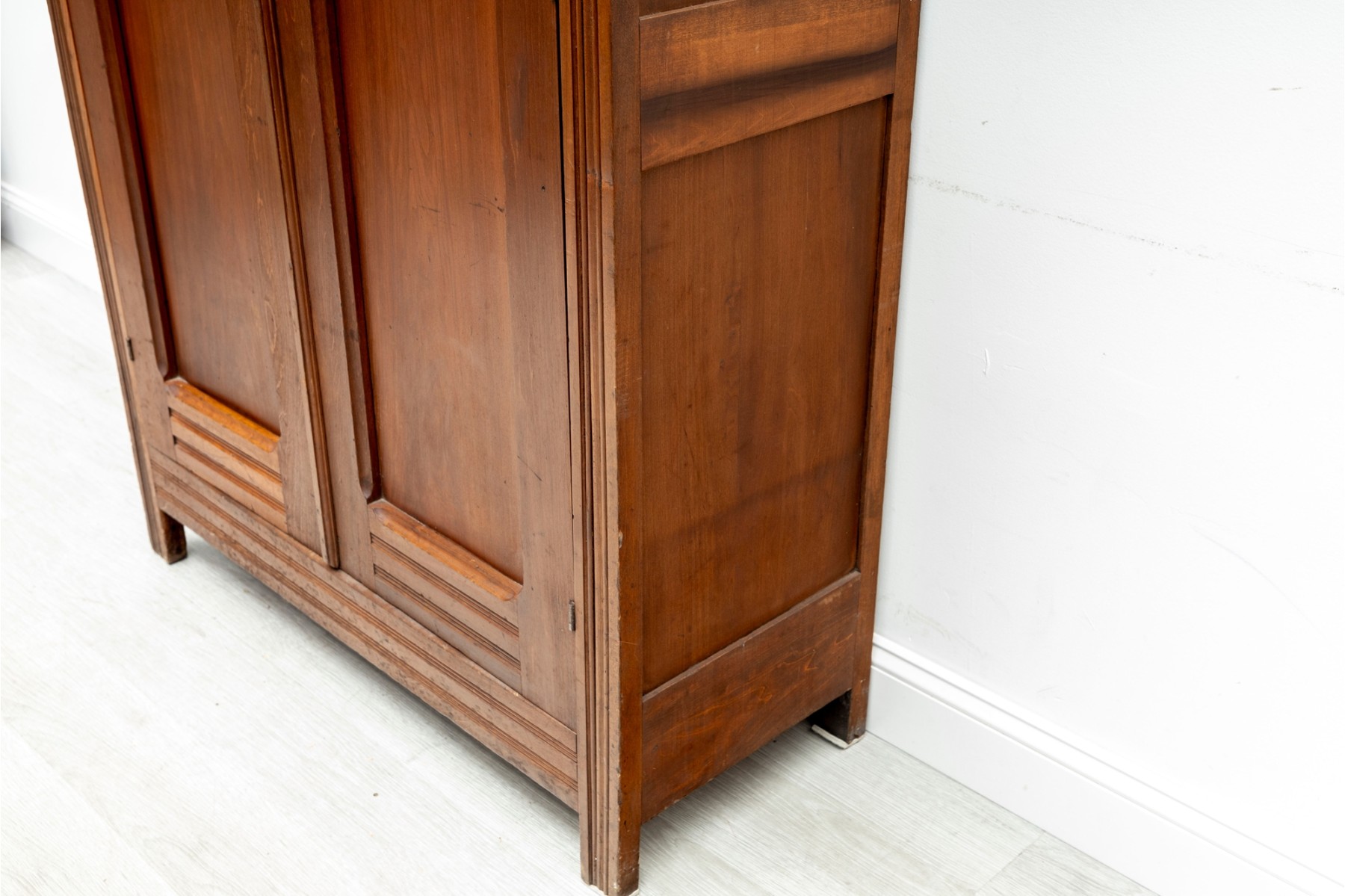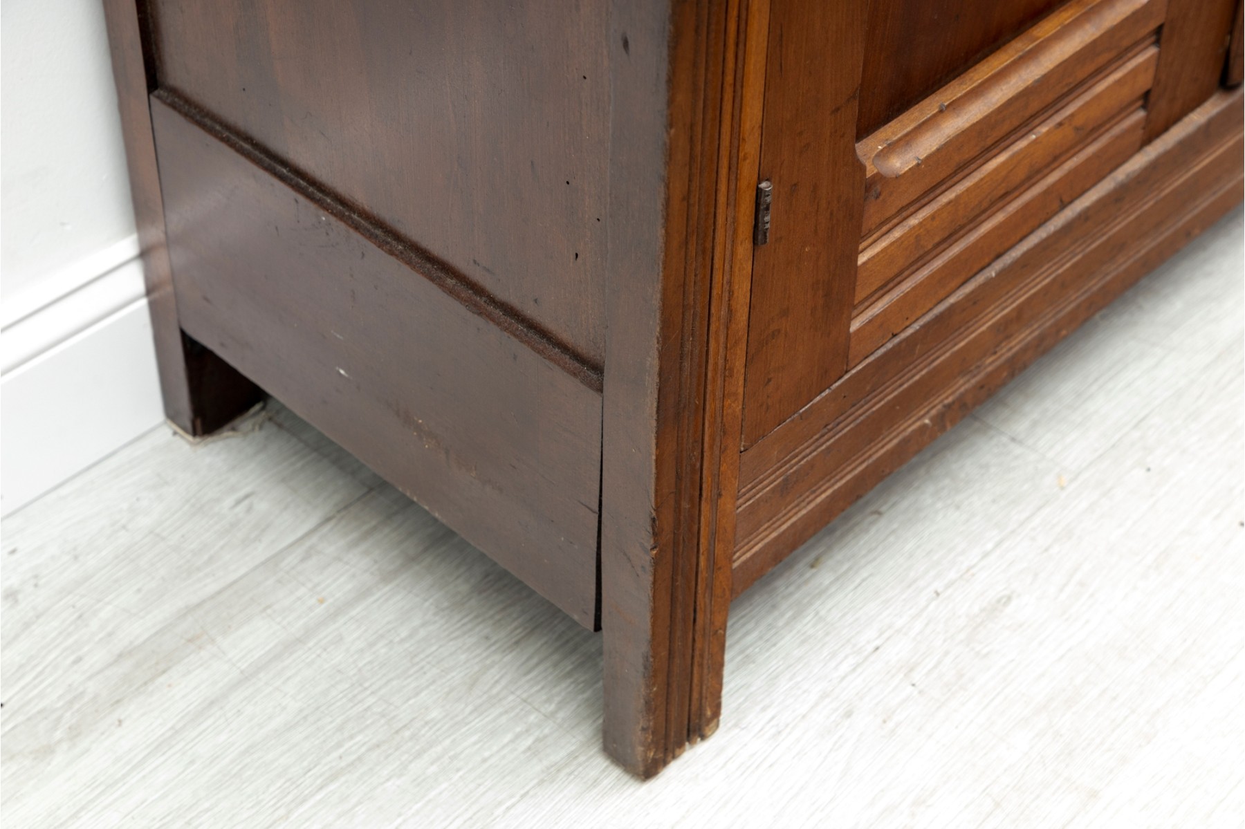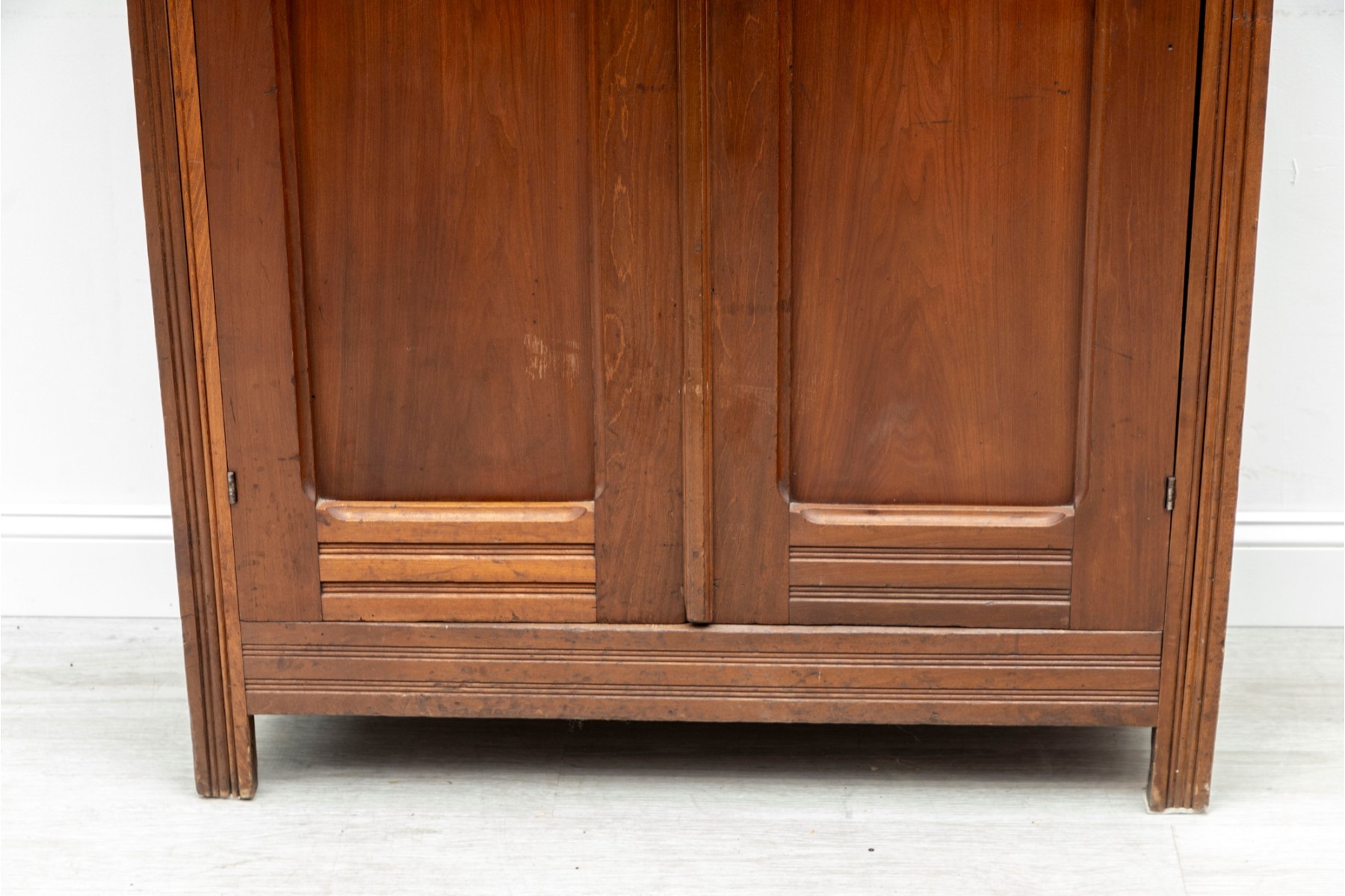 An large wood wardrobe in the style of Eastlake. The large cabinet doors open up to a coat hanger rack shelf with ample space for more.
