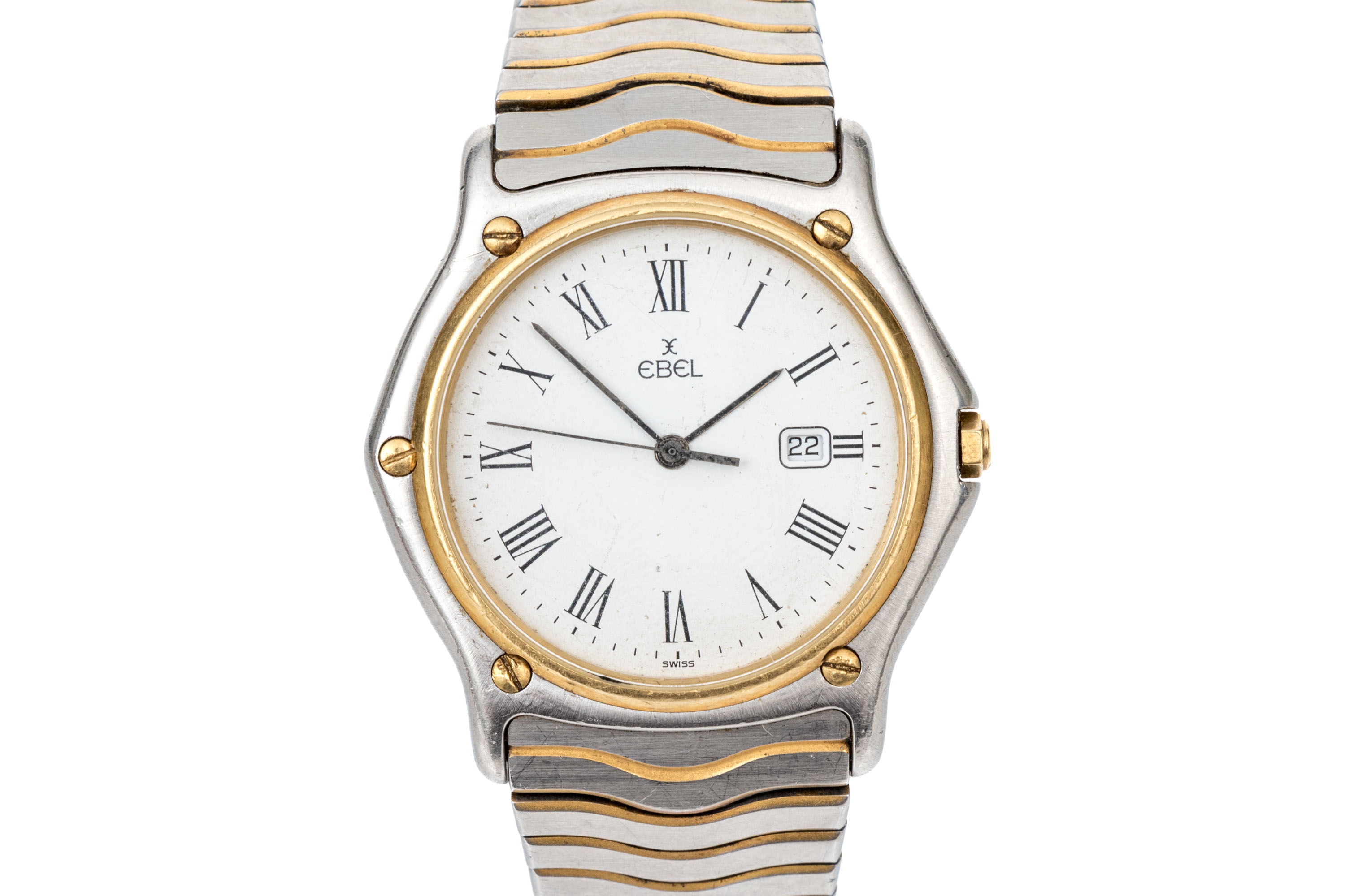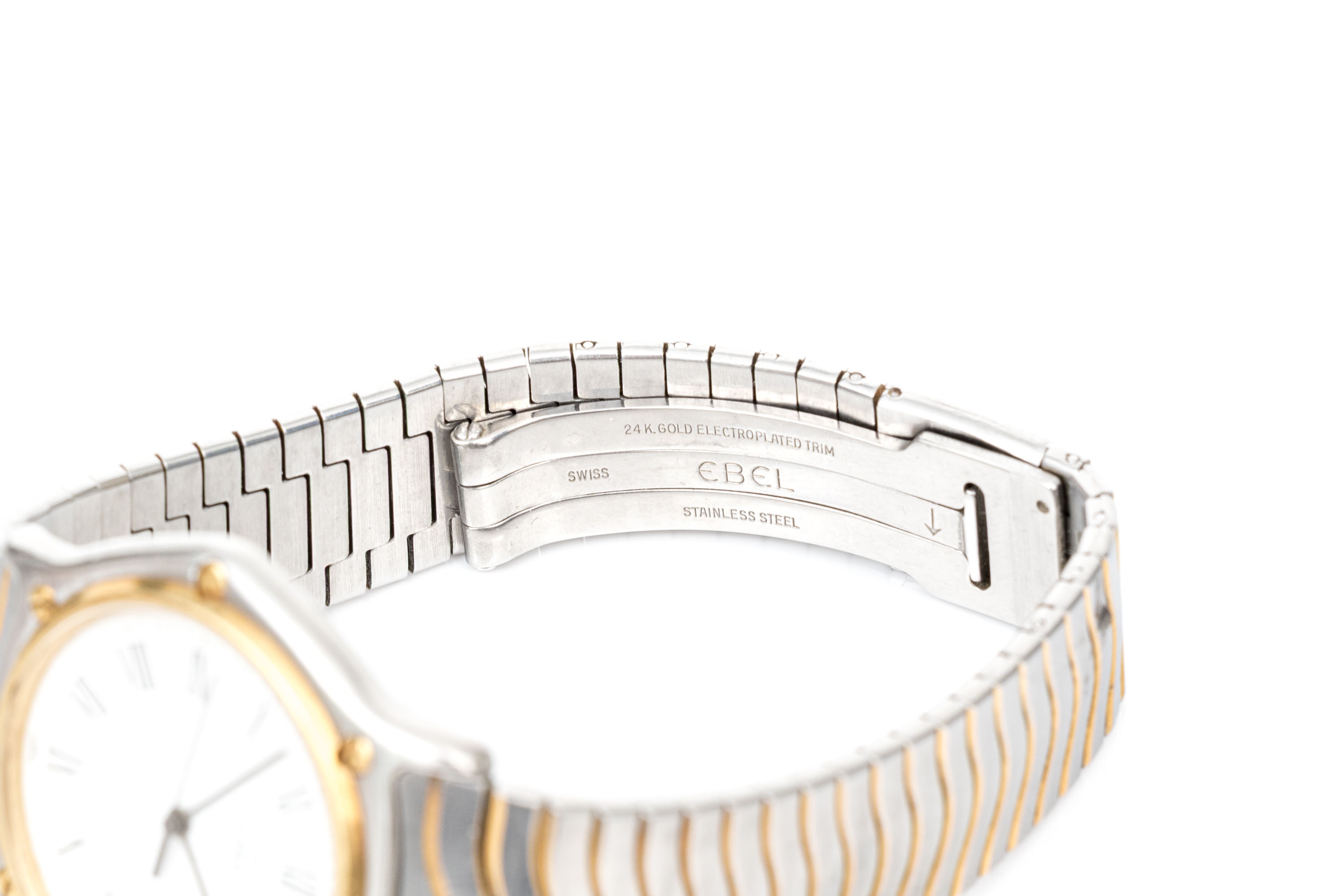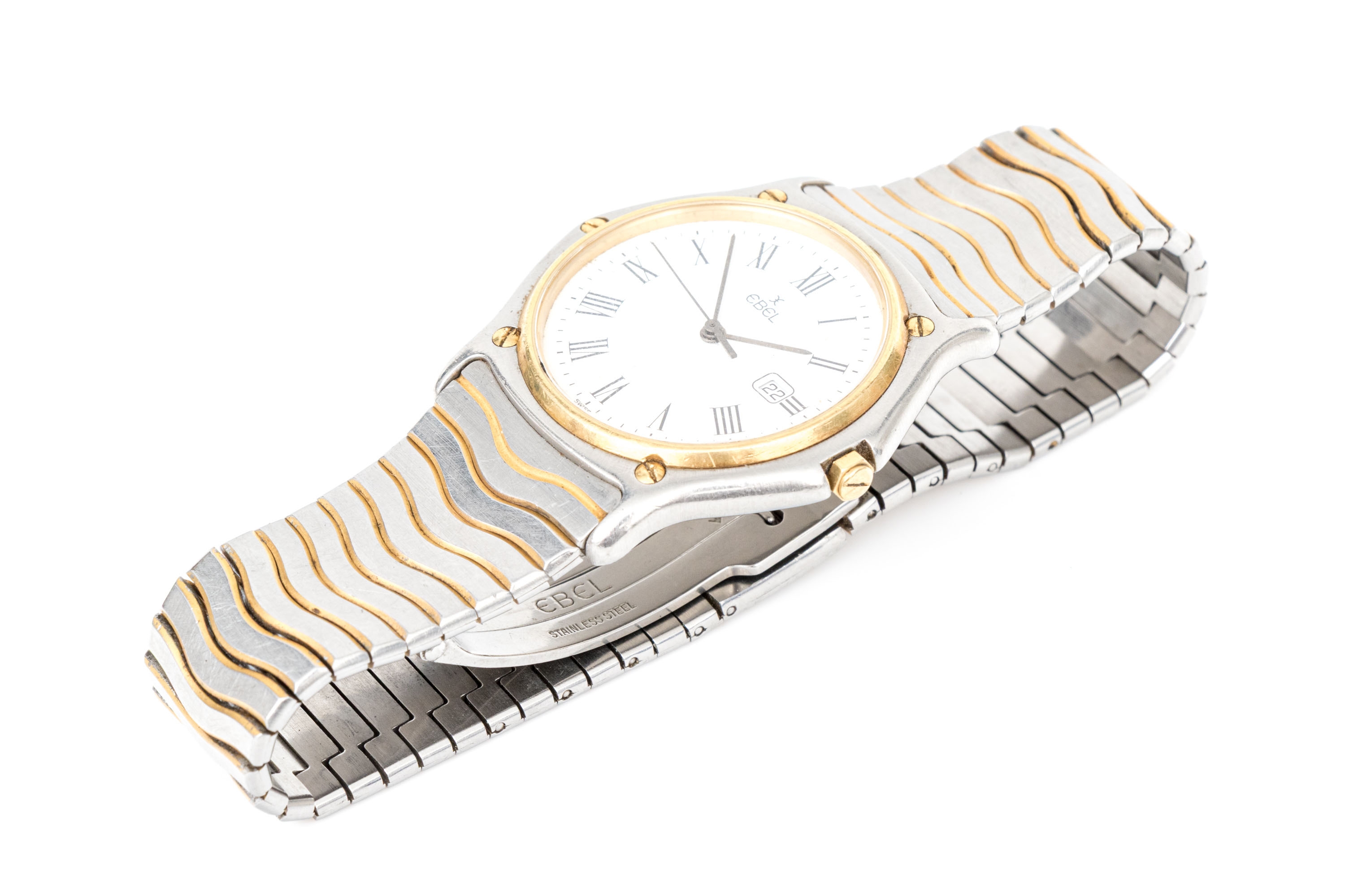 Ebel stainless steel vintage 34mm Sport Classic quartz watch, in stainless steel with a yellow gold crown and bezel, white roman dial and finished with a classic style bracelet.